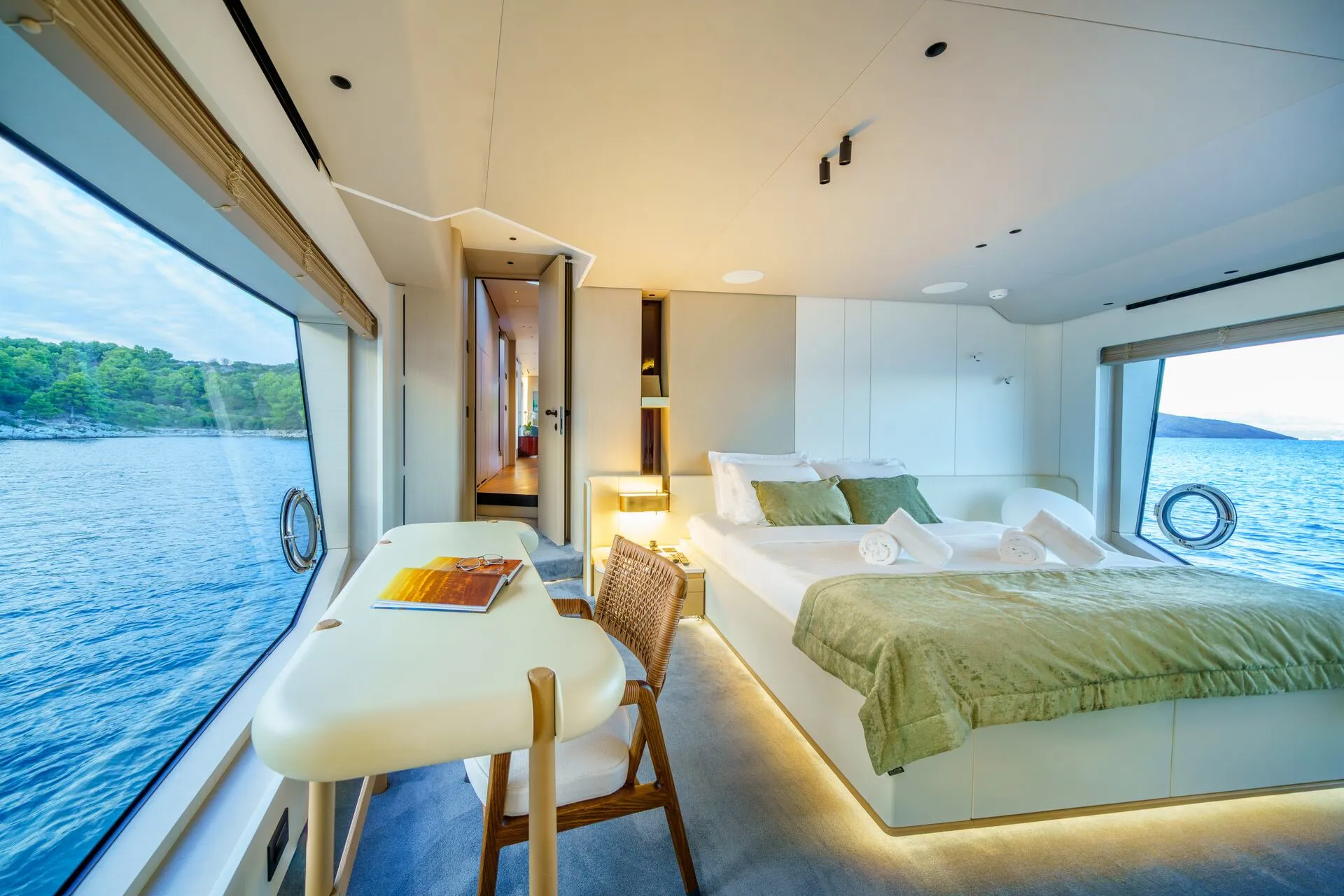 All’interno, Viva II rivela un’atmosfera calma e contemporanea, plasmata dalle tonalità morbide, dalle linee scultoree e dai volumi splendidamente bilanciati tipici di Salvagni Architetti. La luce naturale riempie il salone principale, creando un ambiente sereno per cenare o rilassarsi. Gli alloggi per gli ospiti includono una suite armatoriale sul ponte principale, due cabine doppie, una cabina twin e una cabina convertibile sottocoperta, ospitando comodamente fino a dieci ospiti. Ogni spazio è stato strategicamente progettato per garantire privacy e tranquillità, riecheggiando la raffinatezza dei superyacht più grandi. Servizi moderni come Wi-Fi e controllo del clima assicurano un’esperienza a bordo senza interruzioni.