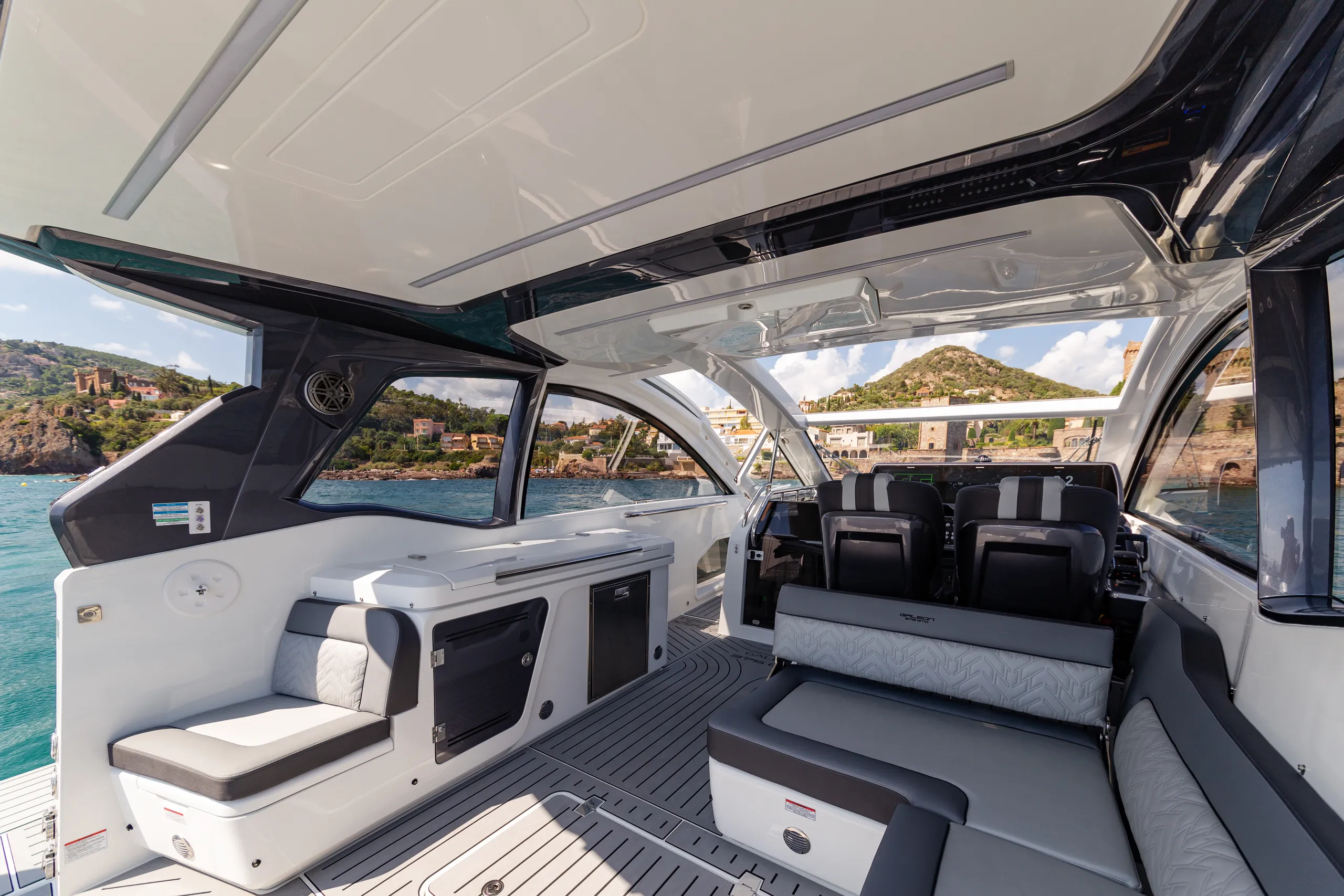 Sviluppata in collaborazione con il Tony Castro Design Studio, la 375 sfrutta decenni di esperienza e innovazioni nella costruzione di imbarcazioni di Galeon, dando vita a un modello davvero eccezionale che si unisce alla gamma GTO nel 2022. Uno sguardo veloce all'esterno mozzafiato rivela tre aree che si contendono l'attenzione. Prima di tutto, notiamo l'incredibile tetto apribile in vetro a due parti sopra la postazione di comando, un vero e proprio colpo d'occhio, che si ritrae rapidamente rivelando il ponte principale e consentendo un facile accesso all'area di prua.