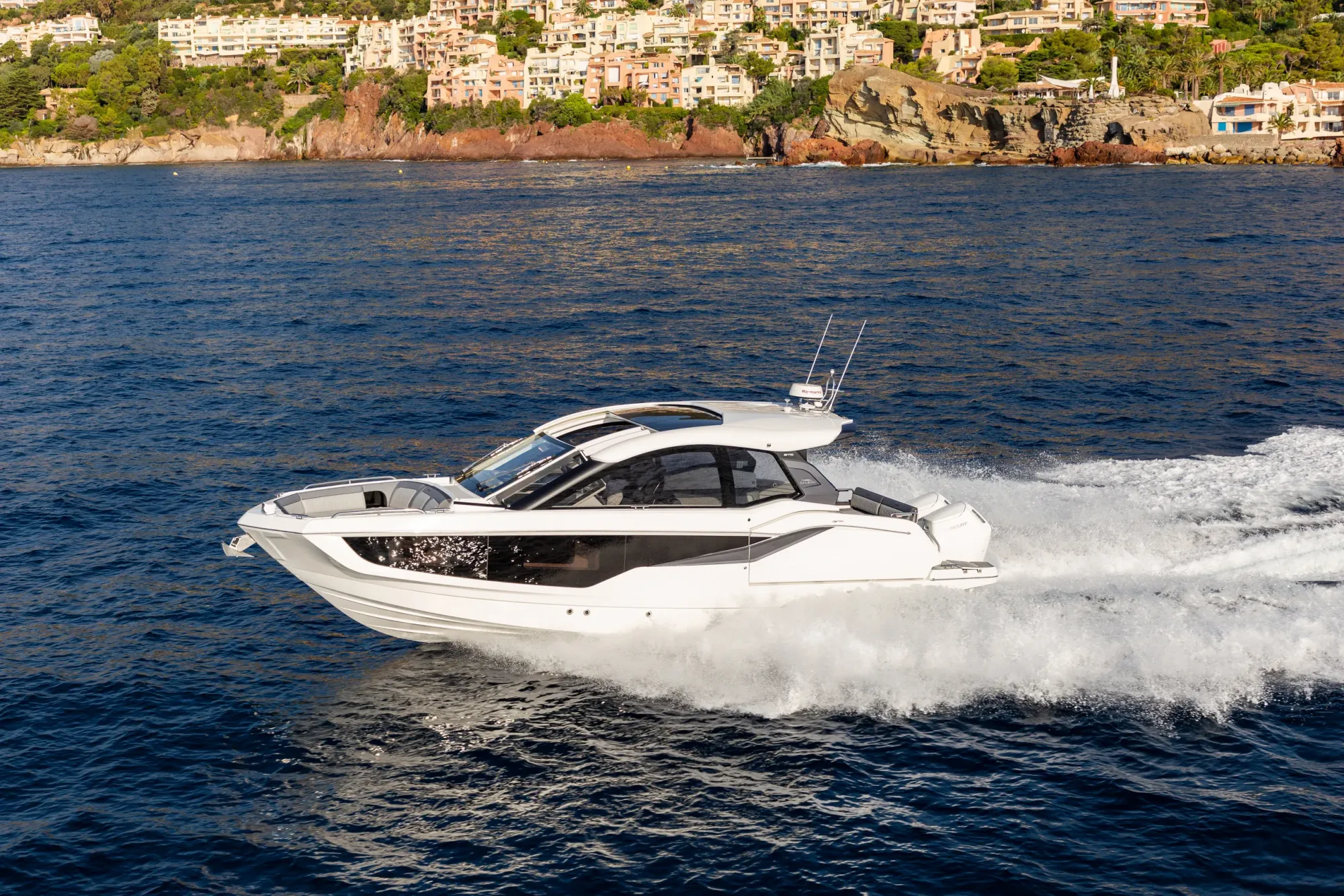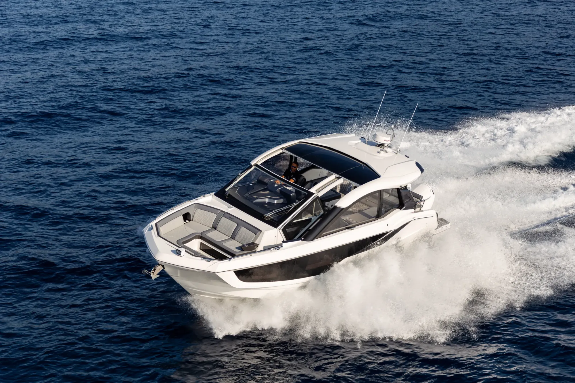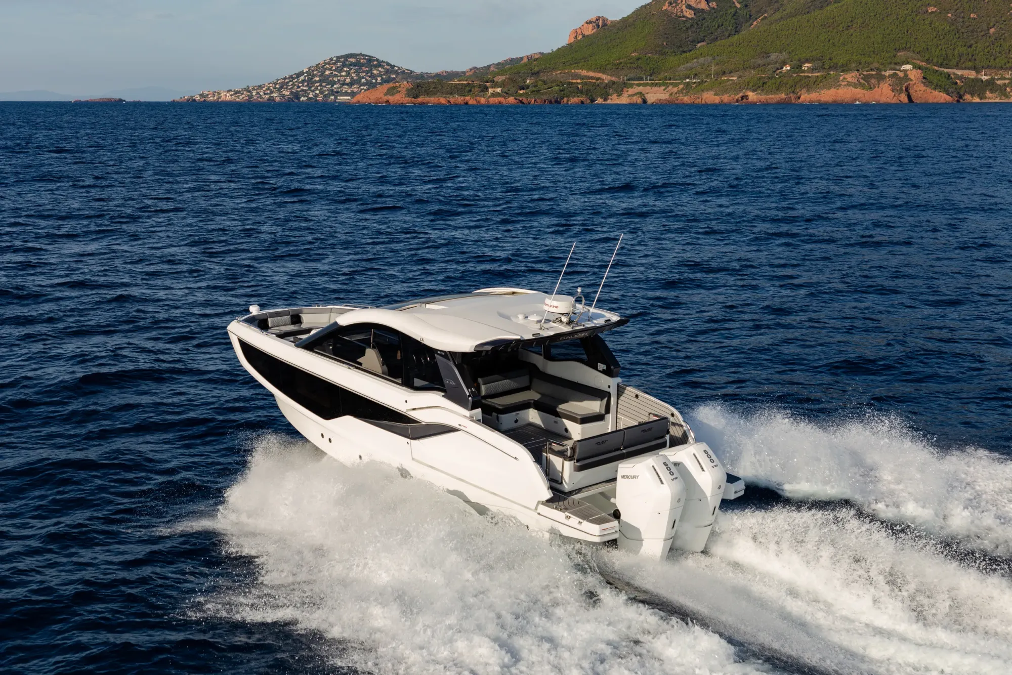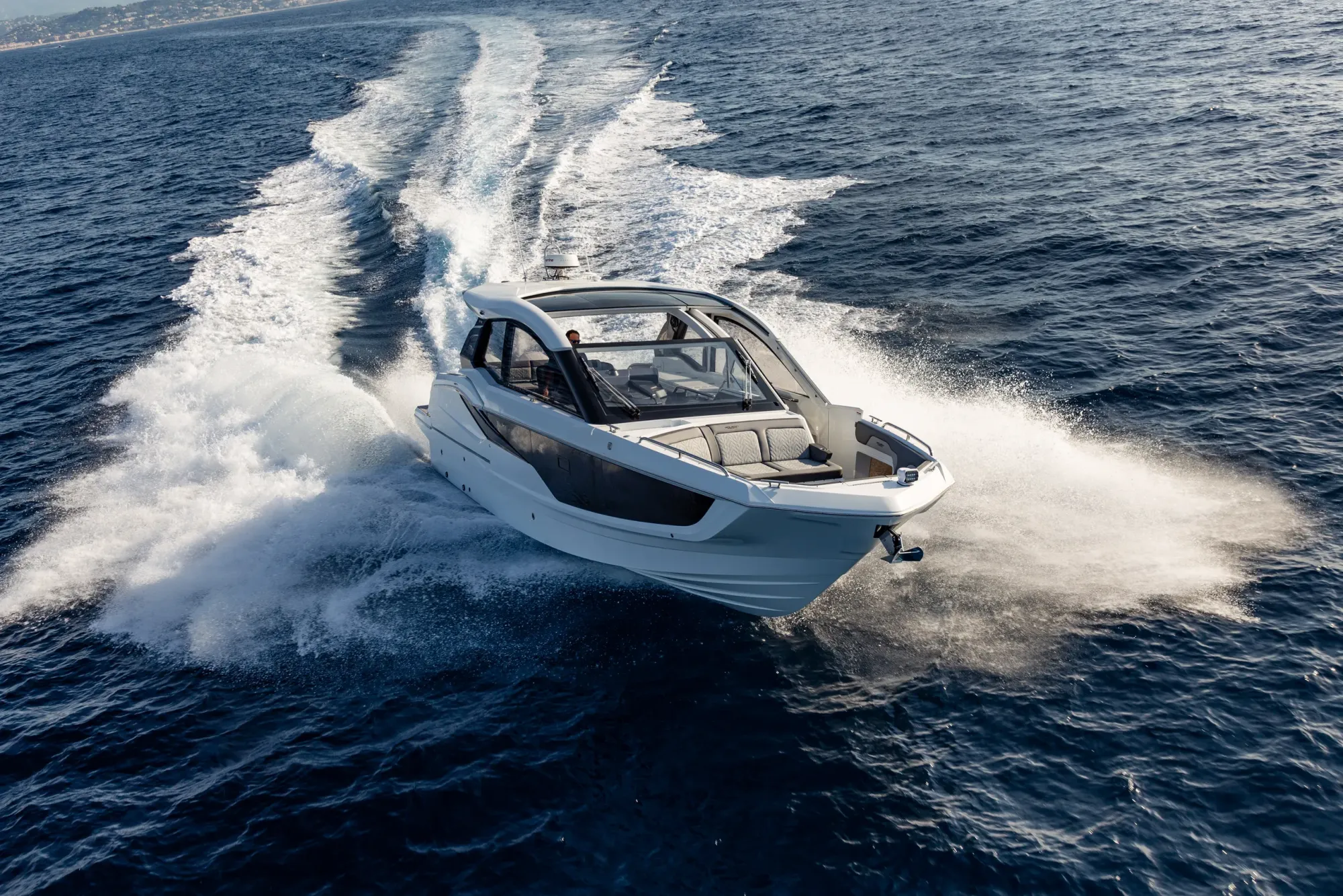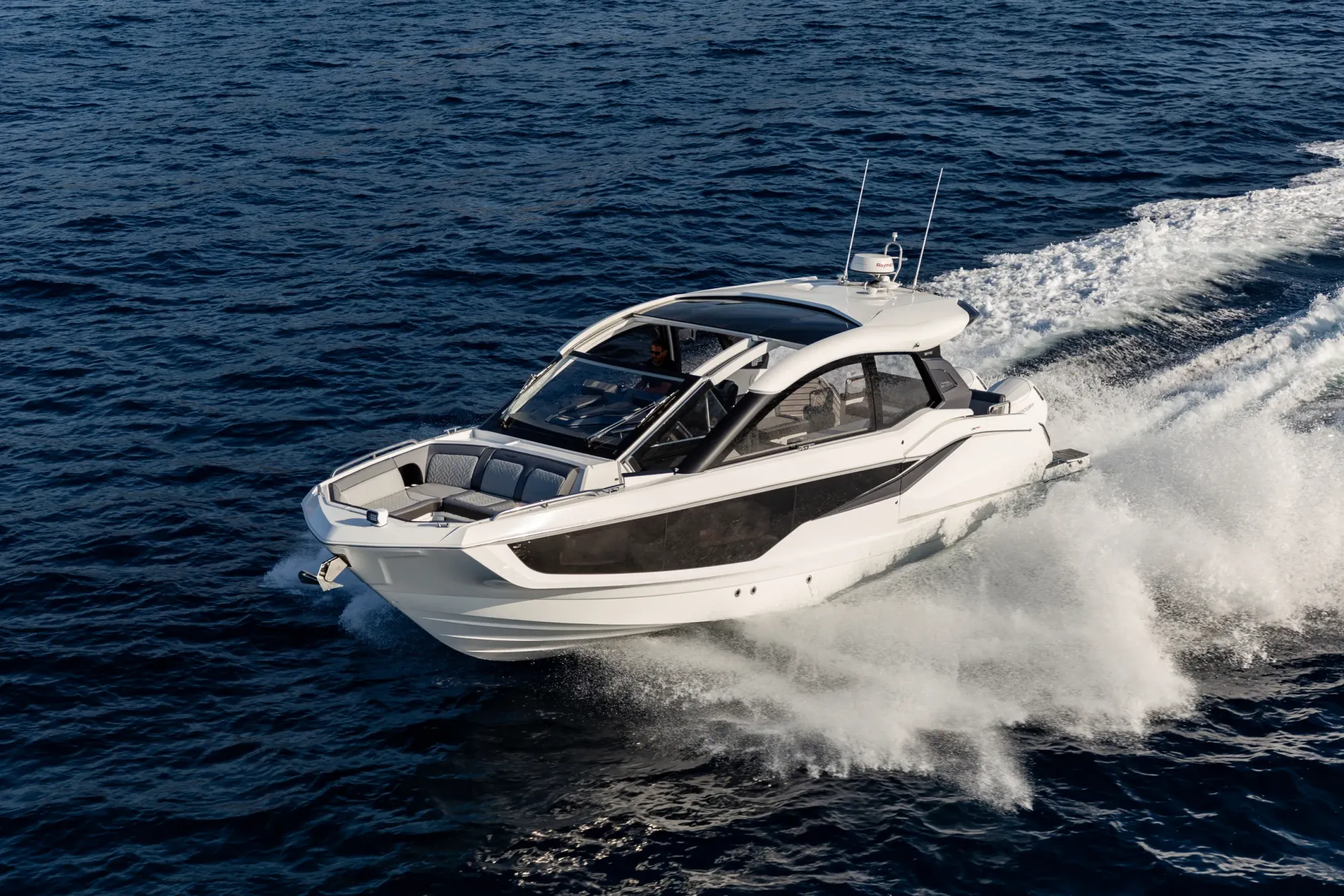Questa imbarcazione da giorno ricca di caratteristiche attira l'attenzione grazie a un design ispirato alla quarta generazione di yacht Galeon, arricchito da un tocco di GTO. Con il suo profilo basso, proporzioni perfette e accenti sportivi, è destinata a distinguersi in qualsiasi marina.