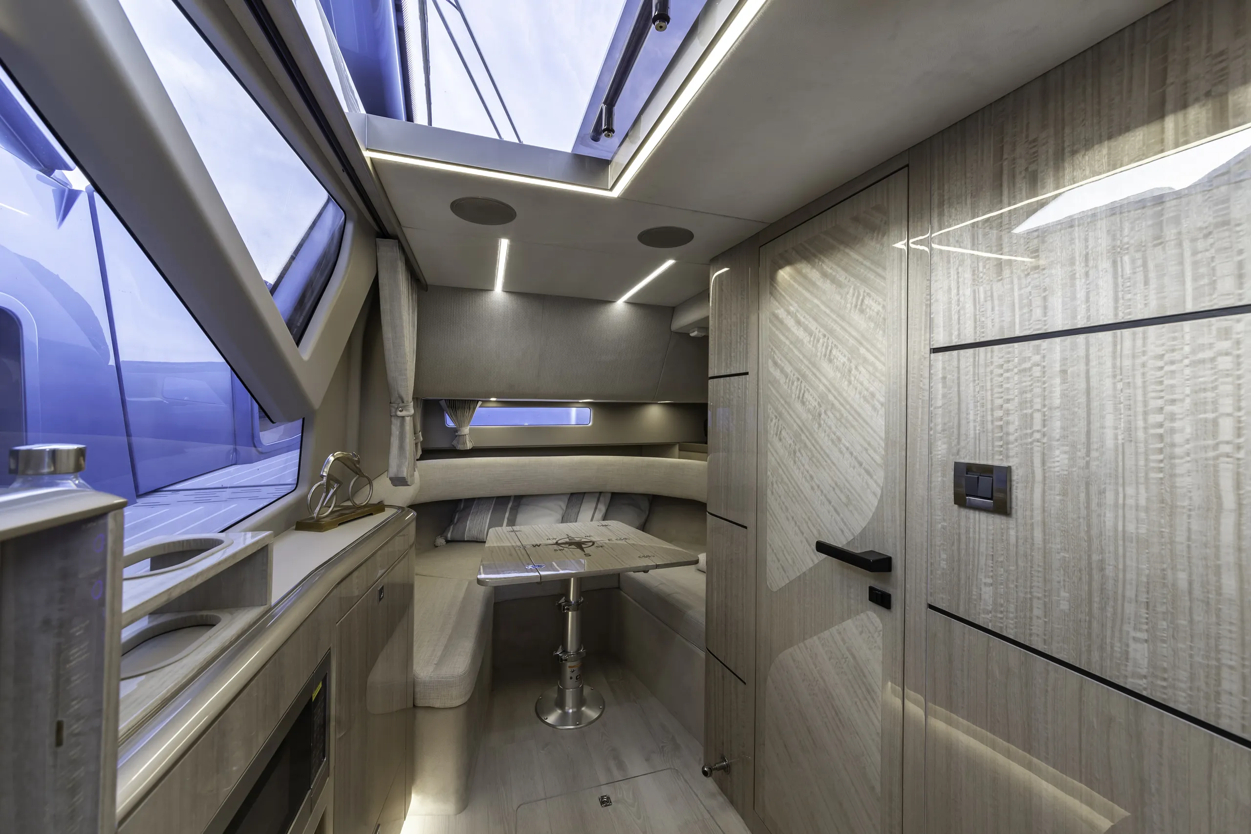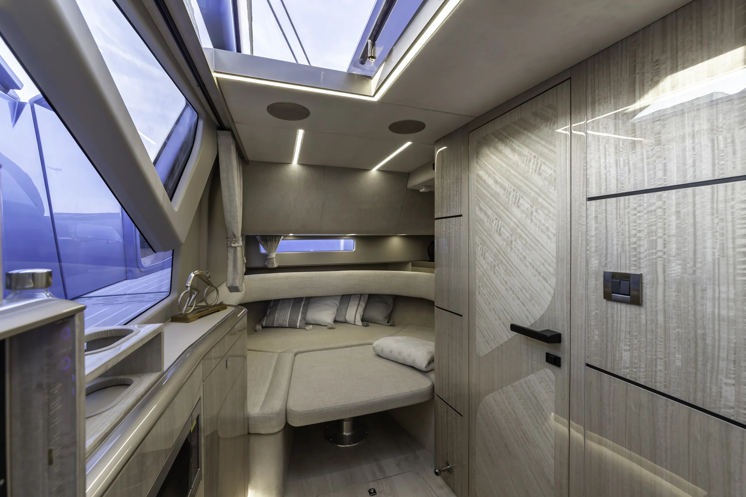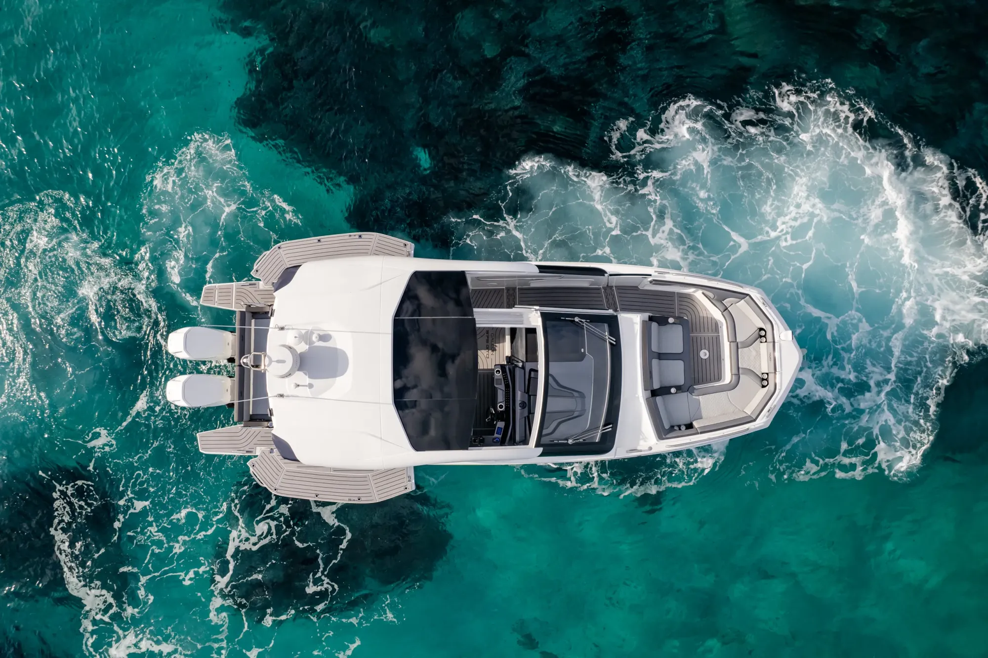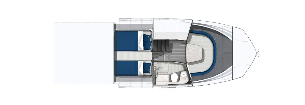 Nella parte anteriore, la seconda sorpresa si presenta sotto forma di un'area di riposo sovradimensionata a forma di U con supporti per il collo, che si trasforma rapidamente in un vero e proprio solarium e può ospitare sei passeggeri. Infine, abbiamo l'area del pozzetto con piattaforme pieghevoli a sinistra e a destra che creano dei balconi, ampliando lo spazio utilizzabile quando si è fermi.