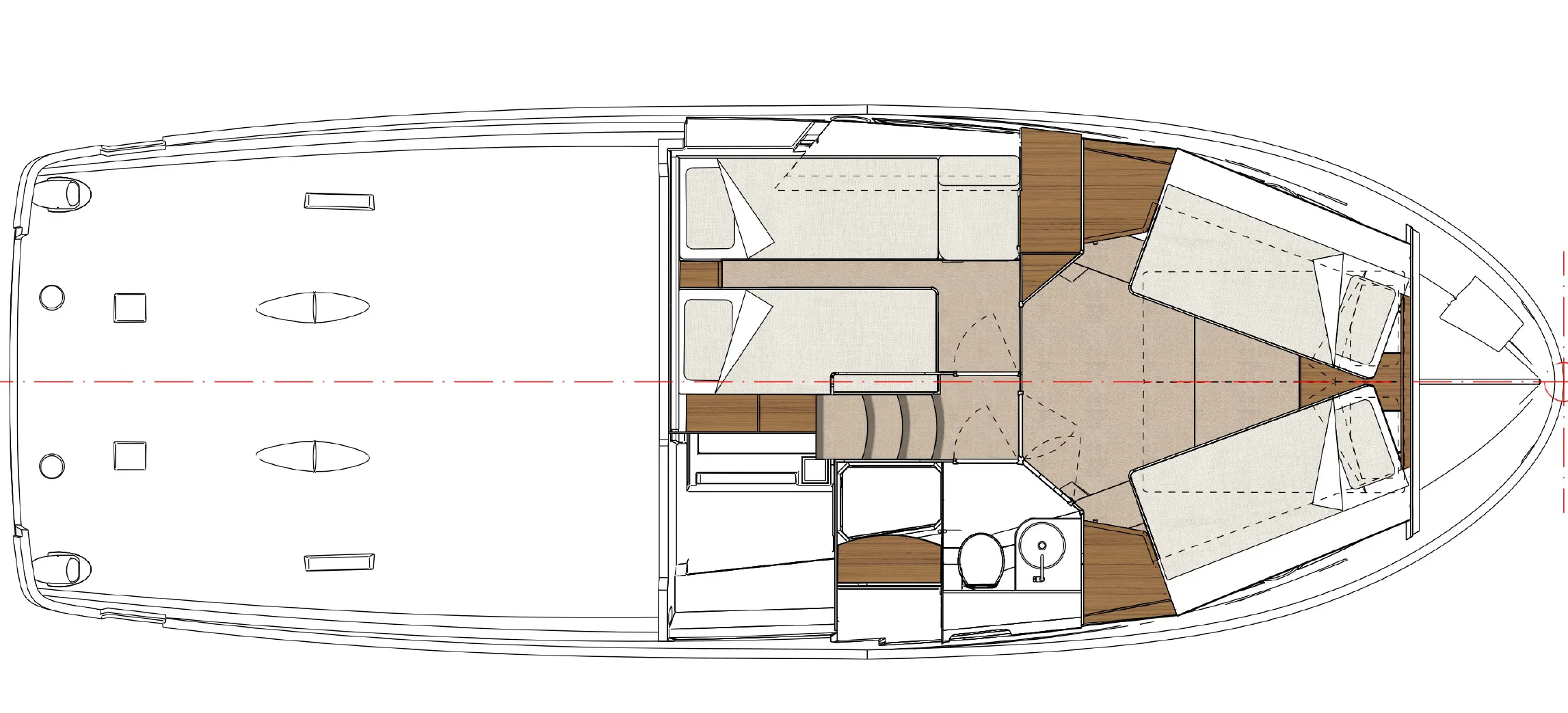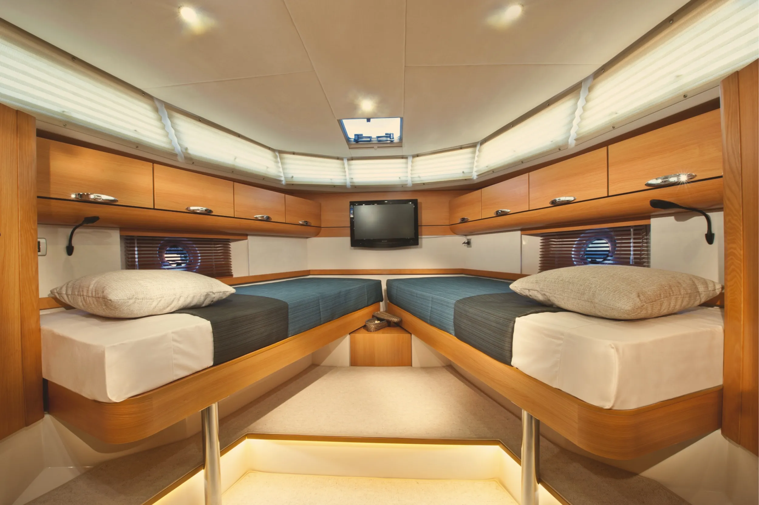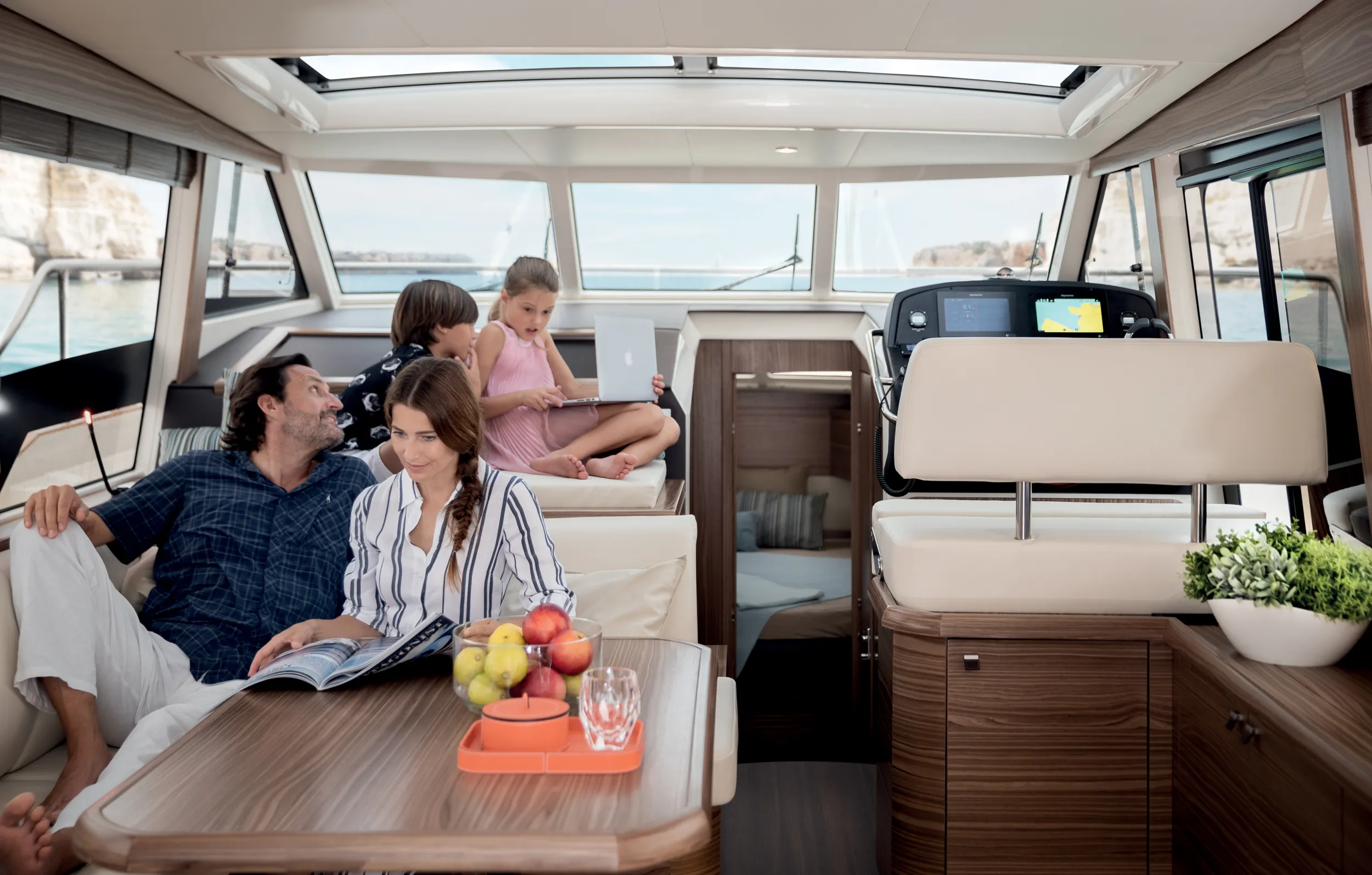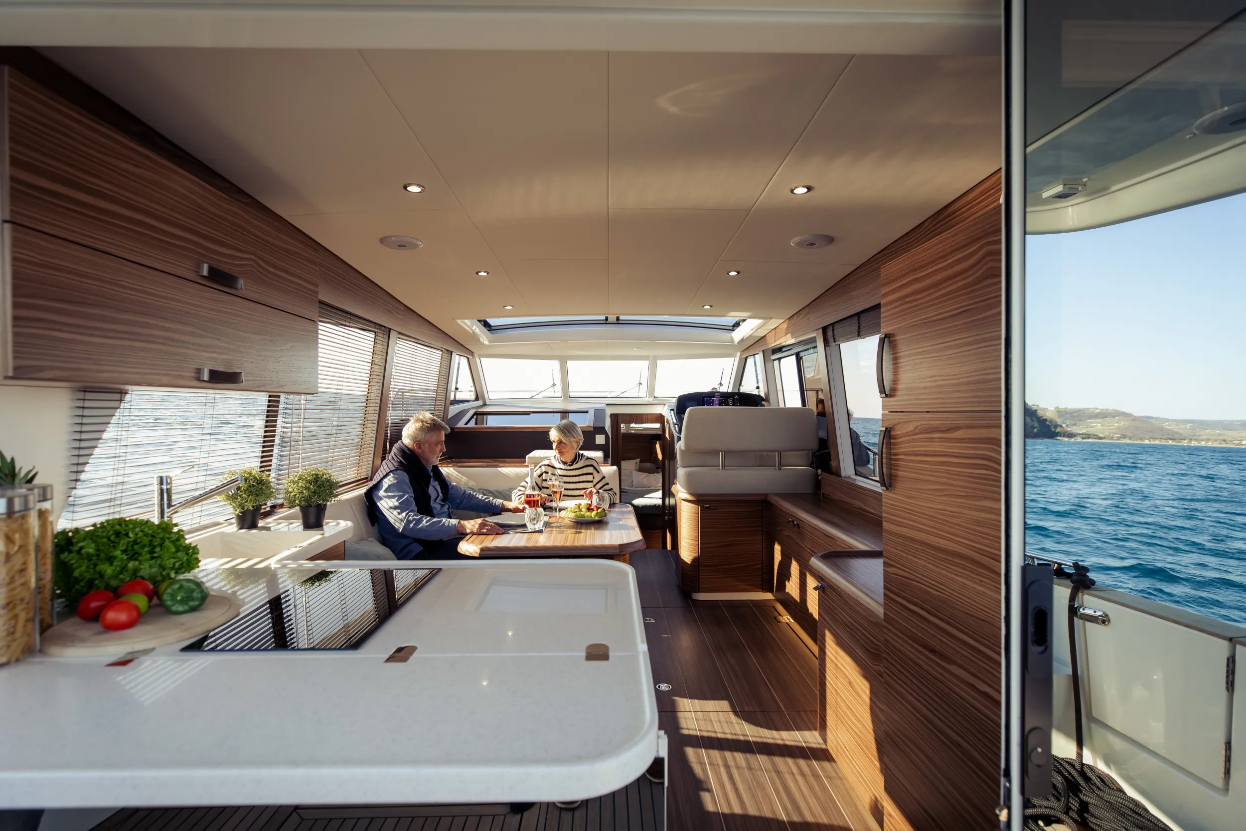 Large windows and a single-level main deck create a bright, open saloon that connects seamlessly to the cockpit, enhancing both visibility and social life on board. Below, two comfortable cabins and a well-appointed bathroom provide private accommodation for family or guests, with generous storage and thoughtful detailing to support longer stays aboard. The interior is complemented by carefully considered ergonomics so that moving around the yacht feels safe and intuitive for all ages.