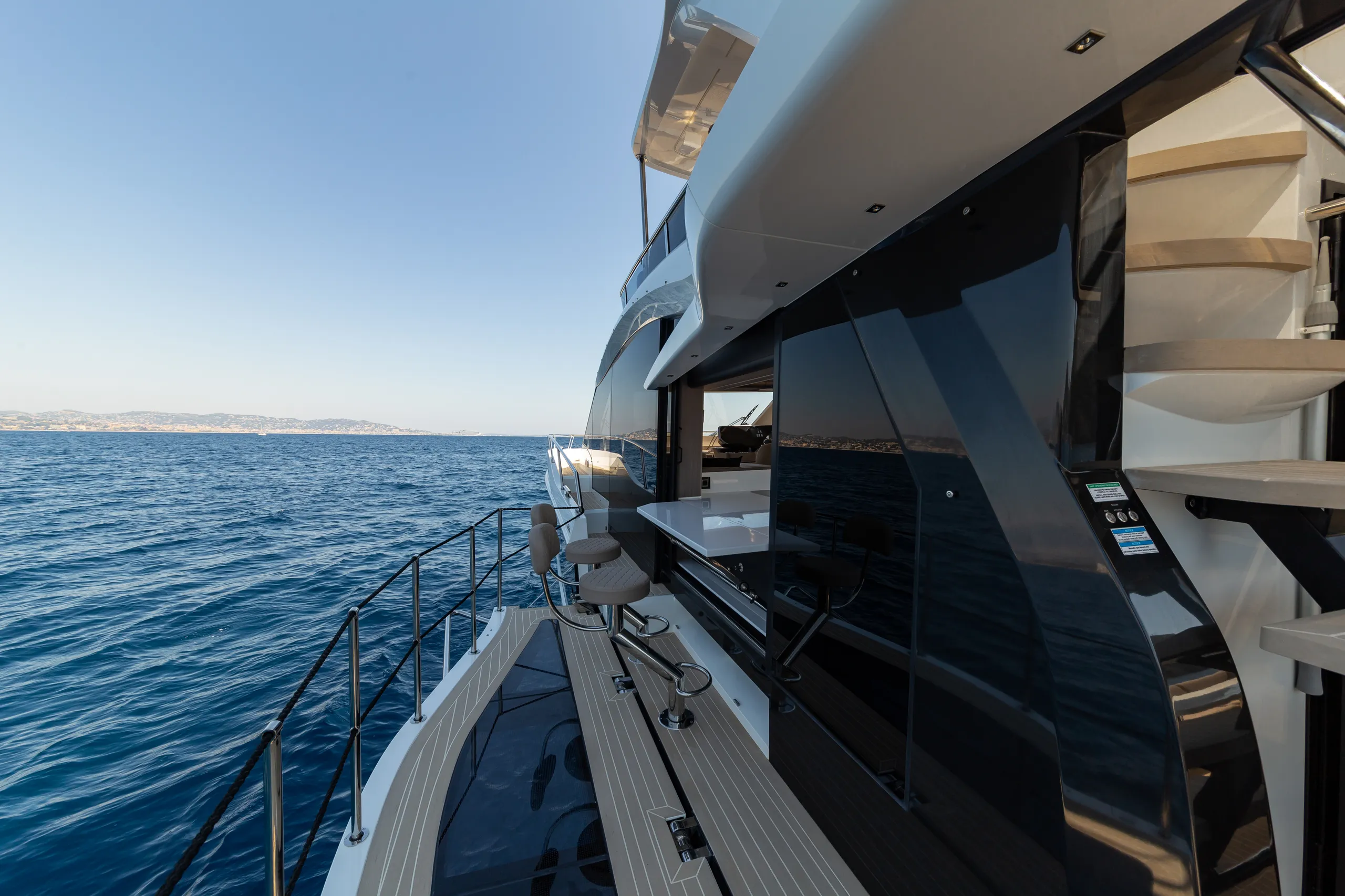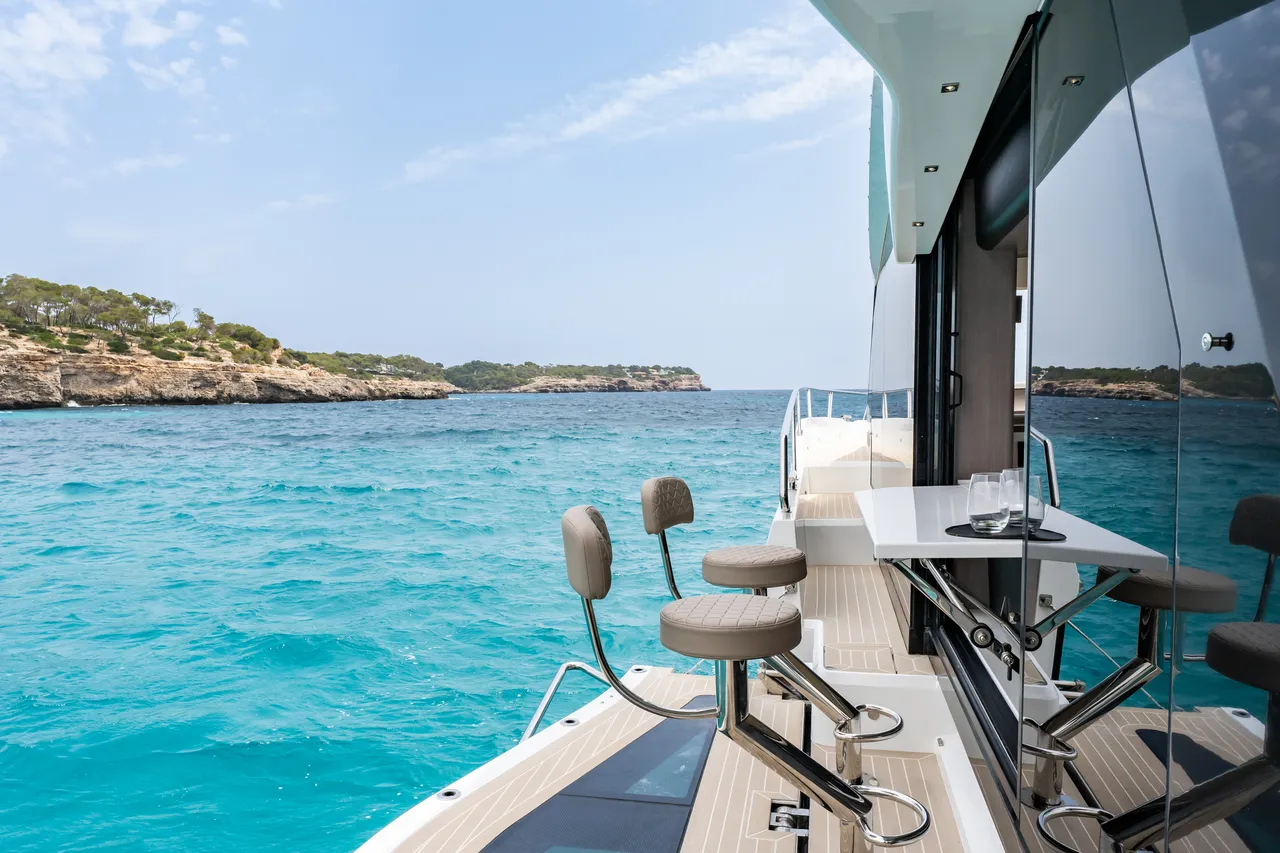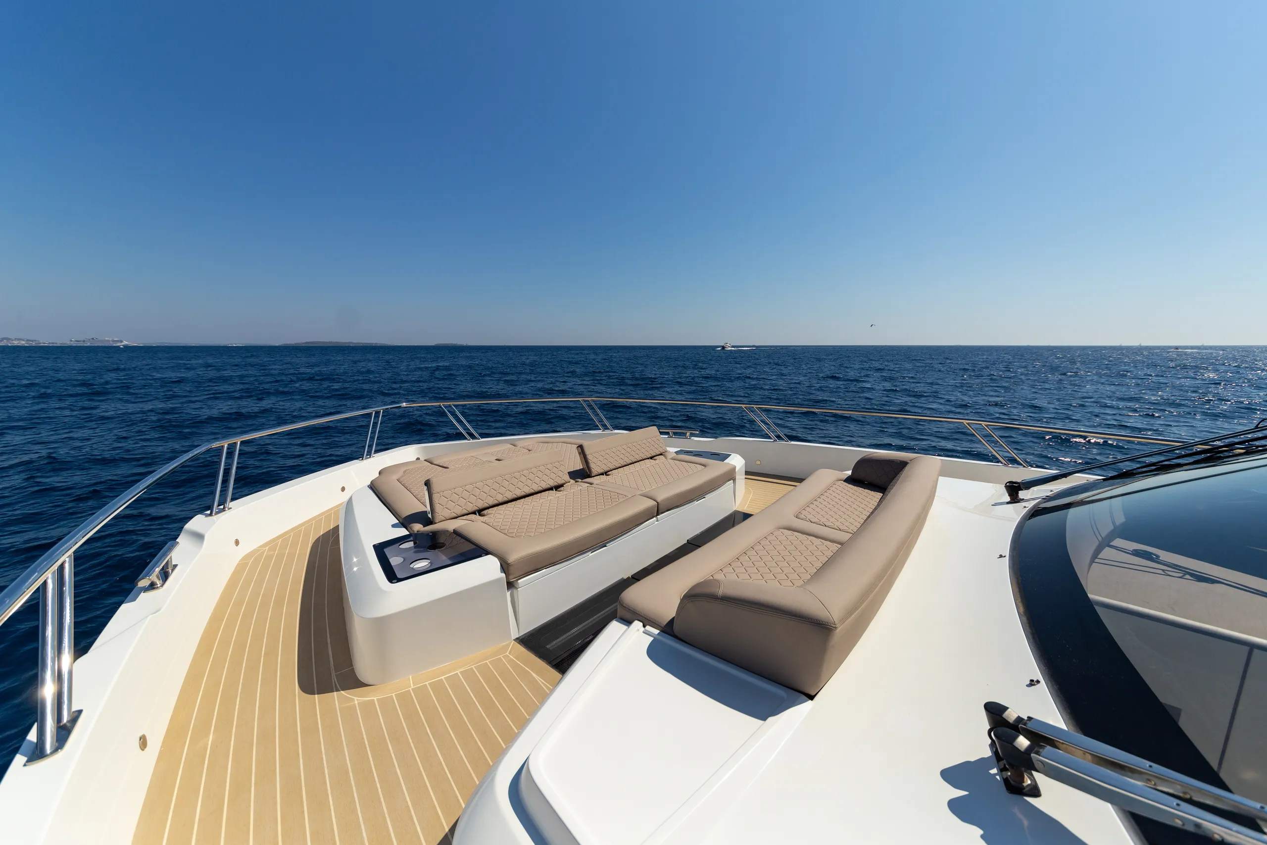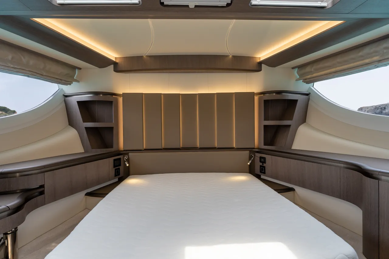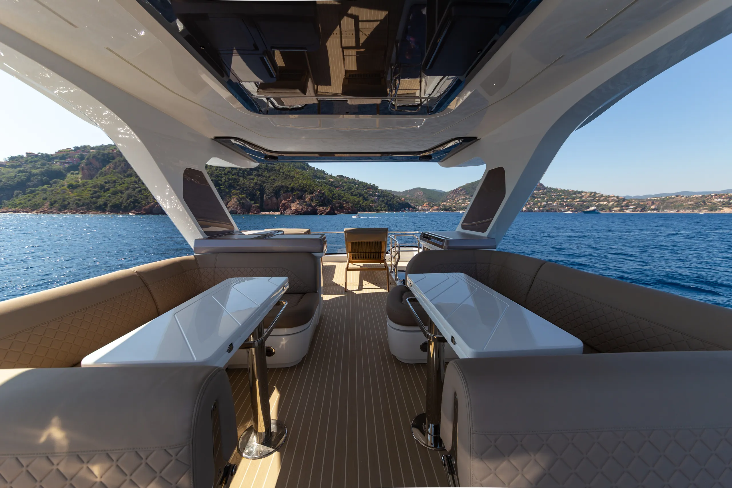 The exterior is highlighted by the abundance of space on both decks and a plethora of windows that promise a well-lit interior. On the top deck guests will find two U-shaped, opposite facing rest and dining areas – combine them for a perfect alfresco dining experience! Up front, find a seating area and the upper helm station with the wet bar and grill moved back. The large overhang area comes with uninterrupted space for leisure and activities and can be occupied by two free-standing sun loungers. This flexible approach to space distribution allows for respite during the day and entertaining guests in the evening.