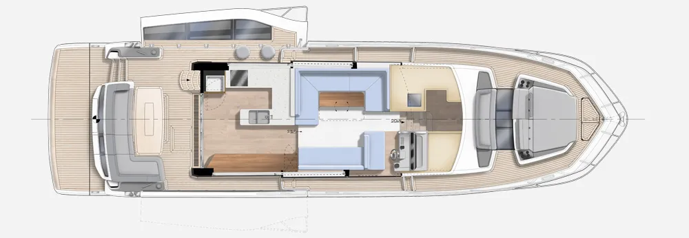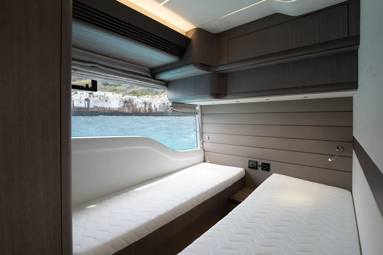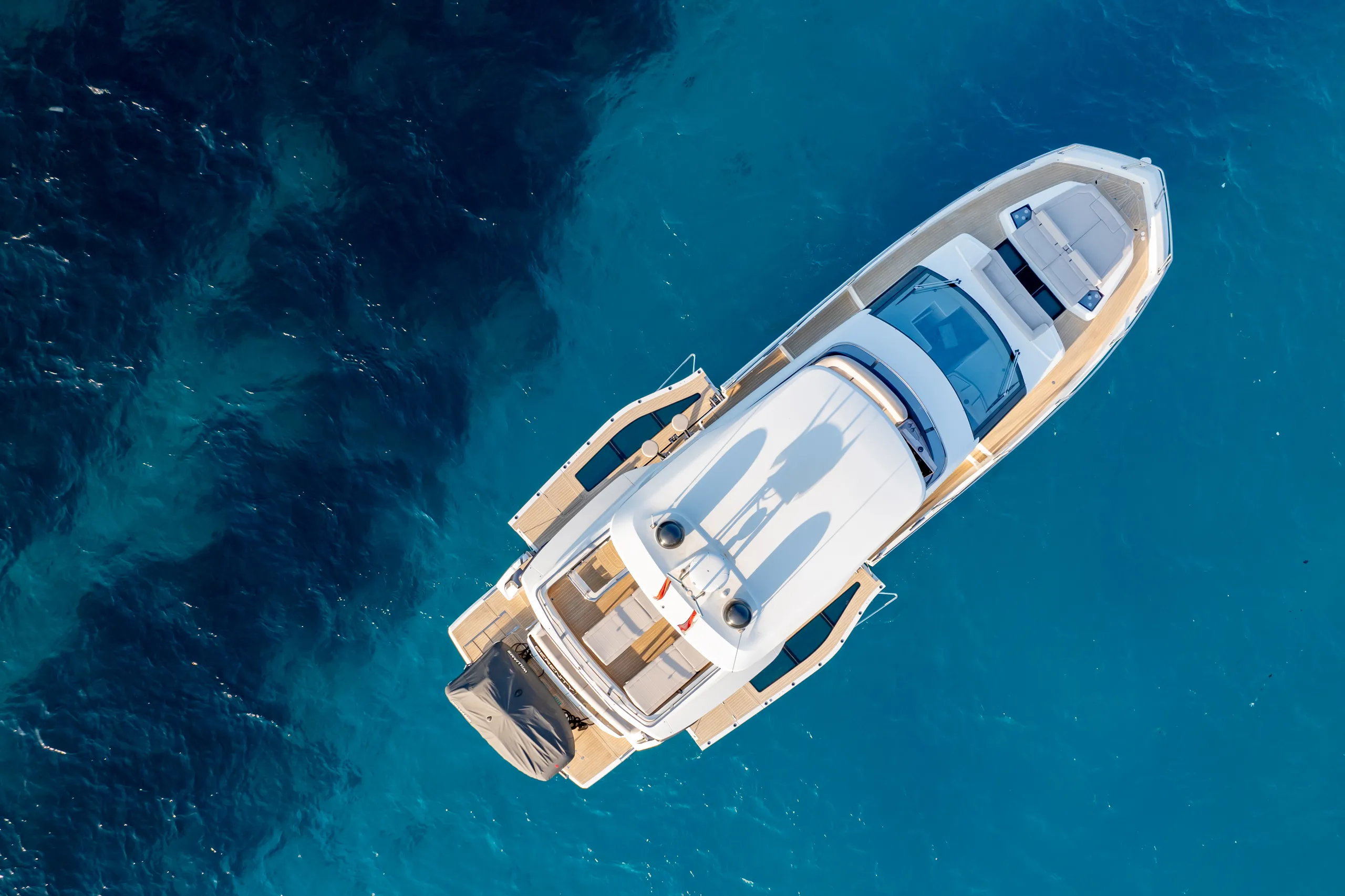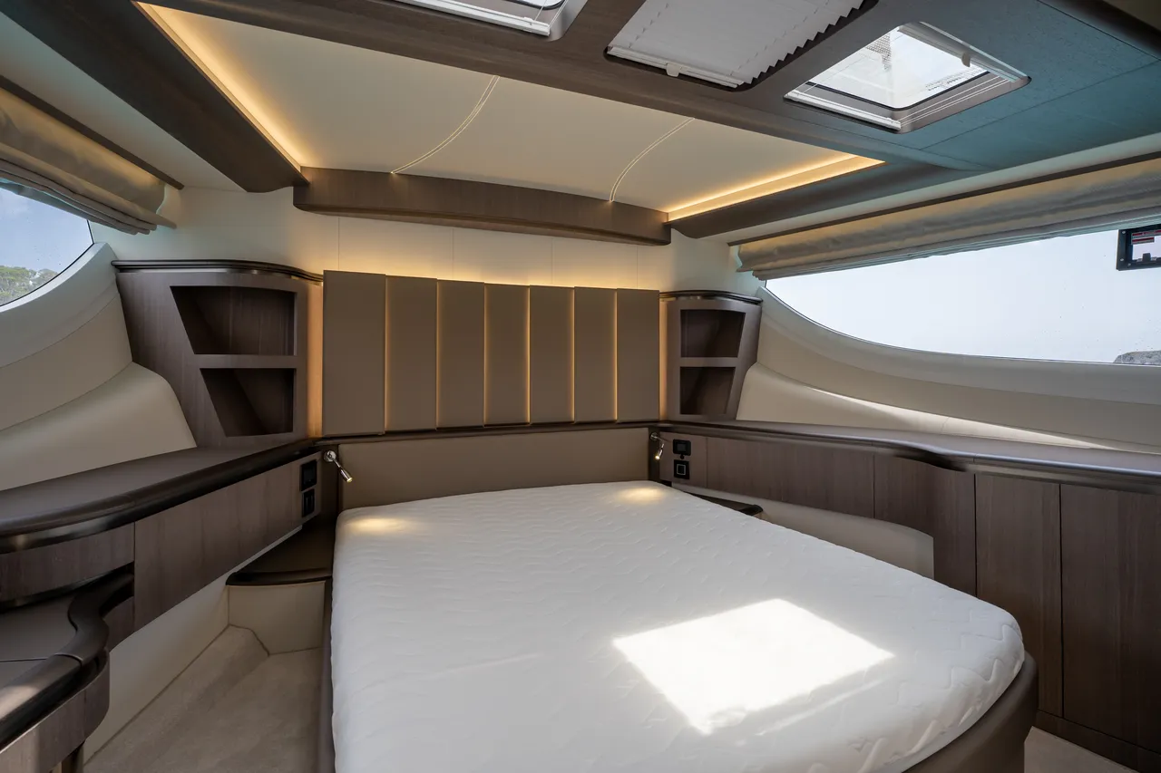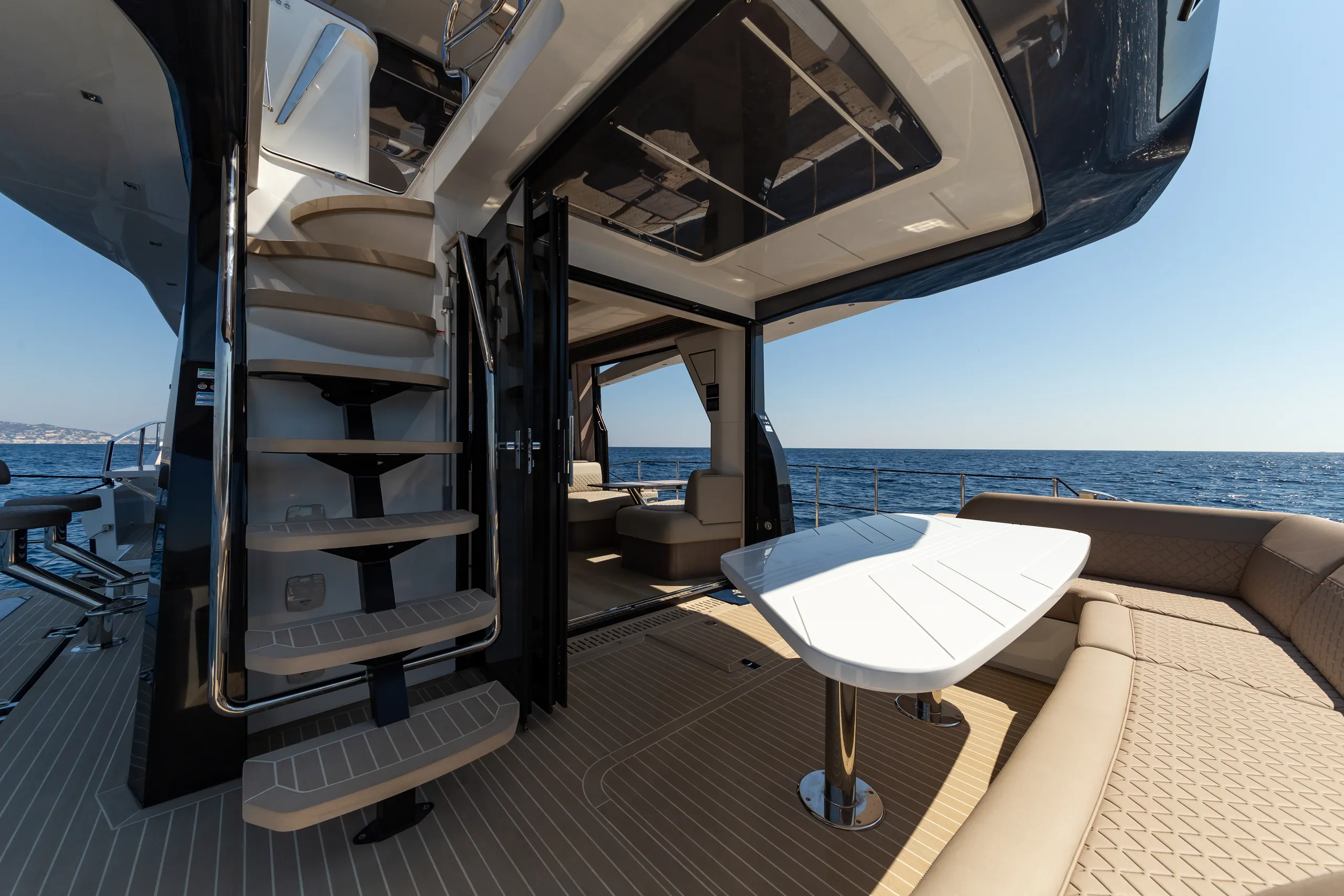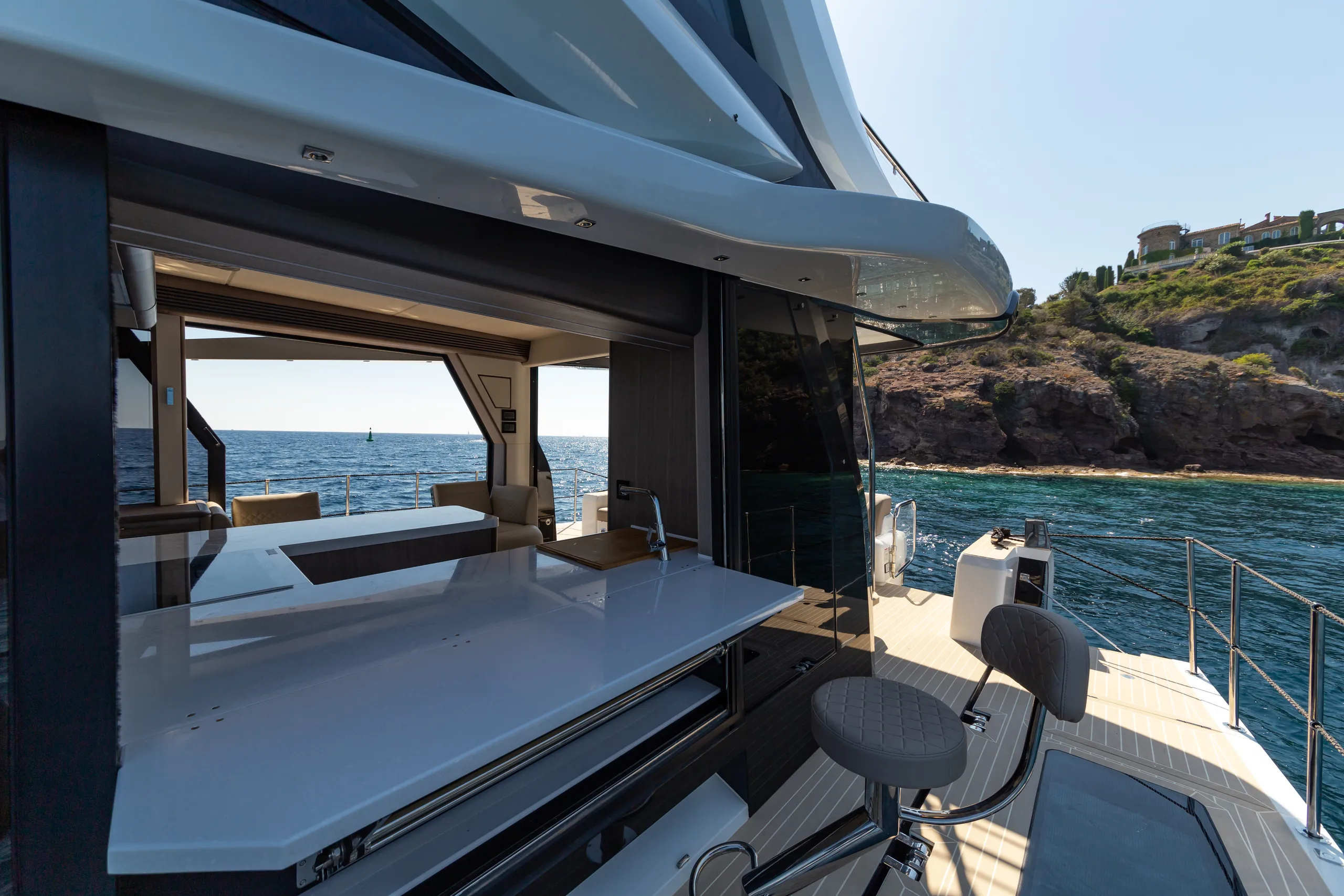 The exterior is highlighted by the abundance of space on both decks and a plethora of windows that promise a well-lit interior. On the top deck guests will find two U-shaped, opposite facing rest and dining areas – combine them for a perfect alfresco dining experience! Up front, find a seating area and the upper helm station with the wet bar and grill moved back. The large overhang area comes with uninterrupted space for leisure and activities and can be occupied by two free-standing sun loungers. This flexible approach to space distribution allows for respite during the day and entertaining guests in the evening.