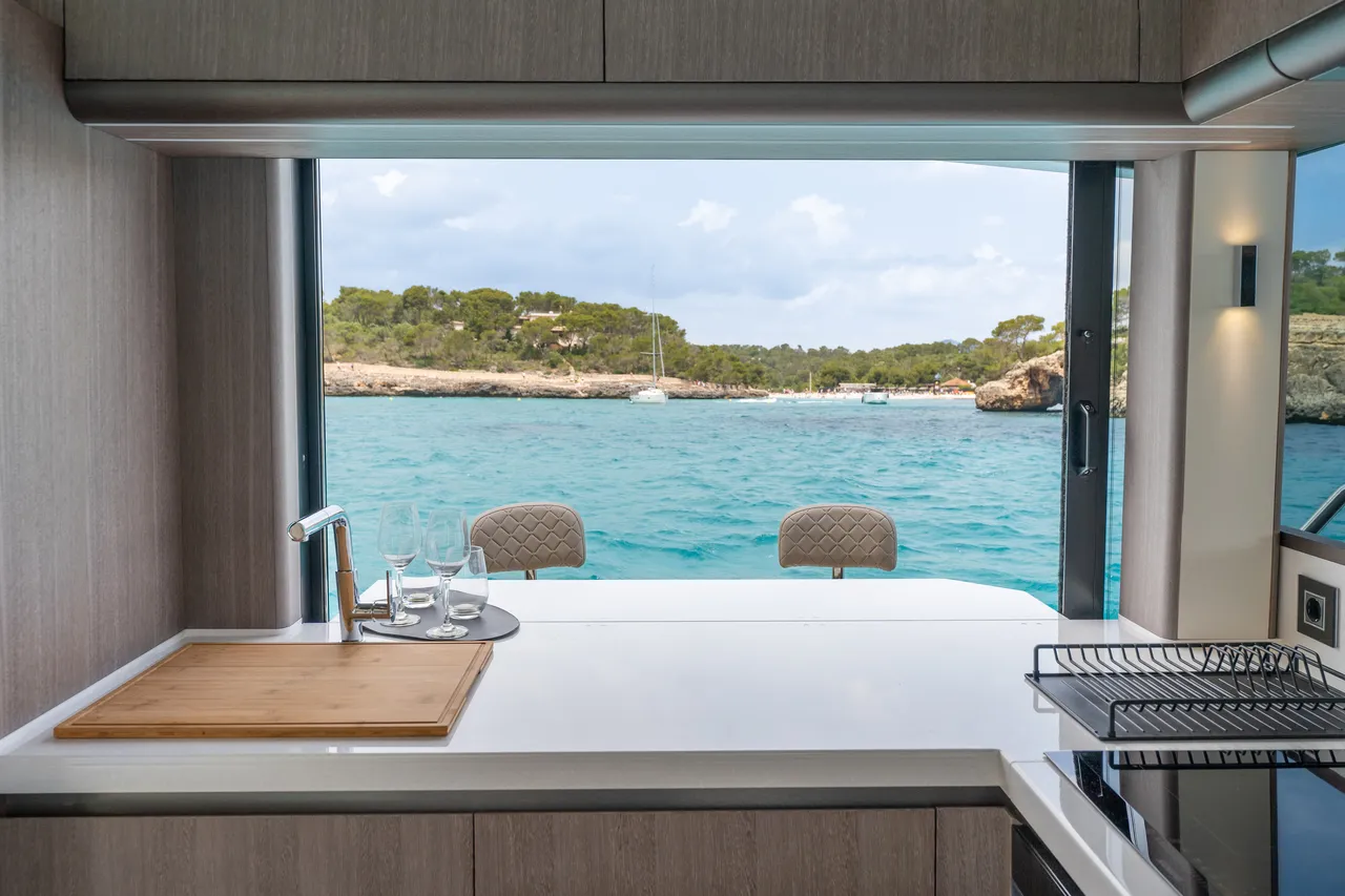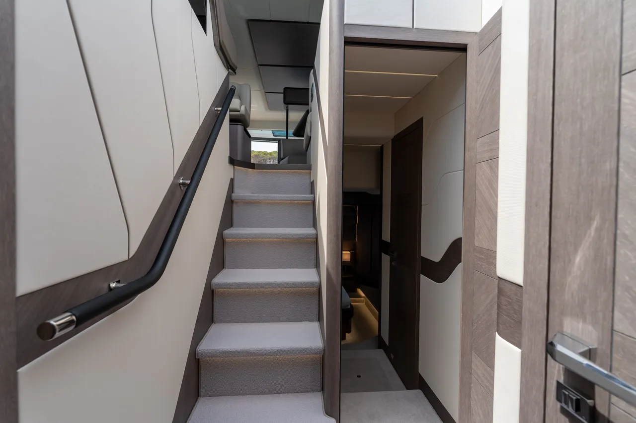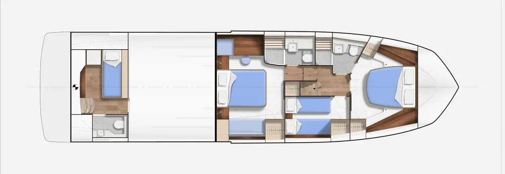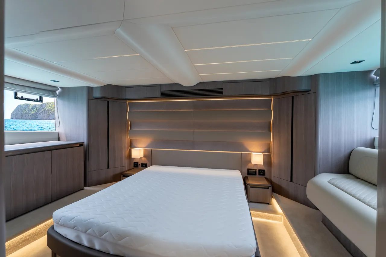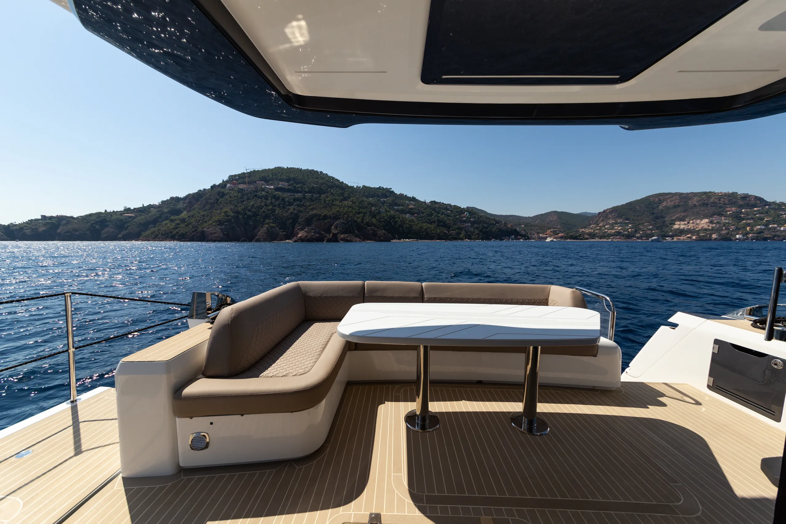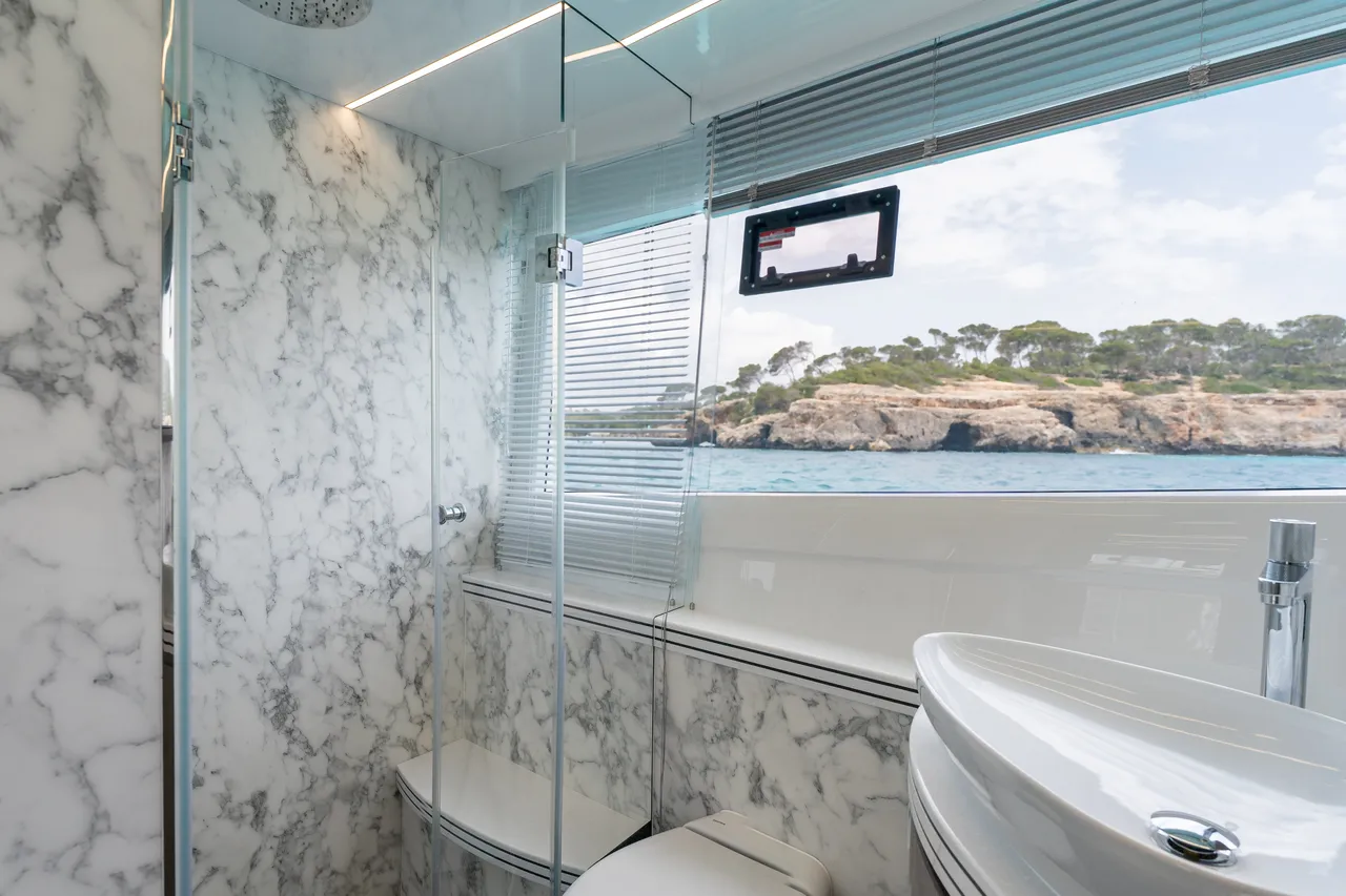 The exterior is highlighted by the abundance of space on both decks and a plethora of windows that promise a well-lit interior. On the top deck guests will find two U-shaped, opposite facing rest and dining areas – combine them for a perfect alfresco dining experience! Up front, find a seating area and the upper helm station with the wet bar and grill moved back. The large overhang area comes with uninterrupted space for leisure and activities and can be occupied by two free-standing sun loungers. This flexible approach to space distribution allows for respite during the day and entertaining guests in the evening.