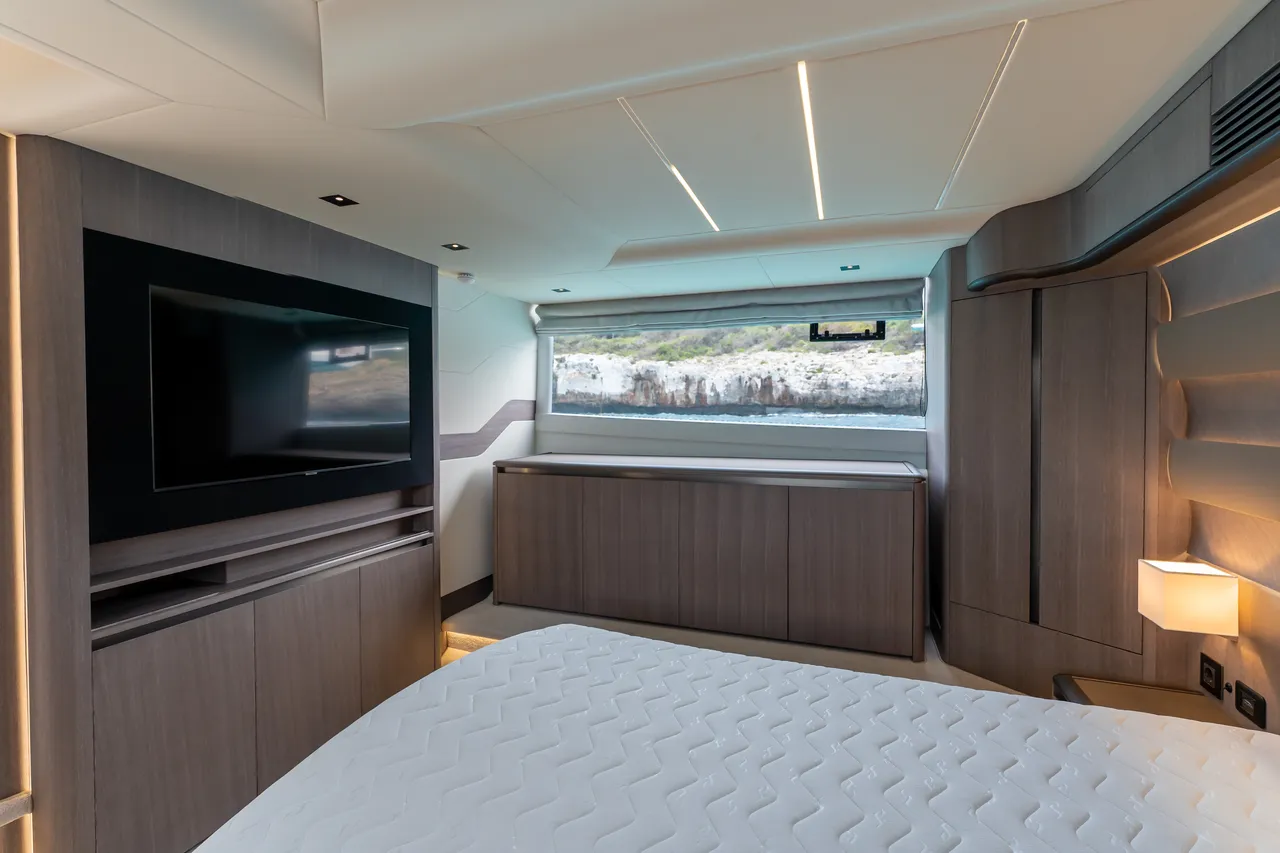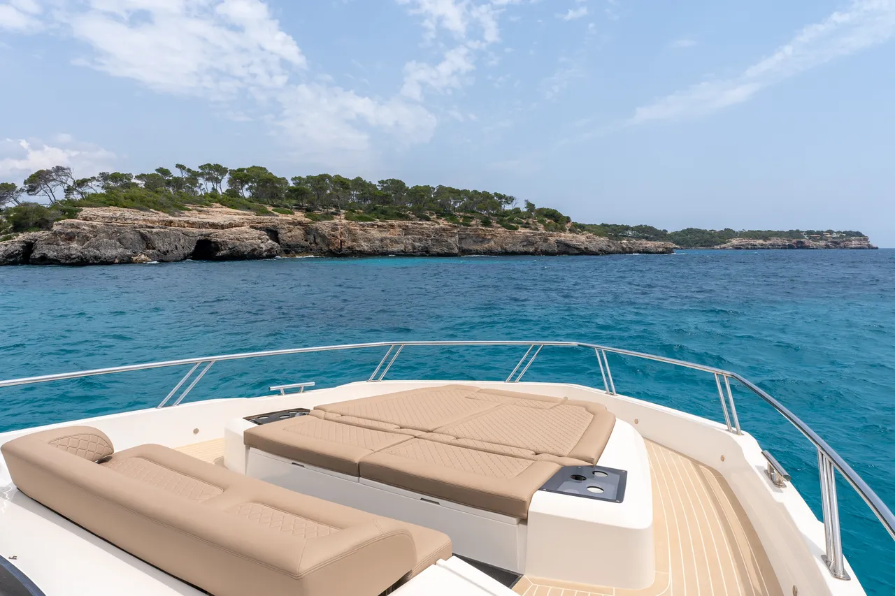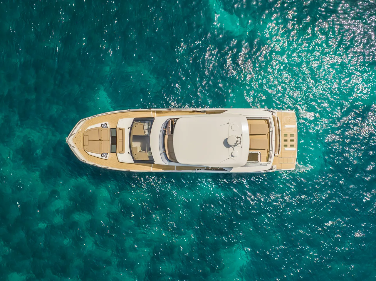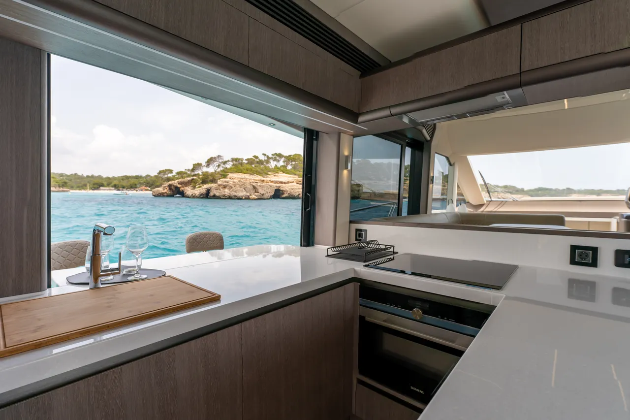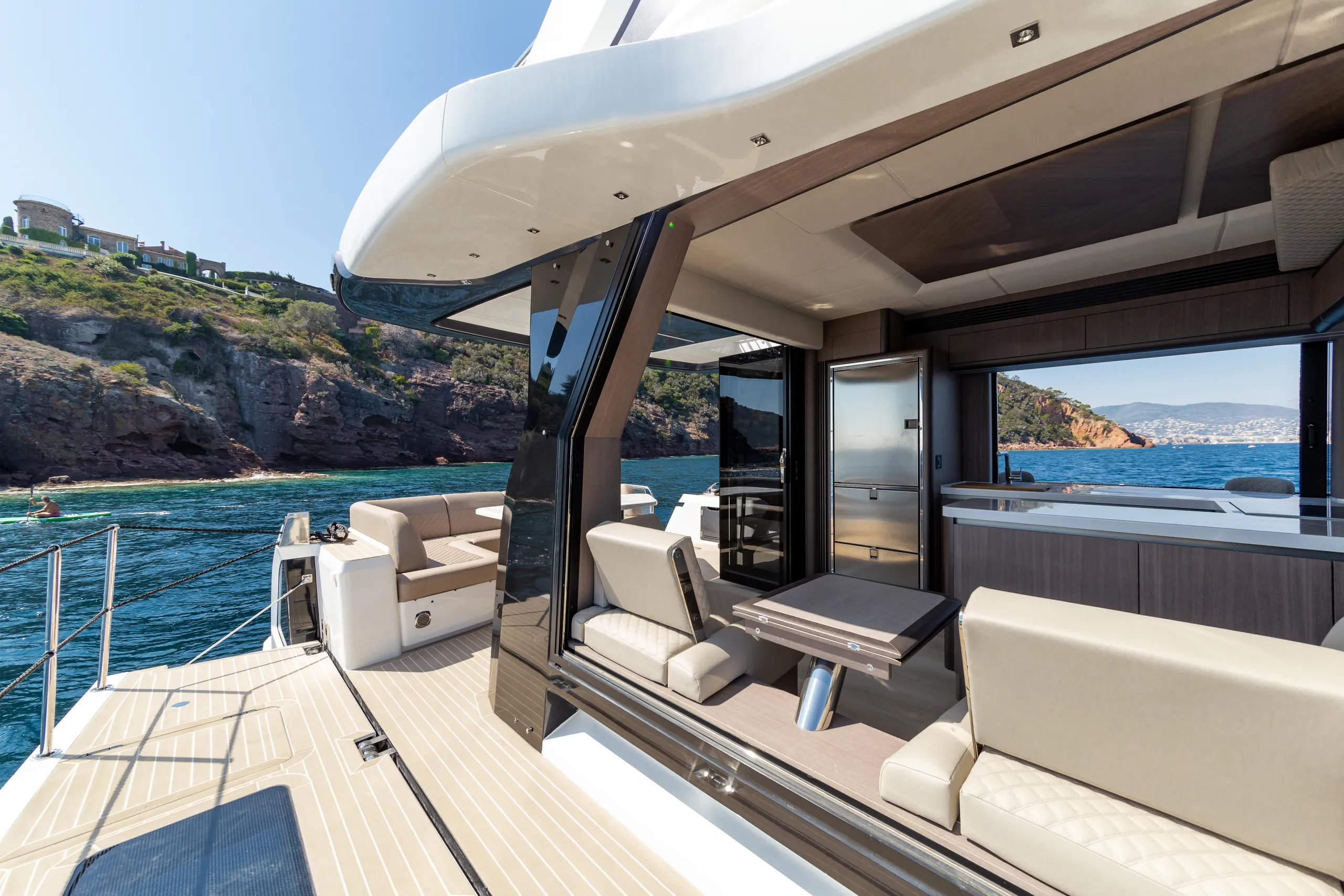 The exterior is highlighted by the abundance of space on both decks and a plethora of windows that promise a well-lit interior. On the top deck guests will find two U-shaped, opposite facing rest and dining areas – combine them for a perfect alfresco dining experience! Up front, find a seating area and the upper helm station with the wet bar and grill moved back. The large overhang area comes with uninterrupted space for leisure and activities and can be occupied by two free-standing sun loungers. This flexible approach to space distribution allows for respite during the day and entertaining guests in the evening.