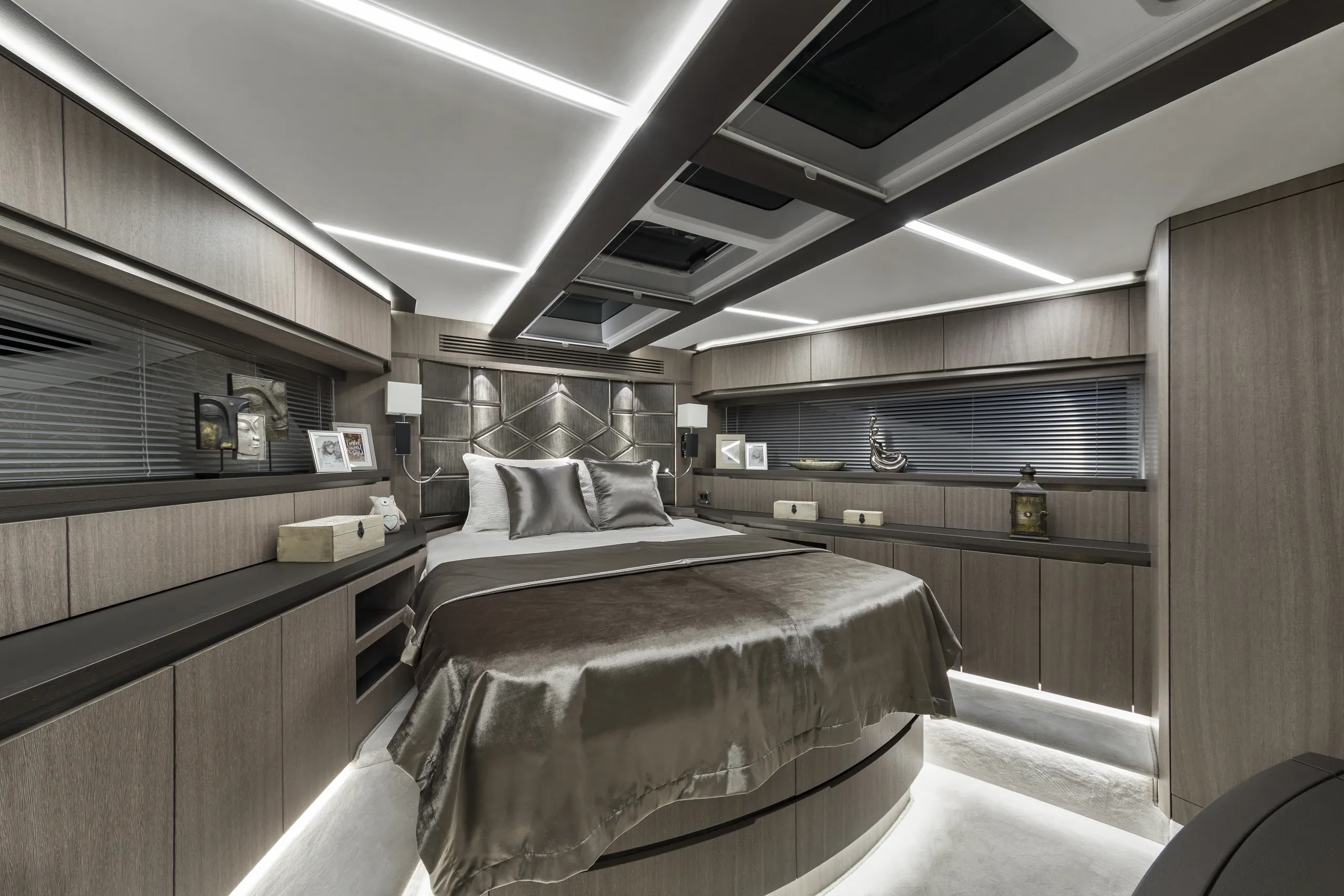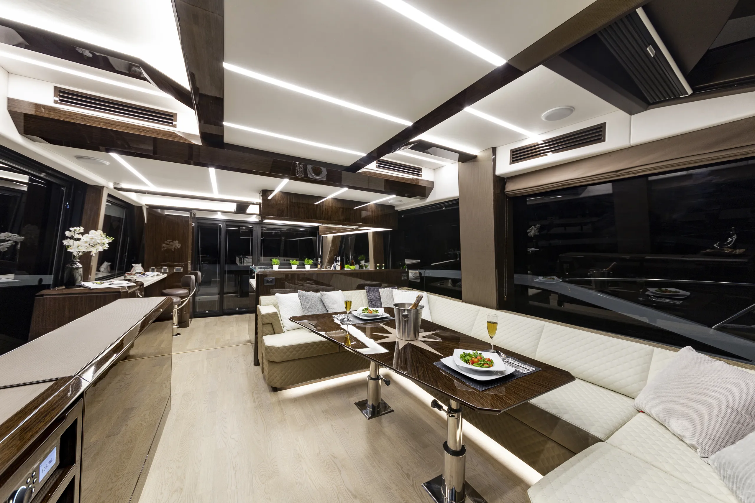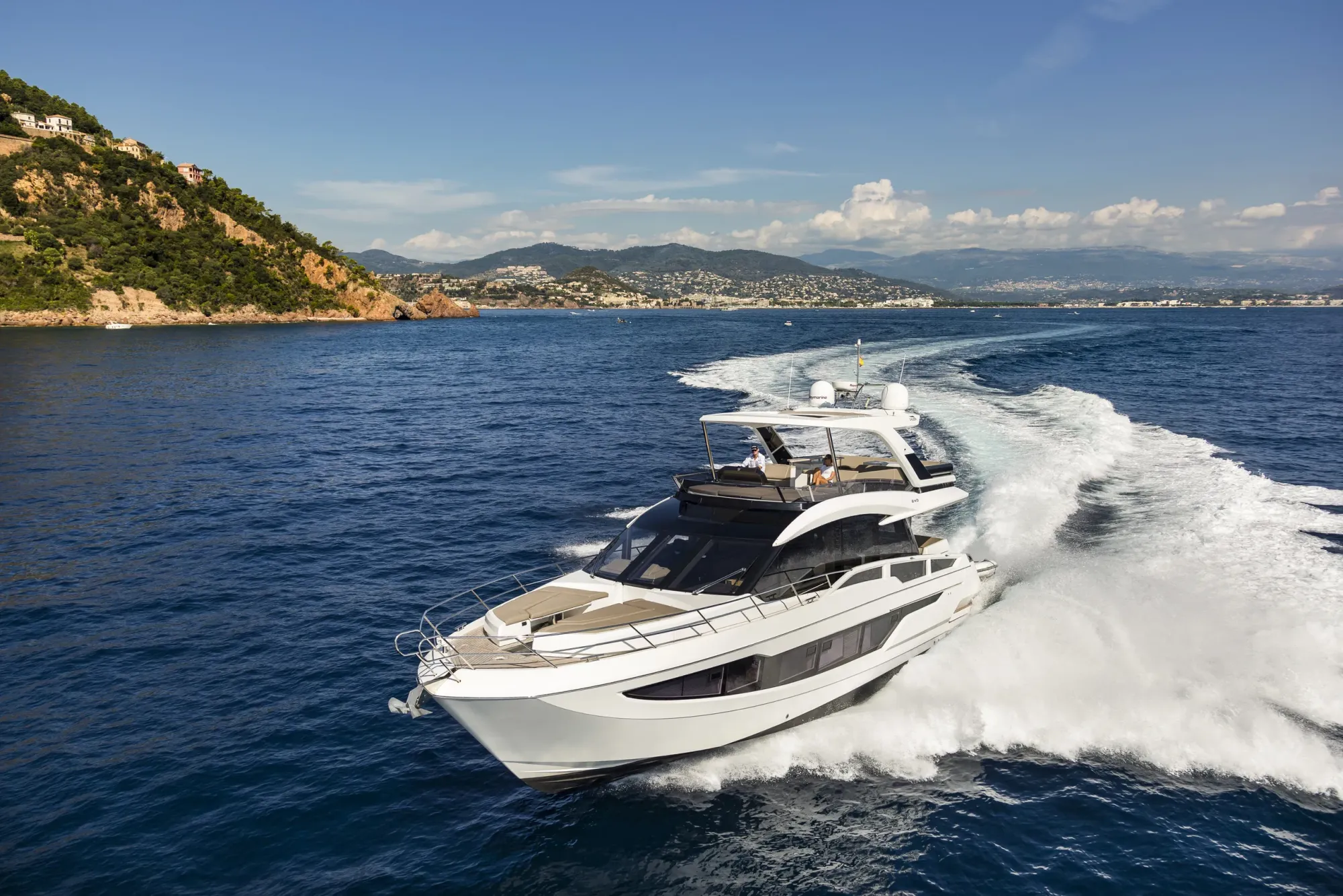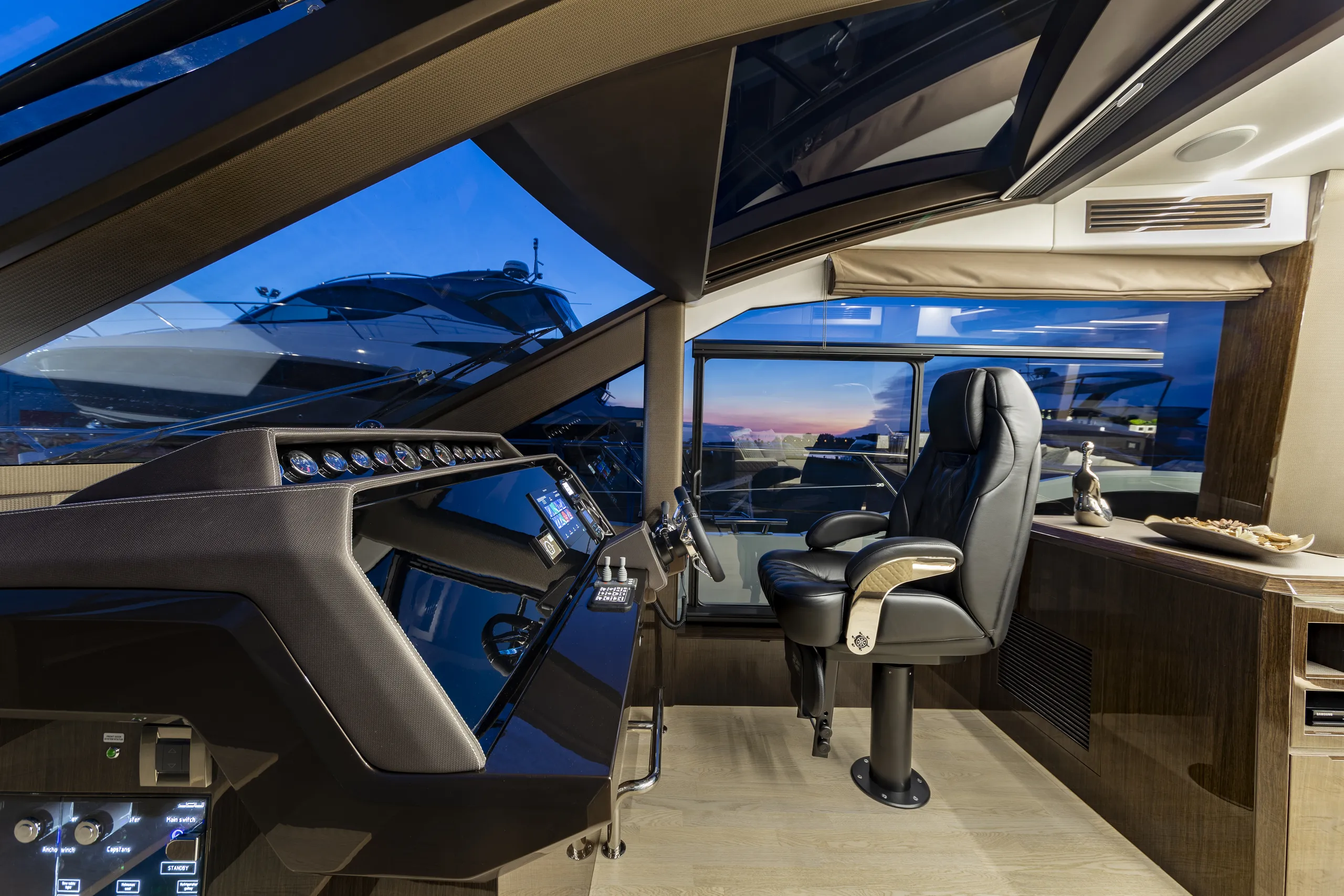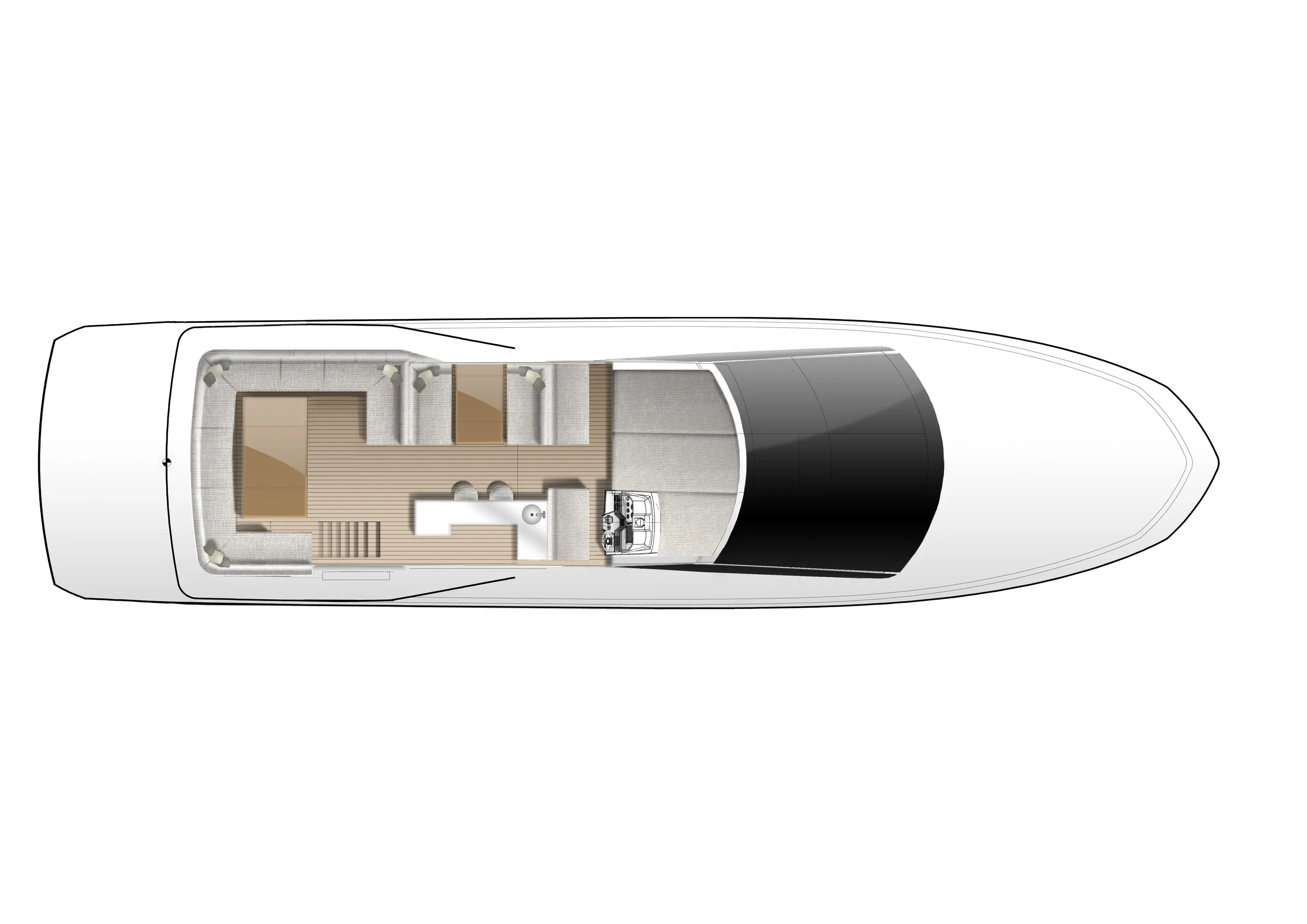 Outside, the aft cockpit dining area holds eight people who can enjoy an entertainment system with a 40 inch TV sliding up from the kitchen top, all while protected from the elements by the electric aft sunshade. Further back, find the hydraulic bath platform capable of handling all water paraphernalia and a convenient access to a large skipper cabin.