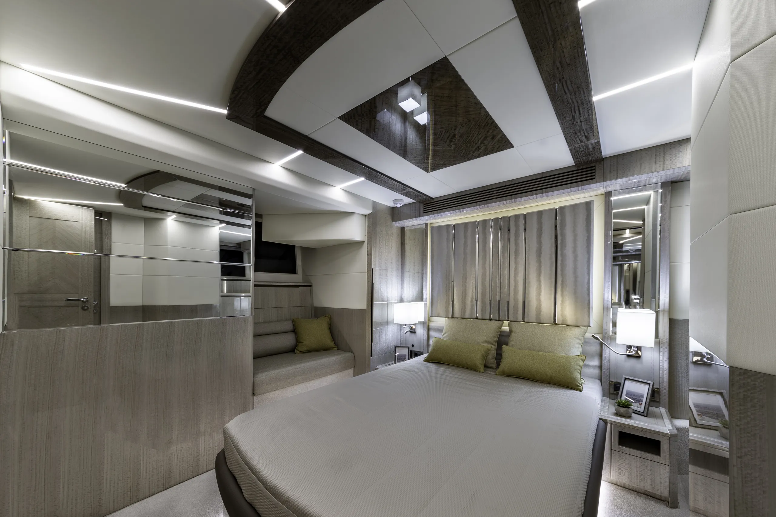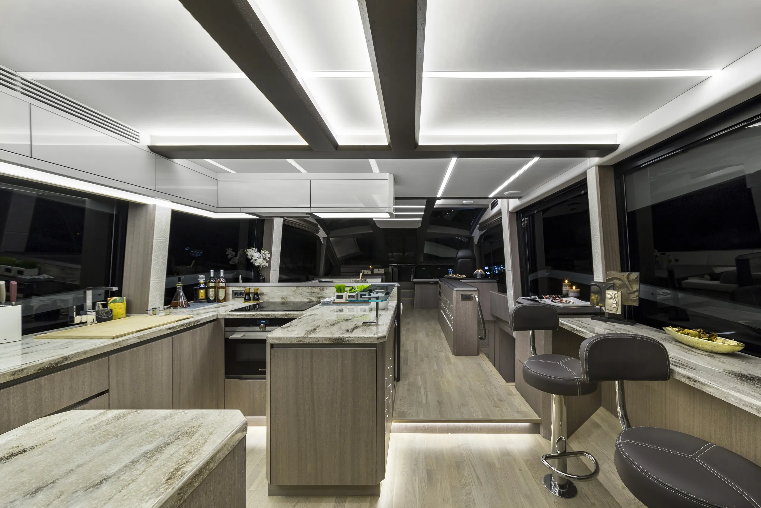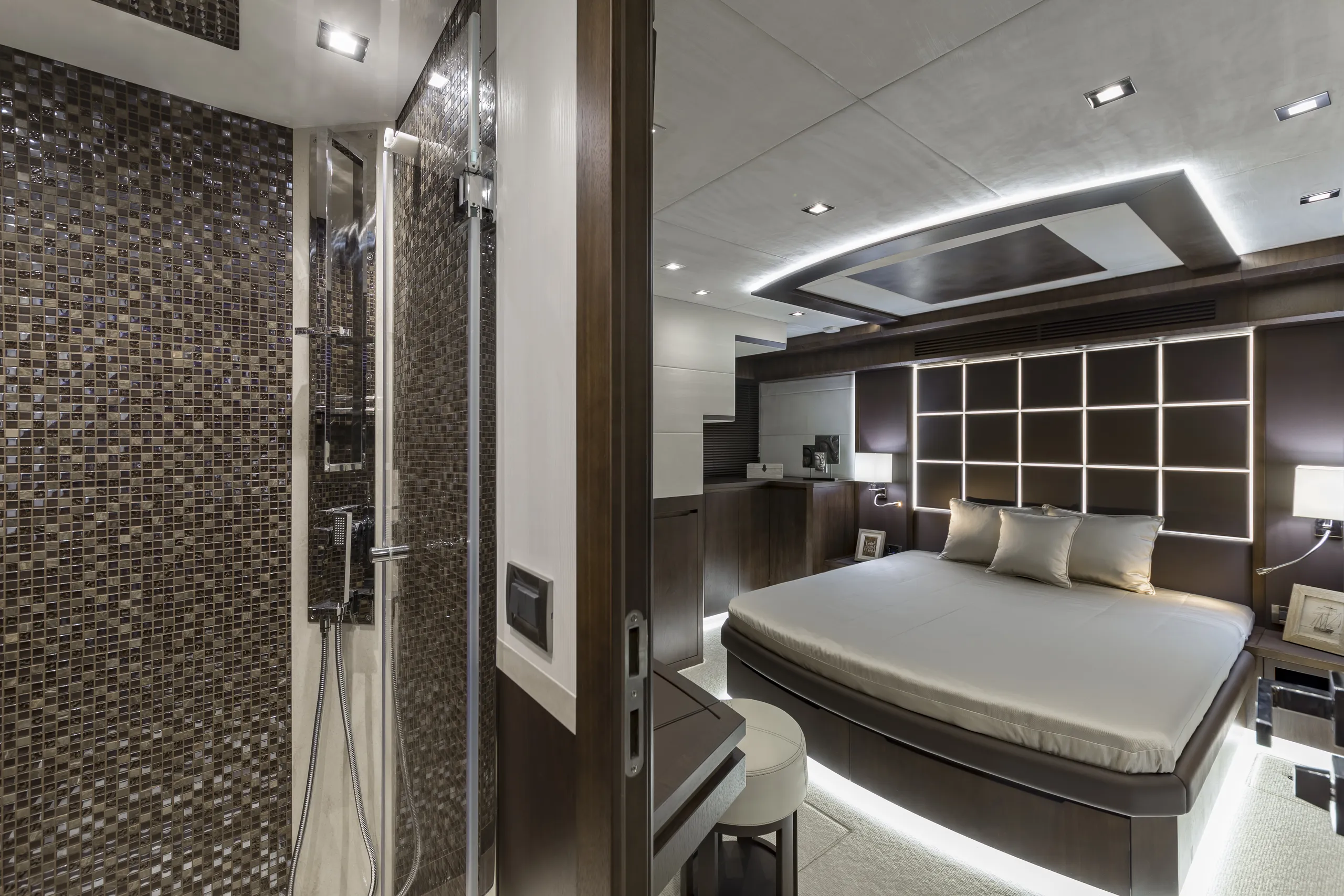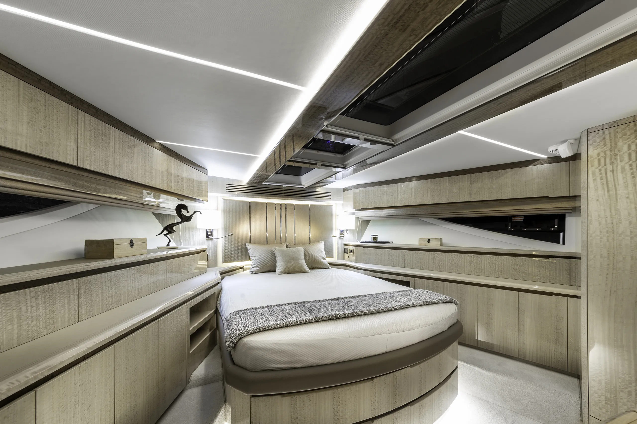 Outside, the aft cockpit dining area holds eight people who can enjoy an entertainment system with a 40 inch TV sliding up from the kitchen top, all while protected from the elements by the electric aft sunshade. Further back, find the hydraulic bath platform capable of handling all water paraphernalia and a convenient access to a large skipper cabin.