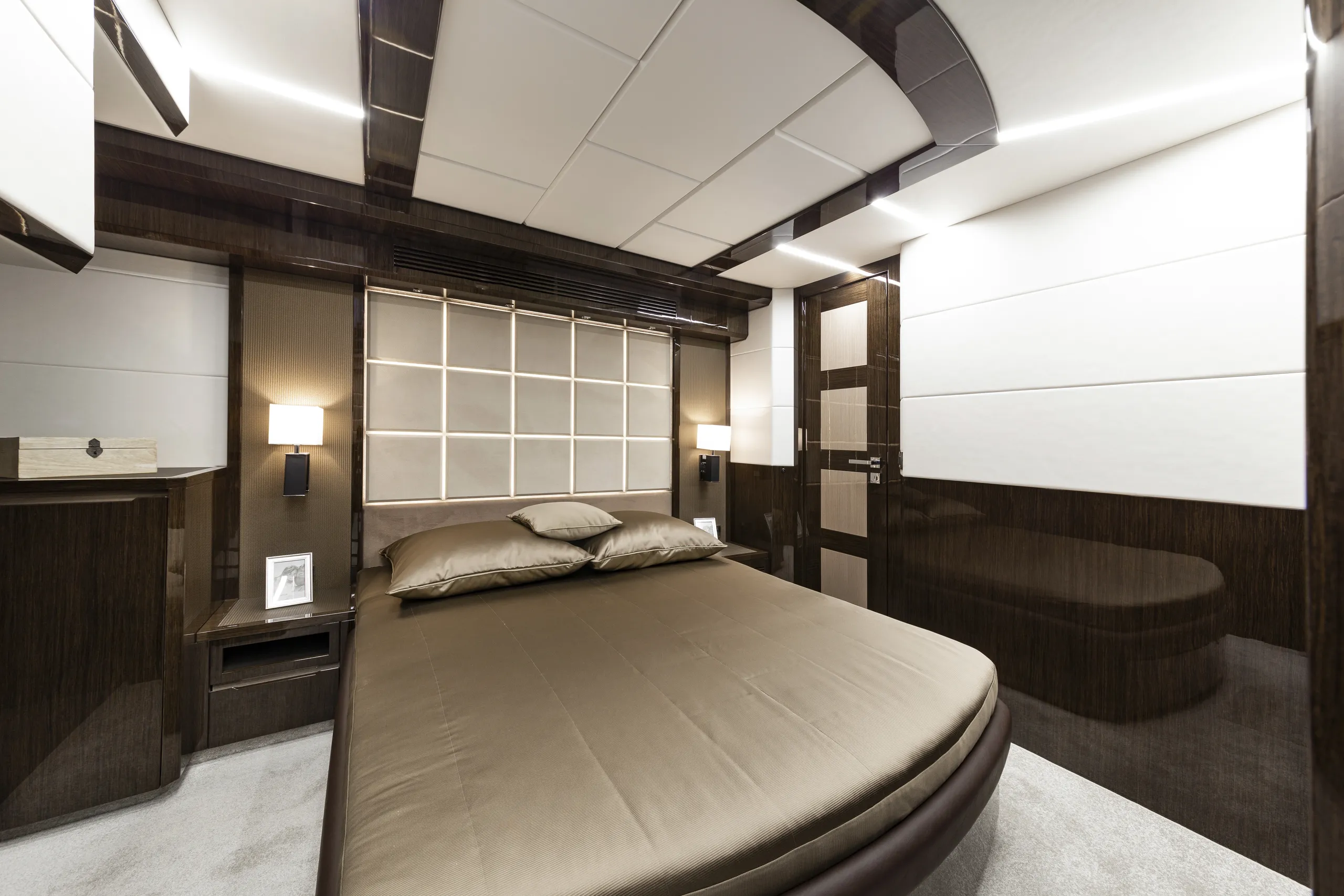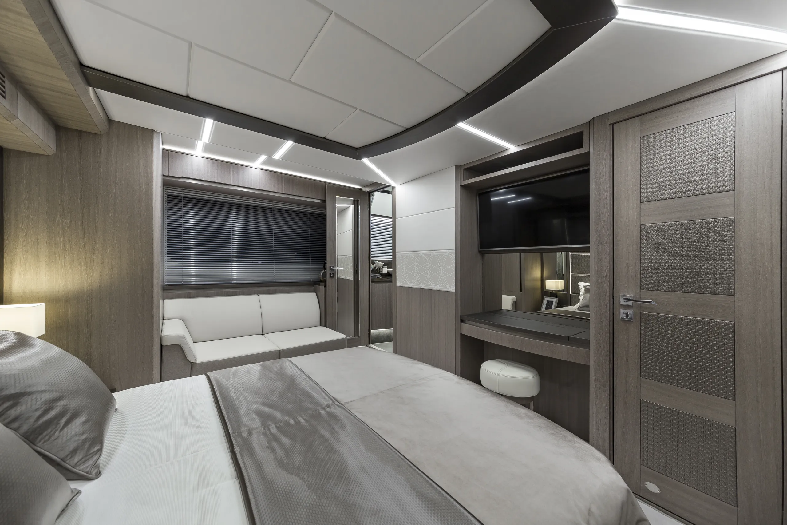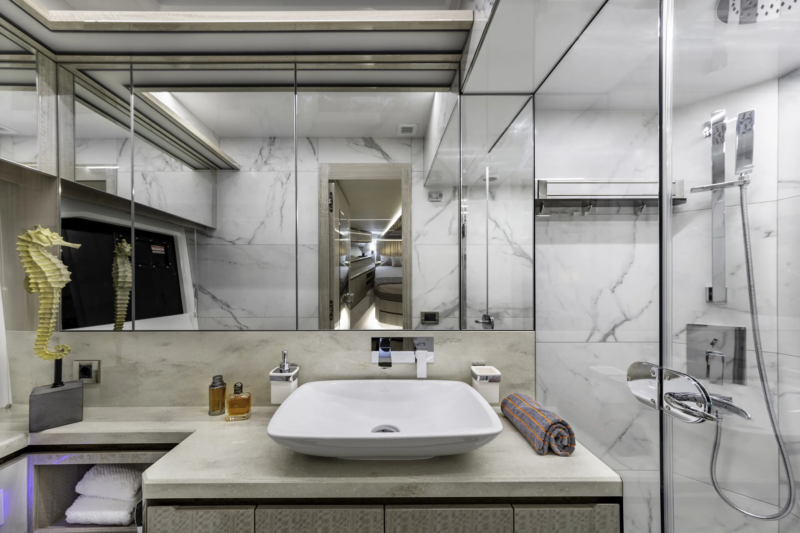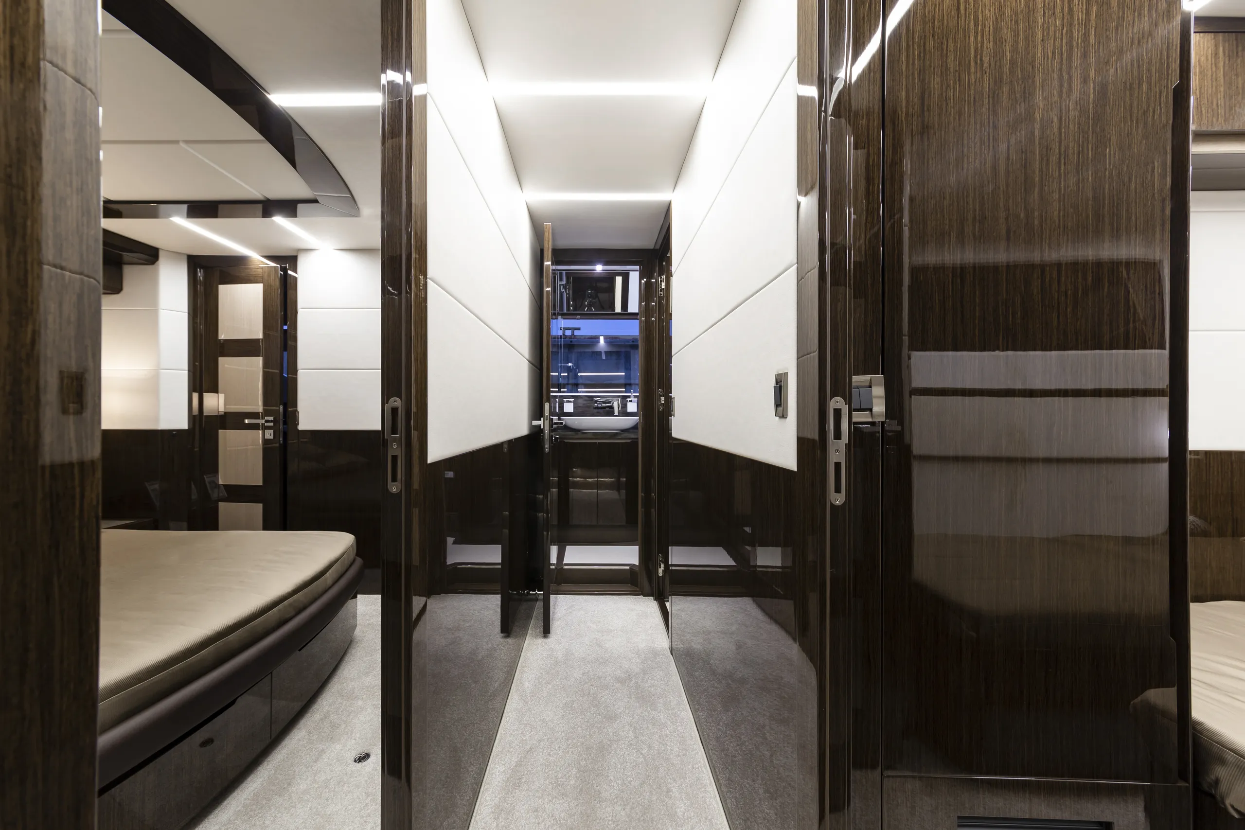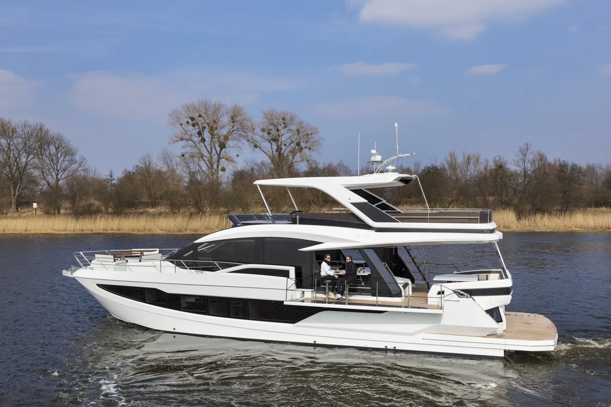 Outside, the aft cockpit dining area holds eight people who can enjoy an entertainment system with a 40 inch TV sliding up from the kitchen top, all while protected from the elements by the electric aft sunshade. Further back, find the hydraulic bath platform capable of handling all water paraphernalia and a convenient access to a large skipper cabin.