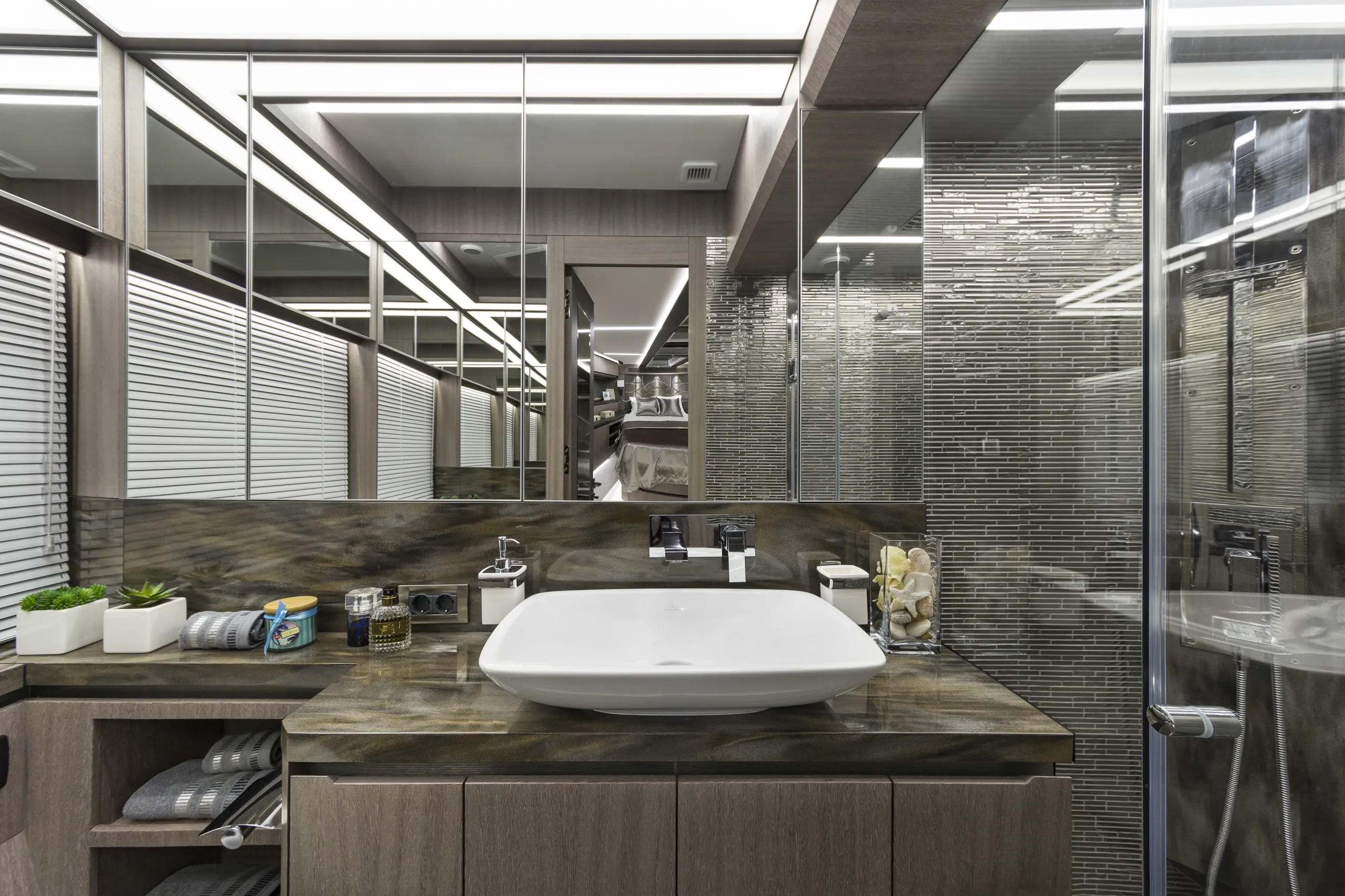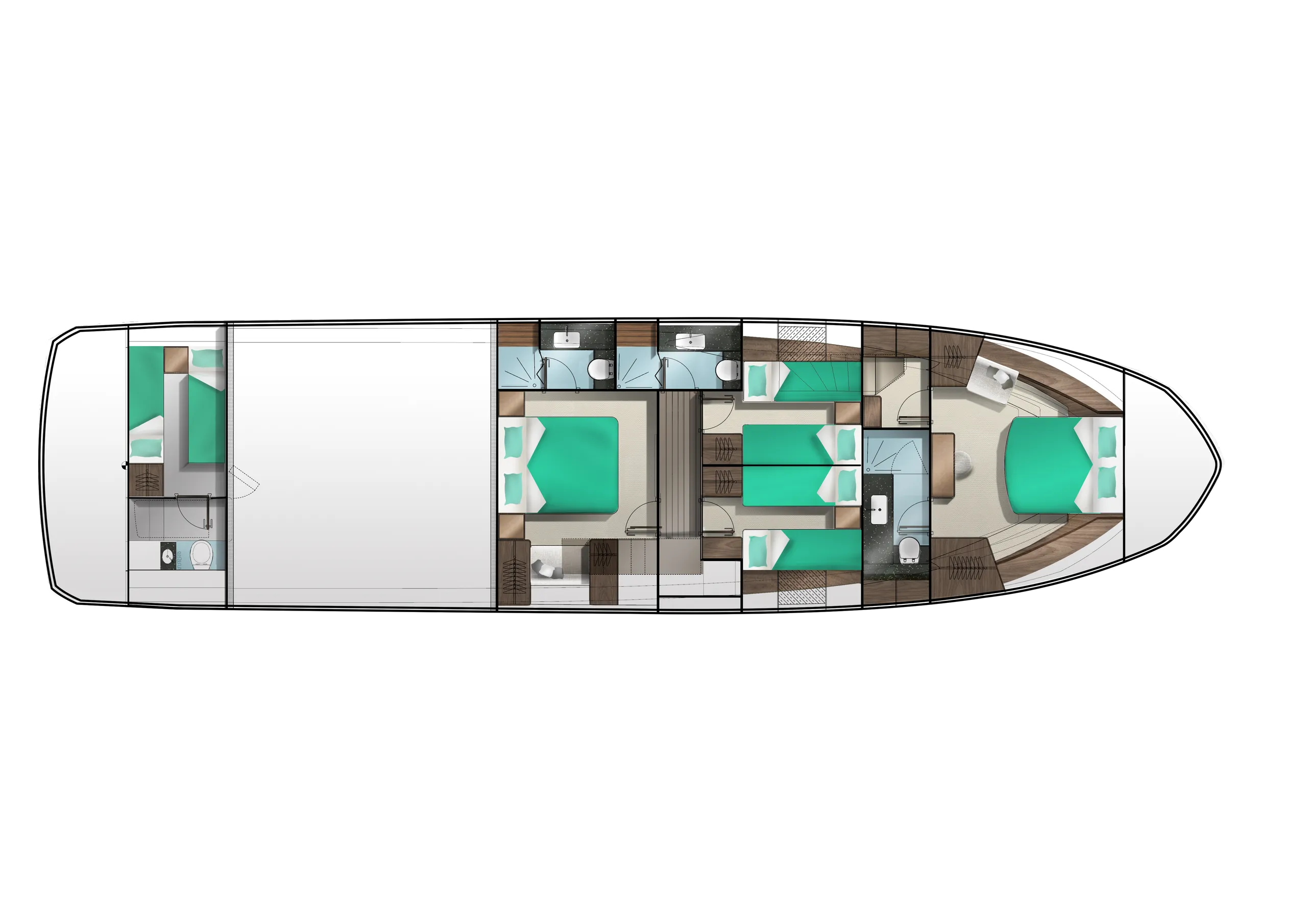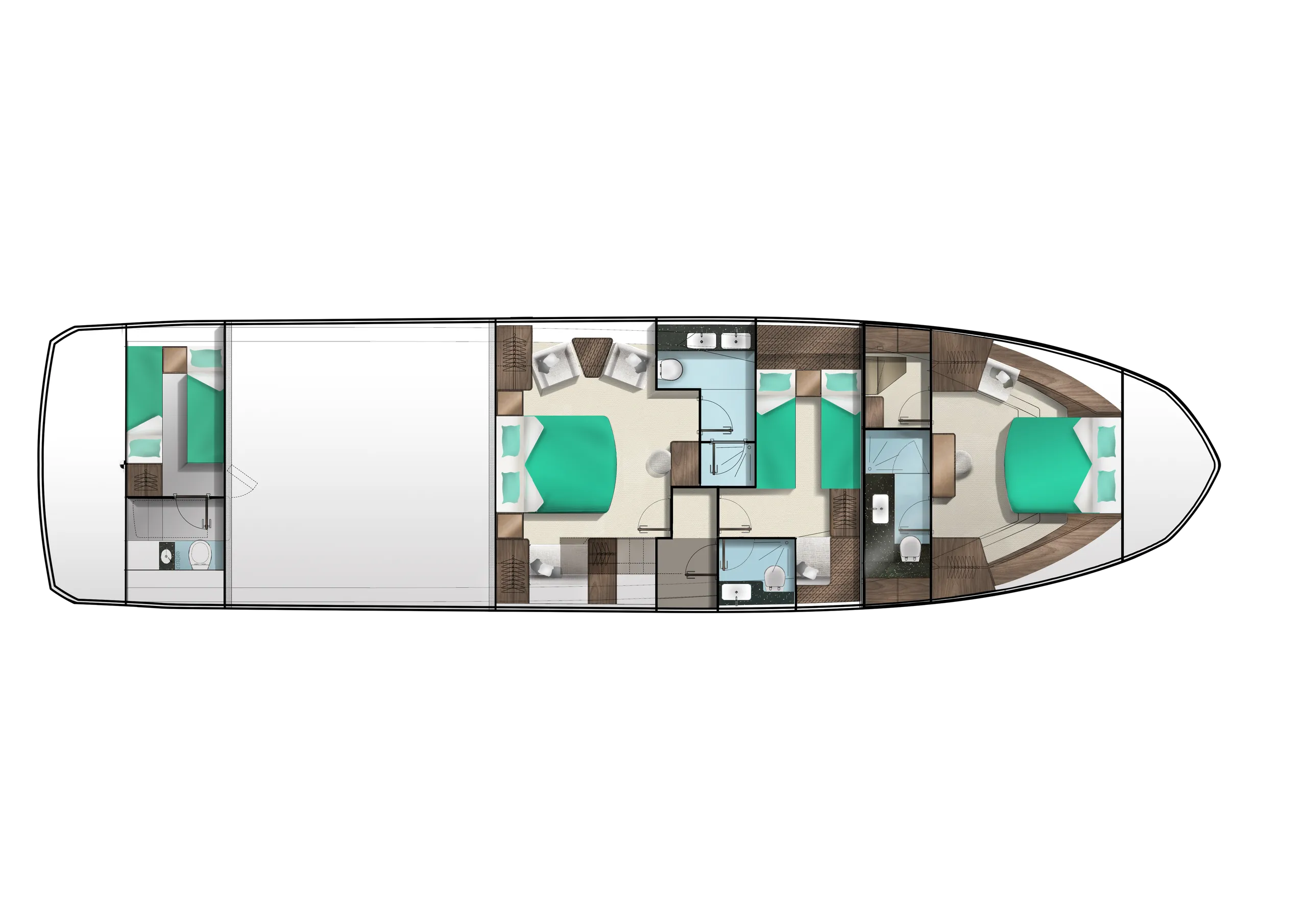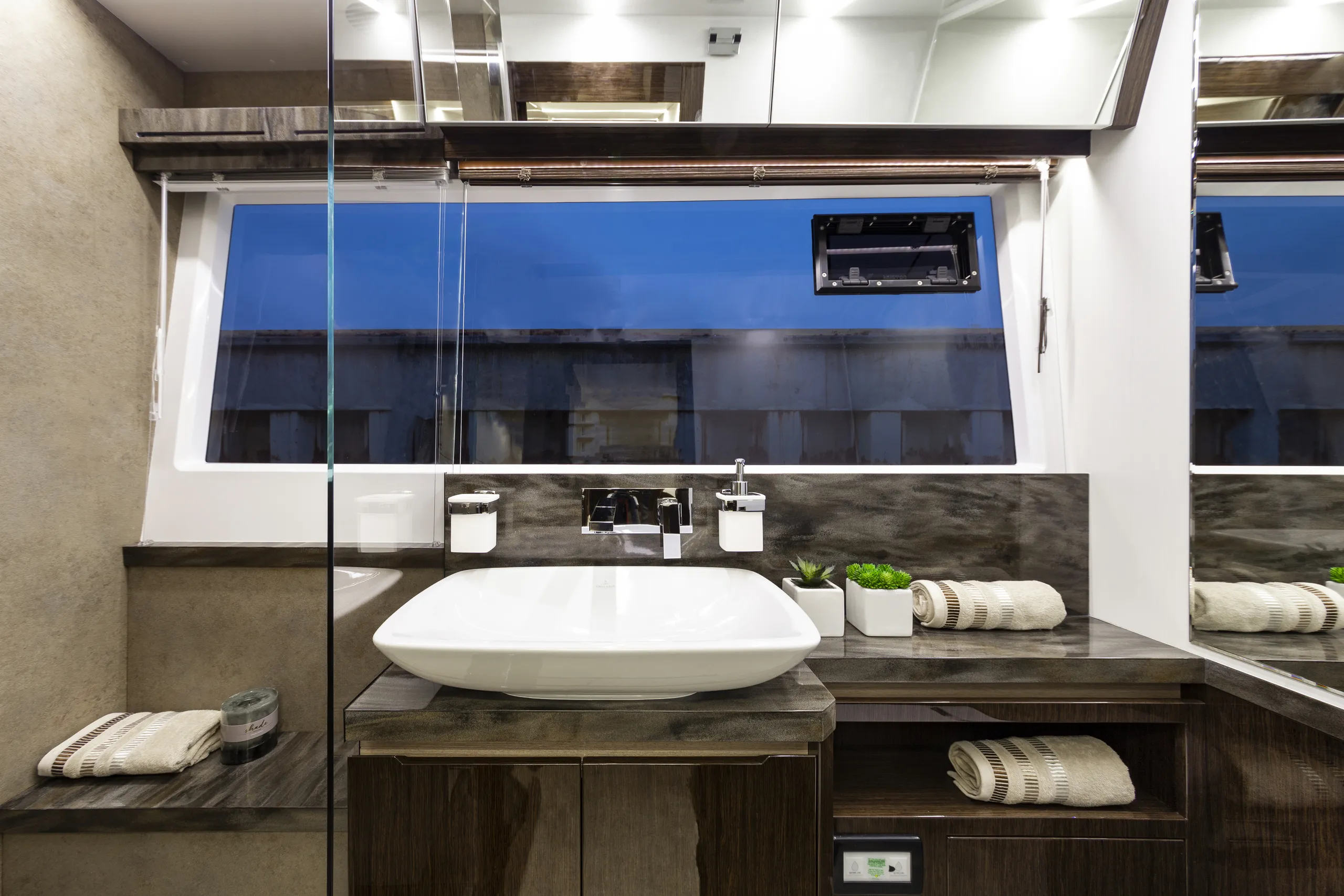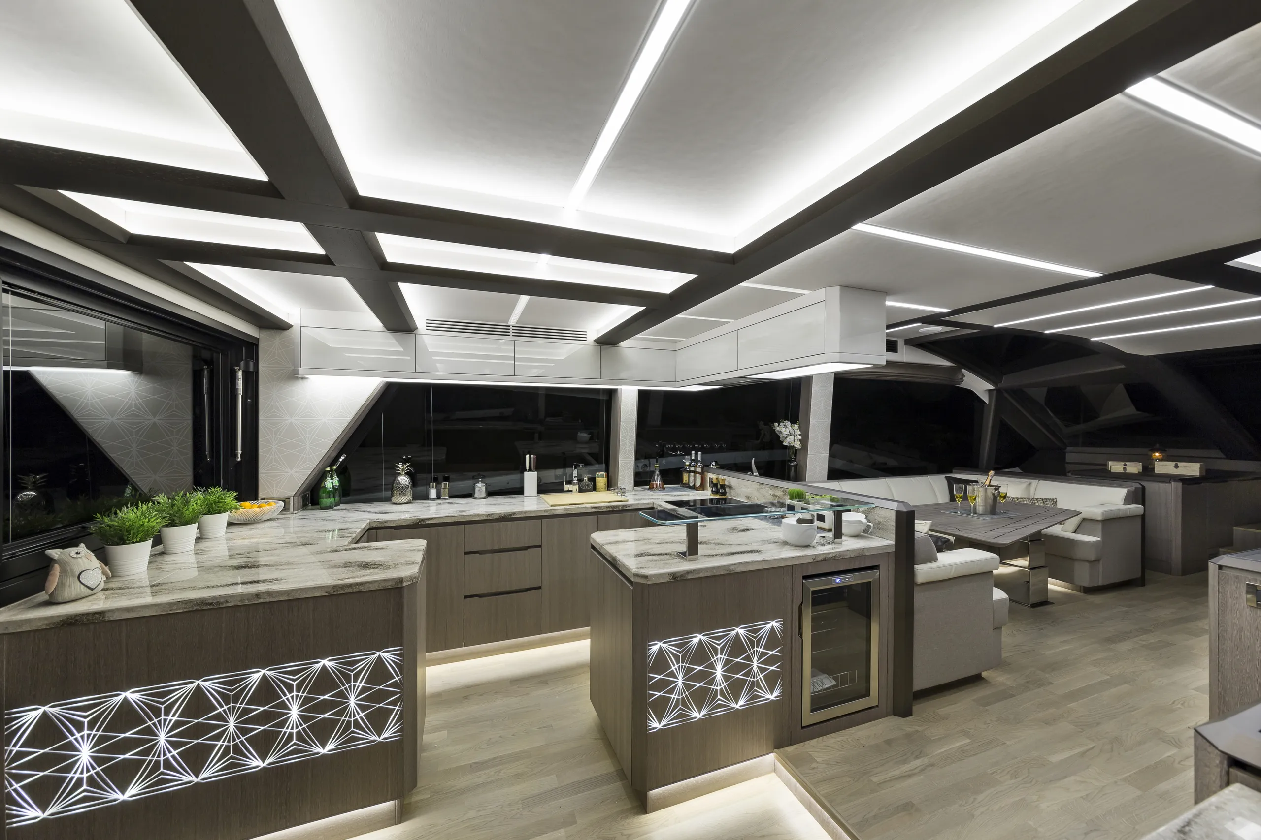 Outside, the aft cockpit dining area holds eight people who can enjoy an entertainment system with a 40 inch TV sliding up from the kitchen top, all while protected from the elements by the electric aft sunshade. Further back, find the hydraulic bath platform capable of handling all water paraphernalia and a convenient access to a large skipper cabin.