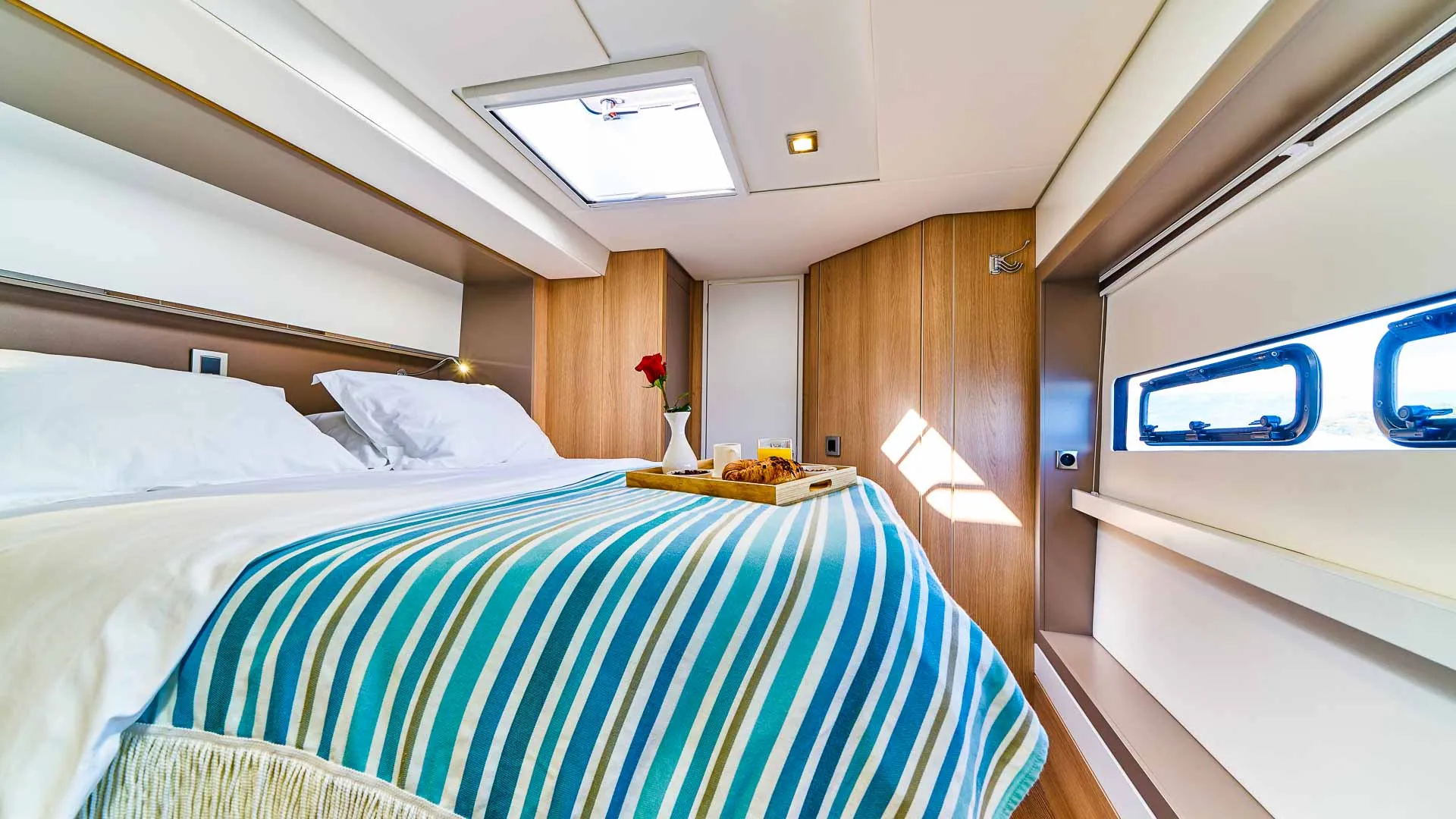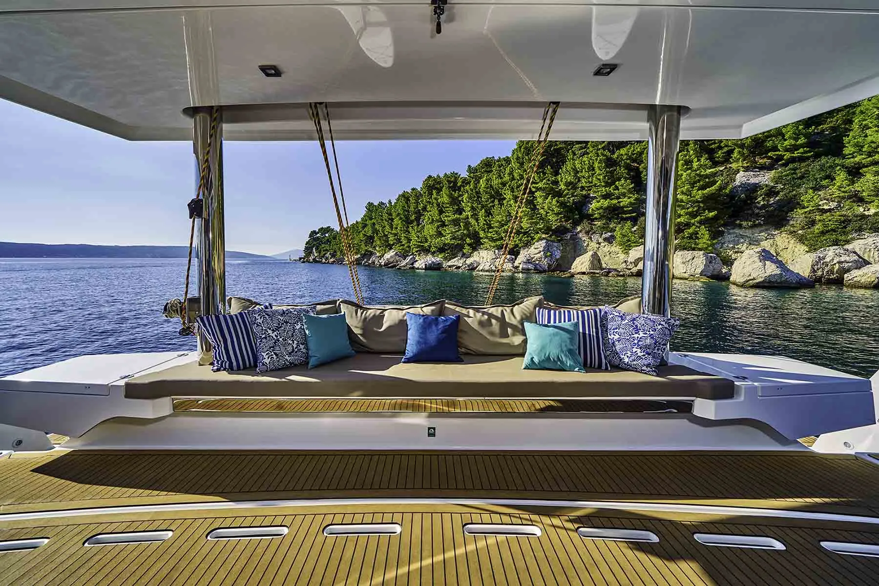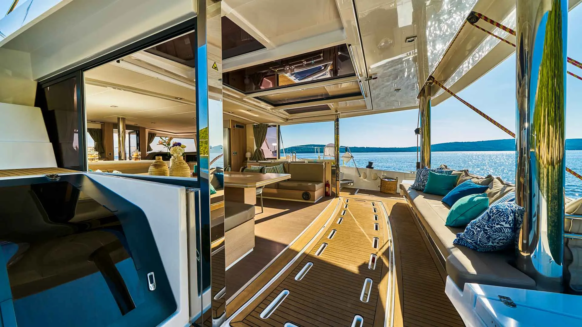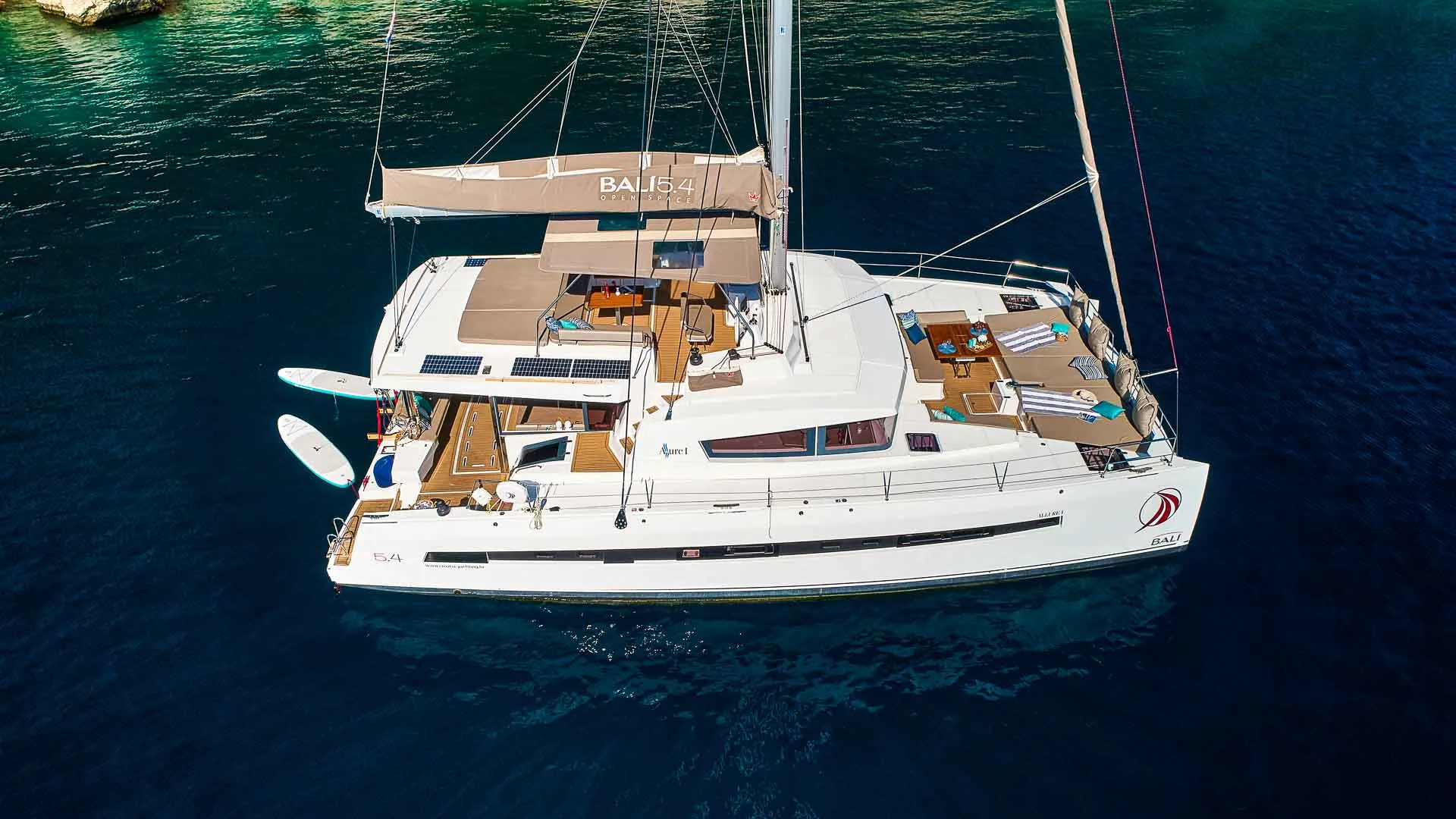 Wnętrze Bali 5.4 jest równie niezwykłe. Przede wszystkim, unikalny salon, ozdobiony dużymi oknami, które zalewają przestrzeń naturalnym światłem, oferuje niezwykłą ilość miejsca. Ponadto, poniżej pokładu czeka sześć luksusowych kabin z łazienkami, każda oferująca prywatne sanktuarium do relaksu i regeneracji.