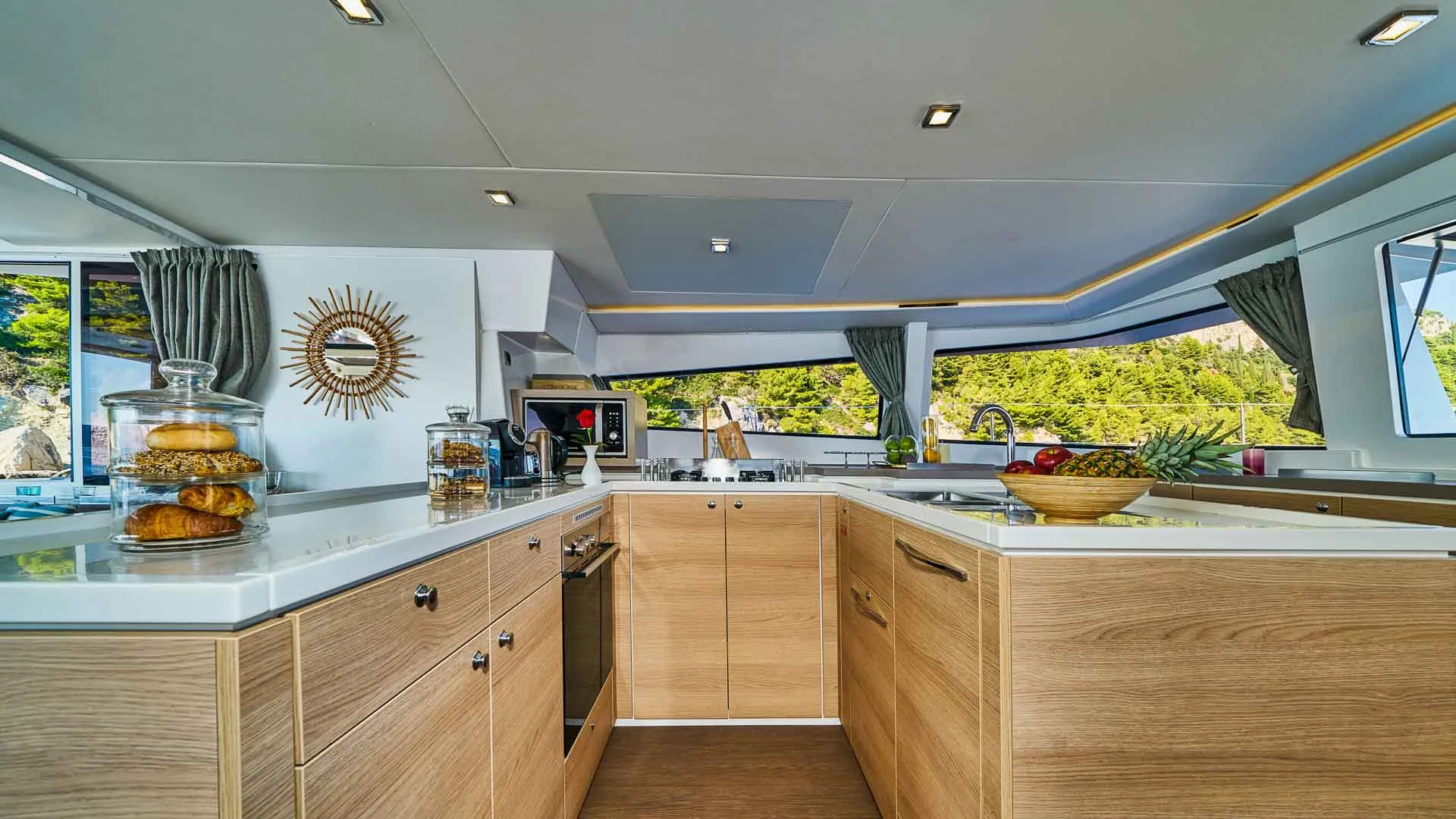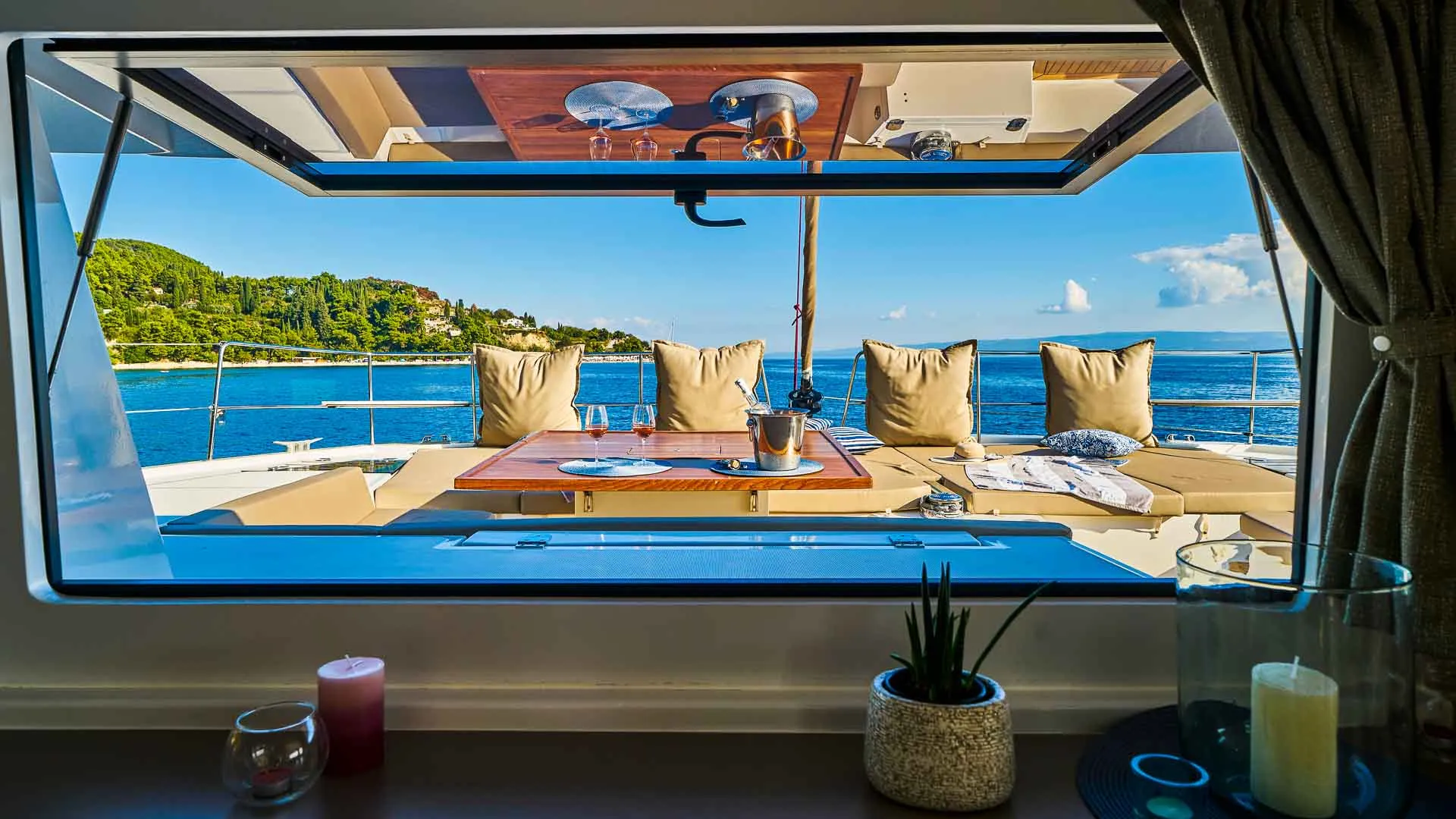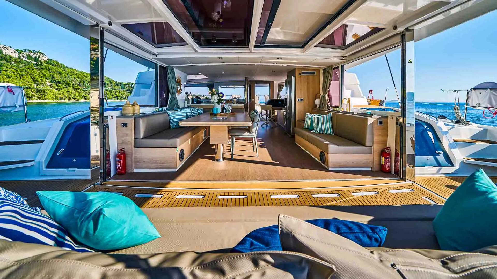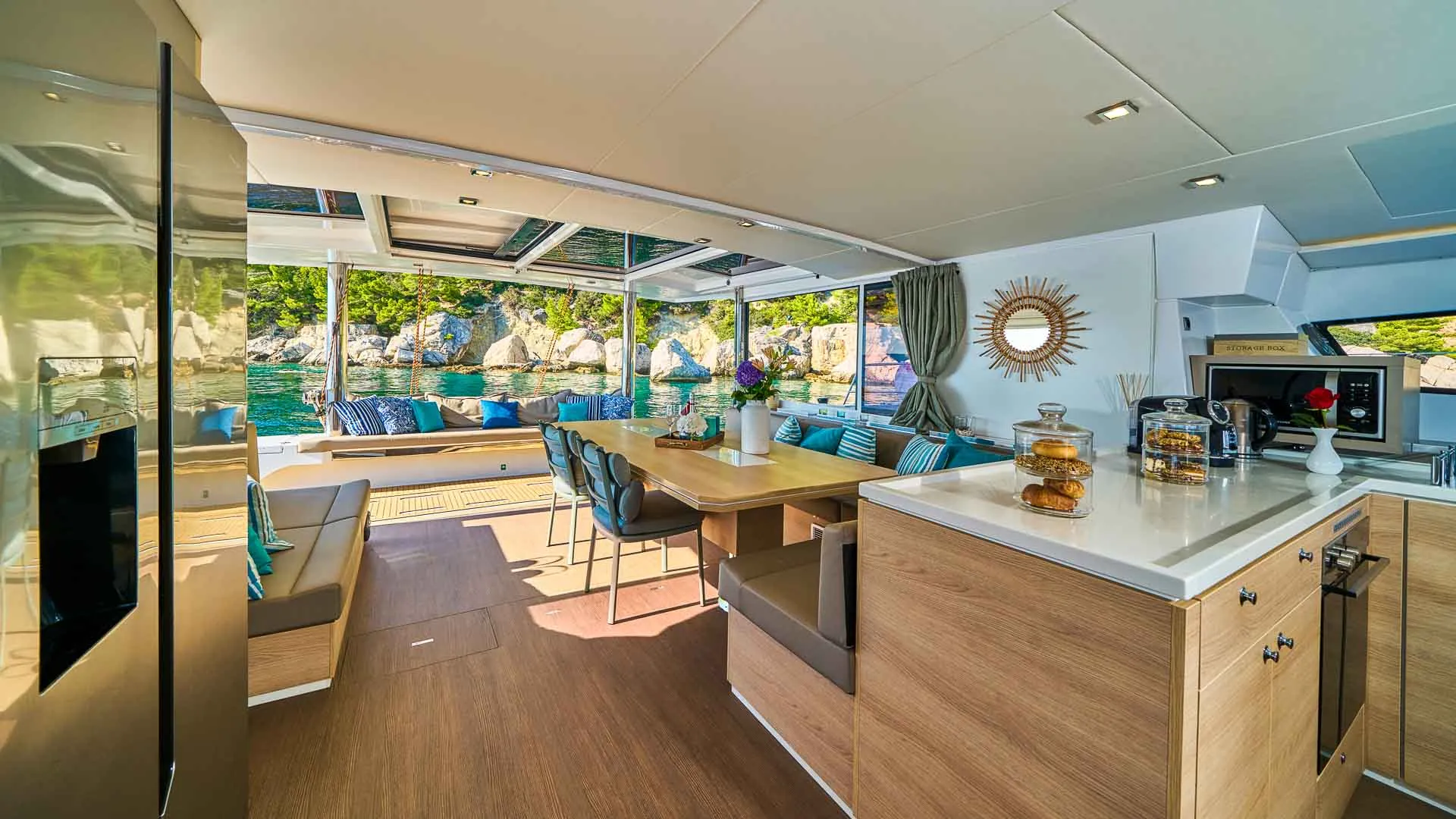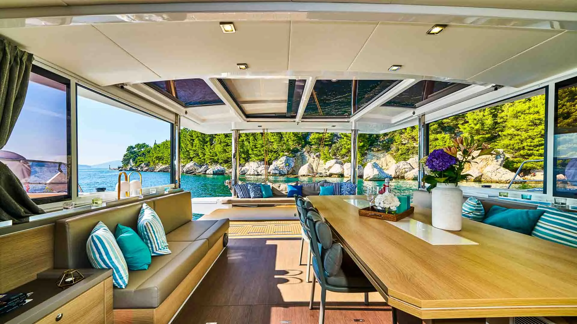 Wnętrze Bali 5.4 jest równie niezwykłe. Przede wszystkim, unikalny salon, ozdobiony dużymi oknami, które zalewają przestrzeń naturalnym światłem, oferuje niezwykłą ilość miejsca. Ponadto, poniżej pokładu czeka sześć luksusowych kabin z łazienkami, każda oferująca prywatne sanktuarium do relaksu i regeneracji.