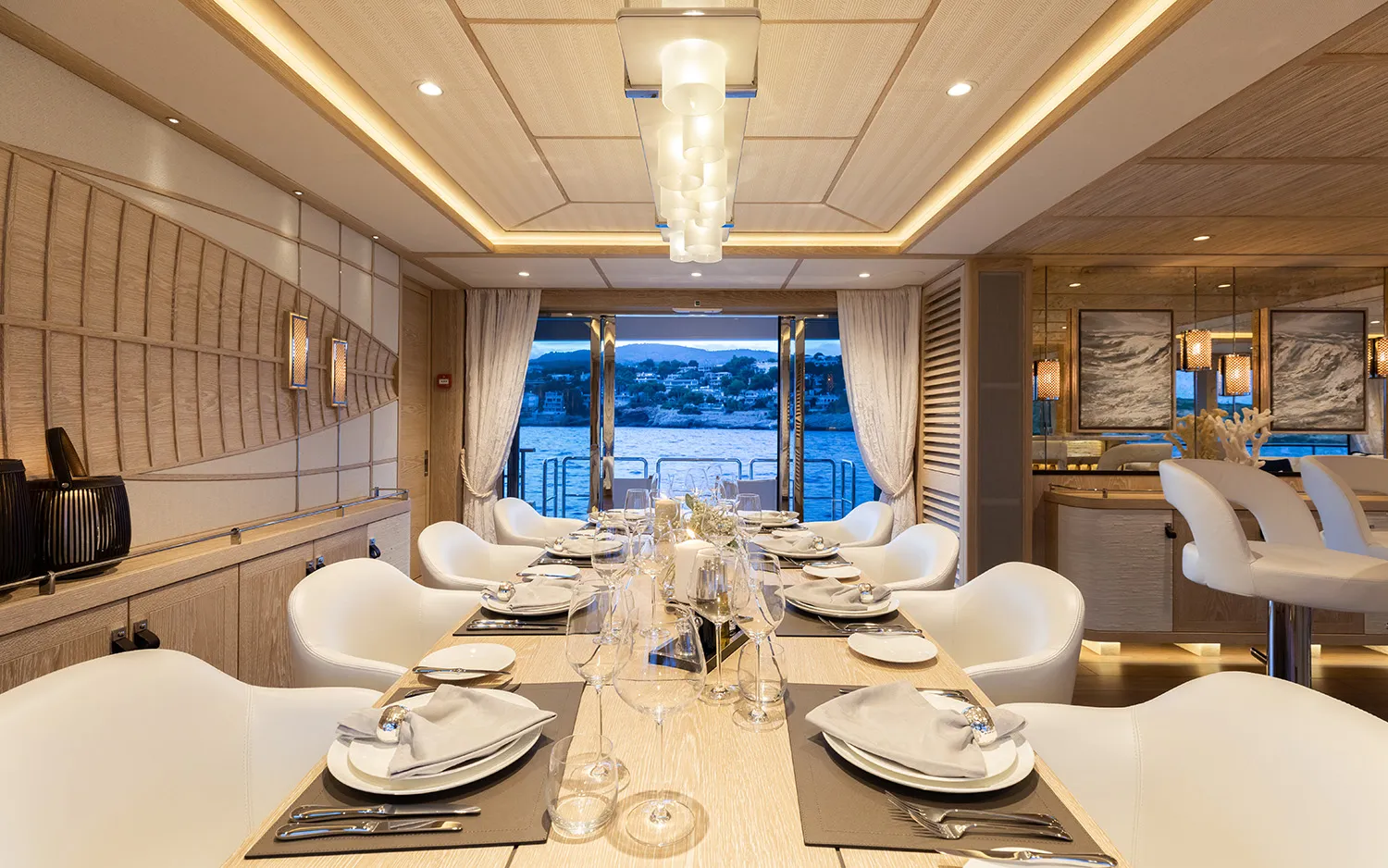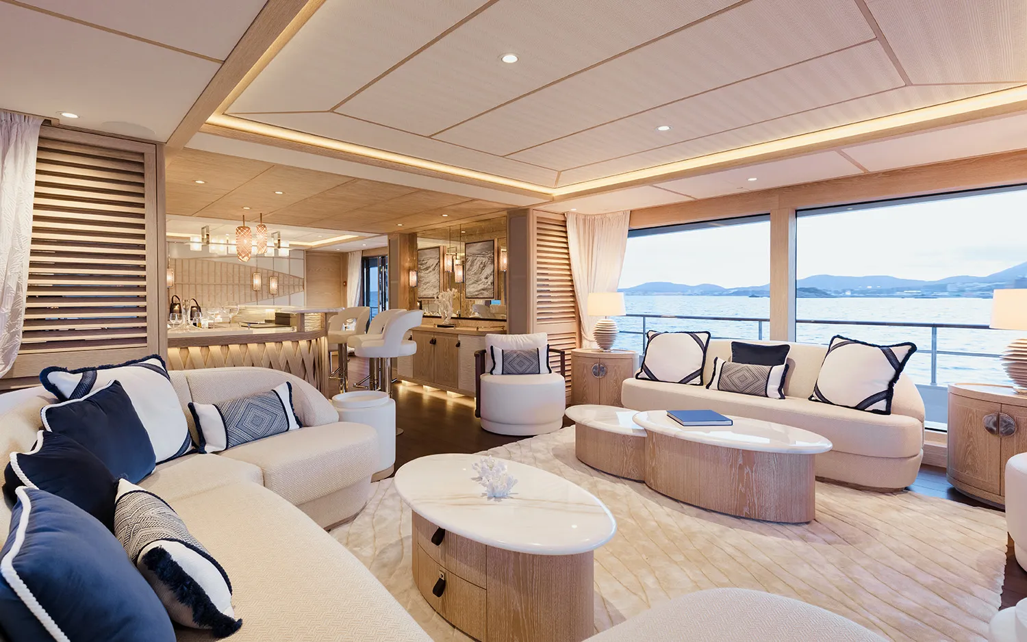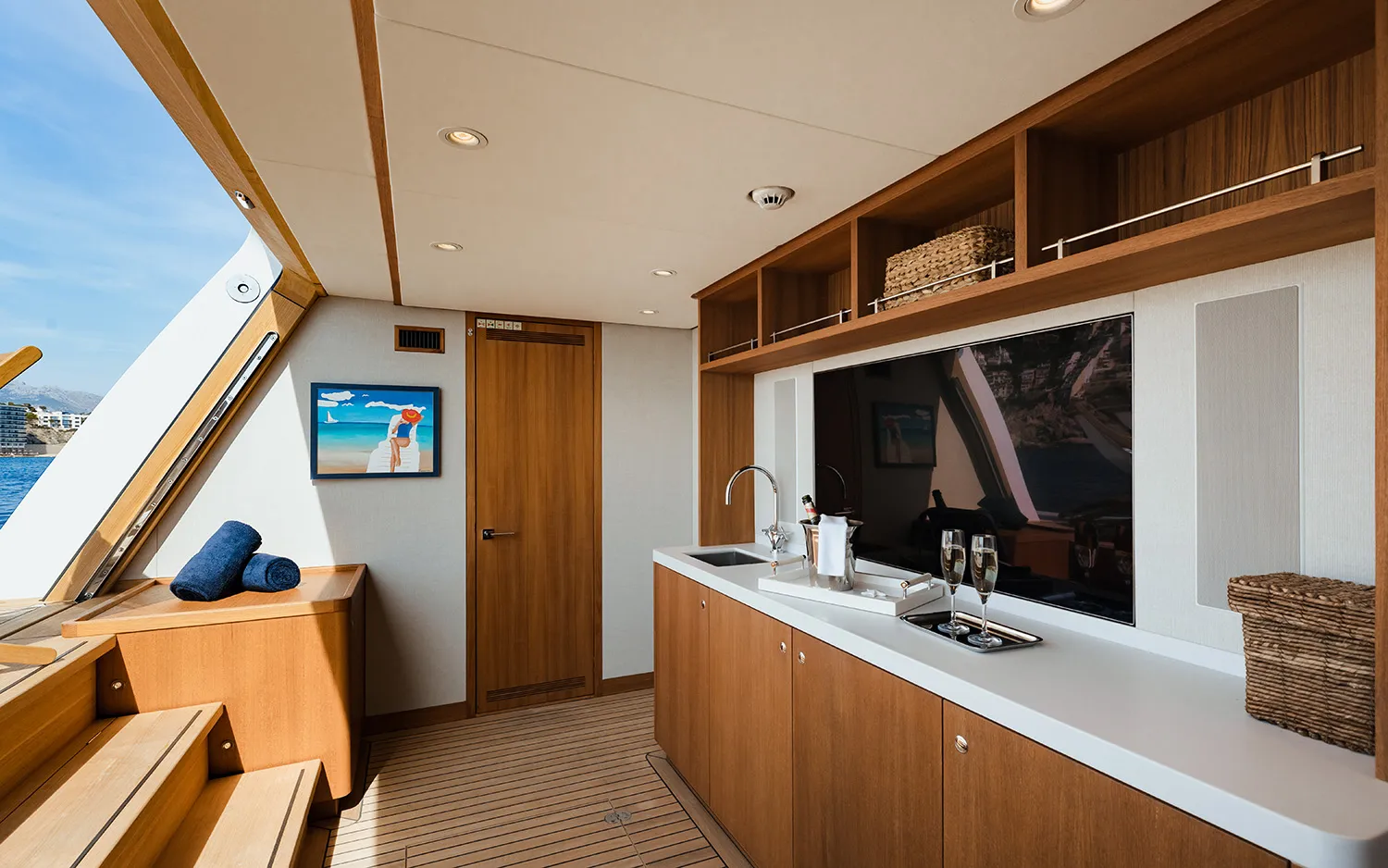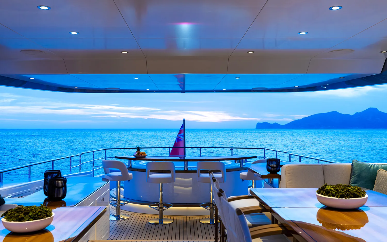 CALYPSO I łączy eleganckie linie Mulder z wydajnością kadłuba Van Oossanen FDHF, zapewniając płynne rejsy i niezwykłą stabilność. Przestronne zewnętrzne pokłady, duże jacuzzi na pokładzie słonecznym, obszerne strefy wypoczynkowe i w pełni wyposażony klub plażowy tworzą eleganckie doświadczenie na świeżym powietrzu, zaprojektowane z myślą o słońcu, morzu i bezwysiłkowym relaksie.