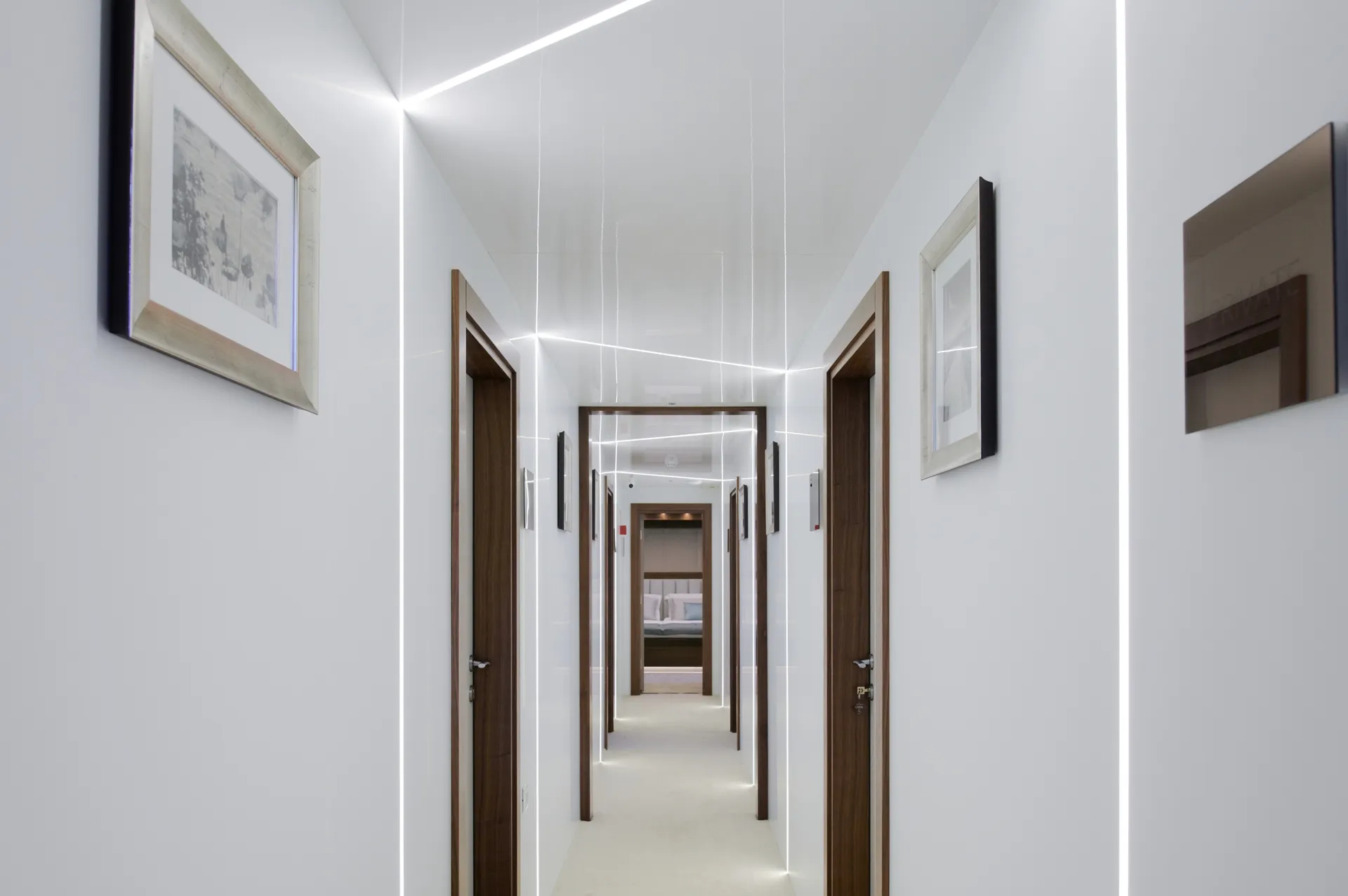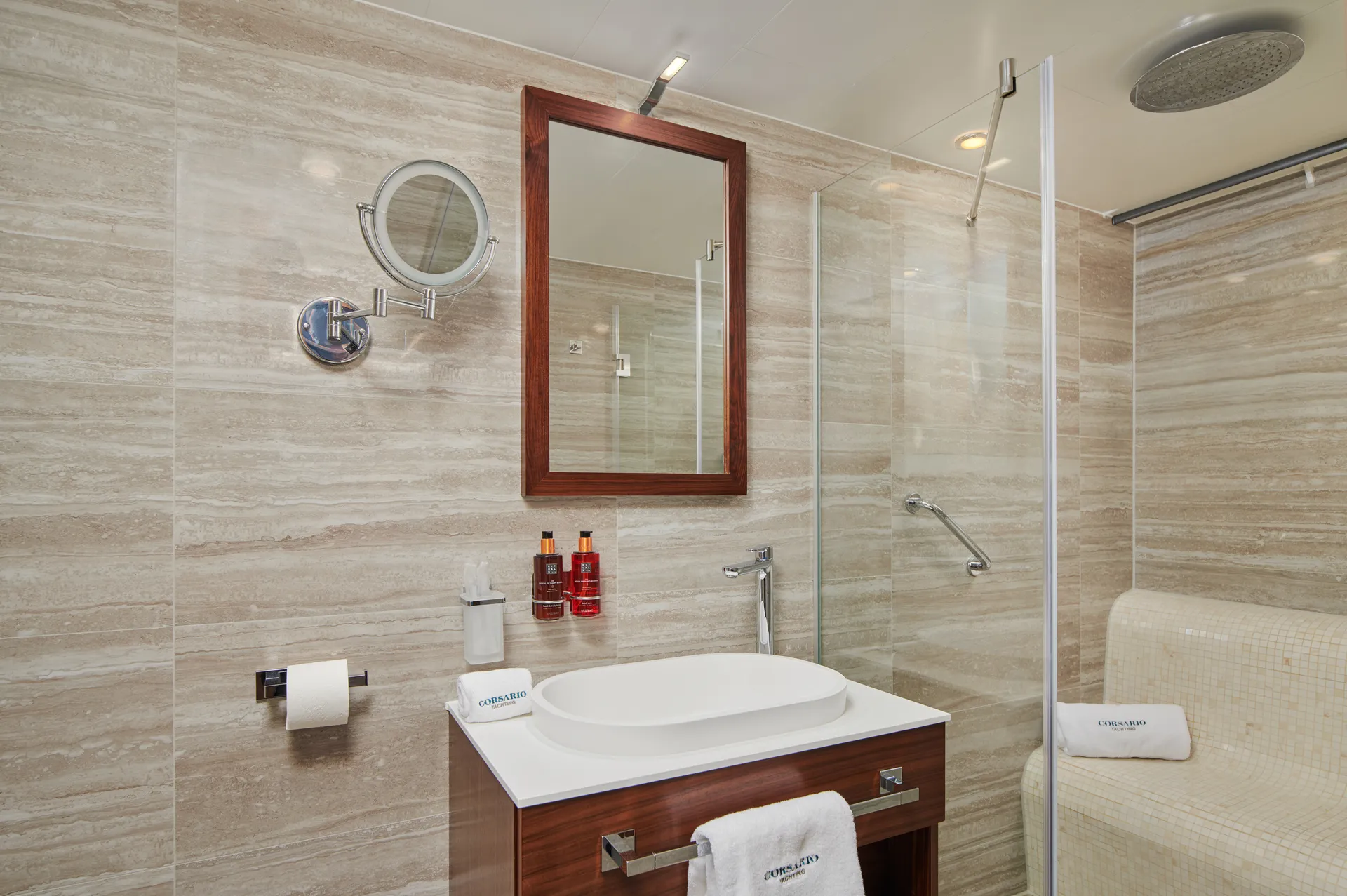 Specjalnie zaprojektowany Corsario oferuje zakwaterowanie w sześciu stylowych kabinach: apartamencie Master, kabinie VIP, dwóch kabinach dwuosobowych i dwóch kabinach z dwoma łóżkami. Zarówno kabiny Master, jak i VIP są wyposażone w ogrzewanie podłogowe w łazienkach, co czyni Corsario doskonałym wyborem na czartery poza sezonem. Dodatkowa siódma kabina jest dostępna dla niani, masażystki lub innego personelu osobistego, jeśli wszystkie kabiny gościnne są zajęte.