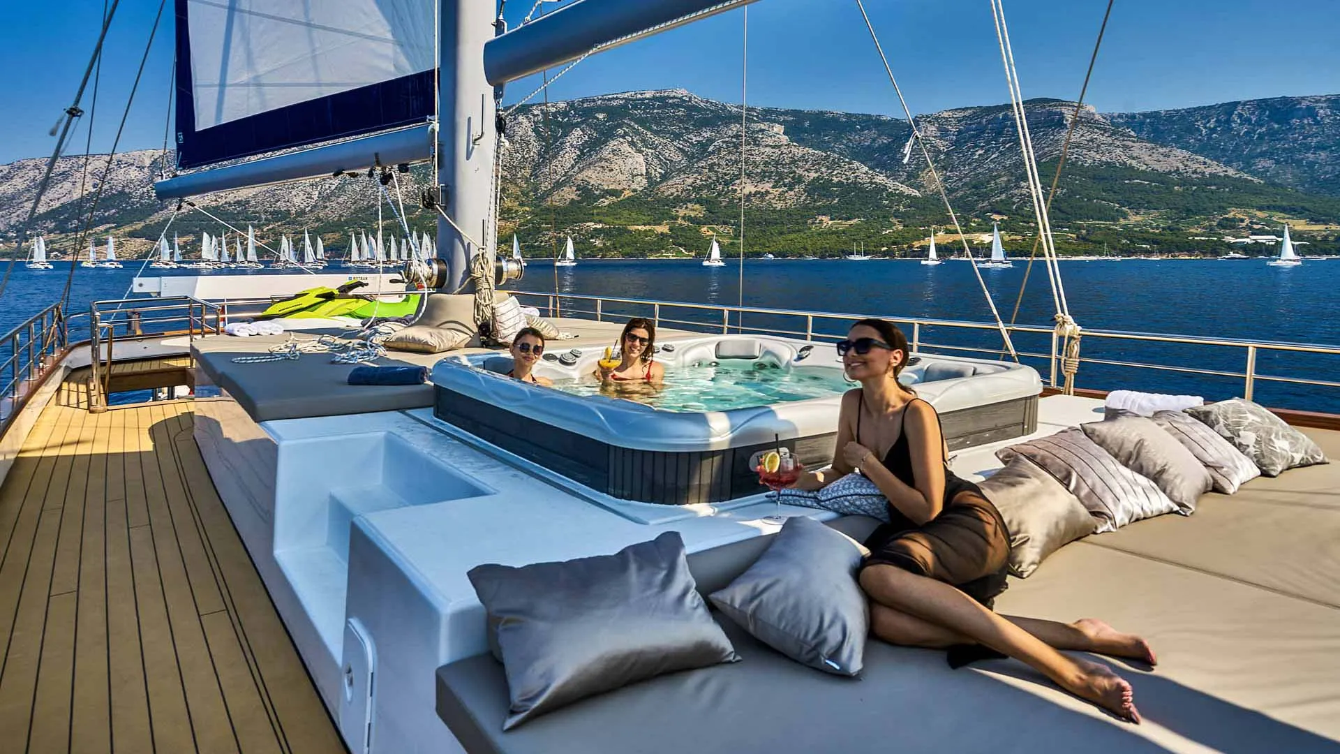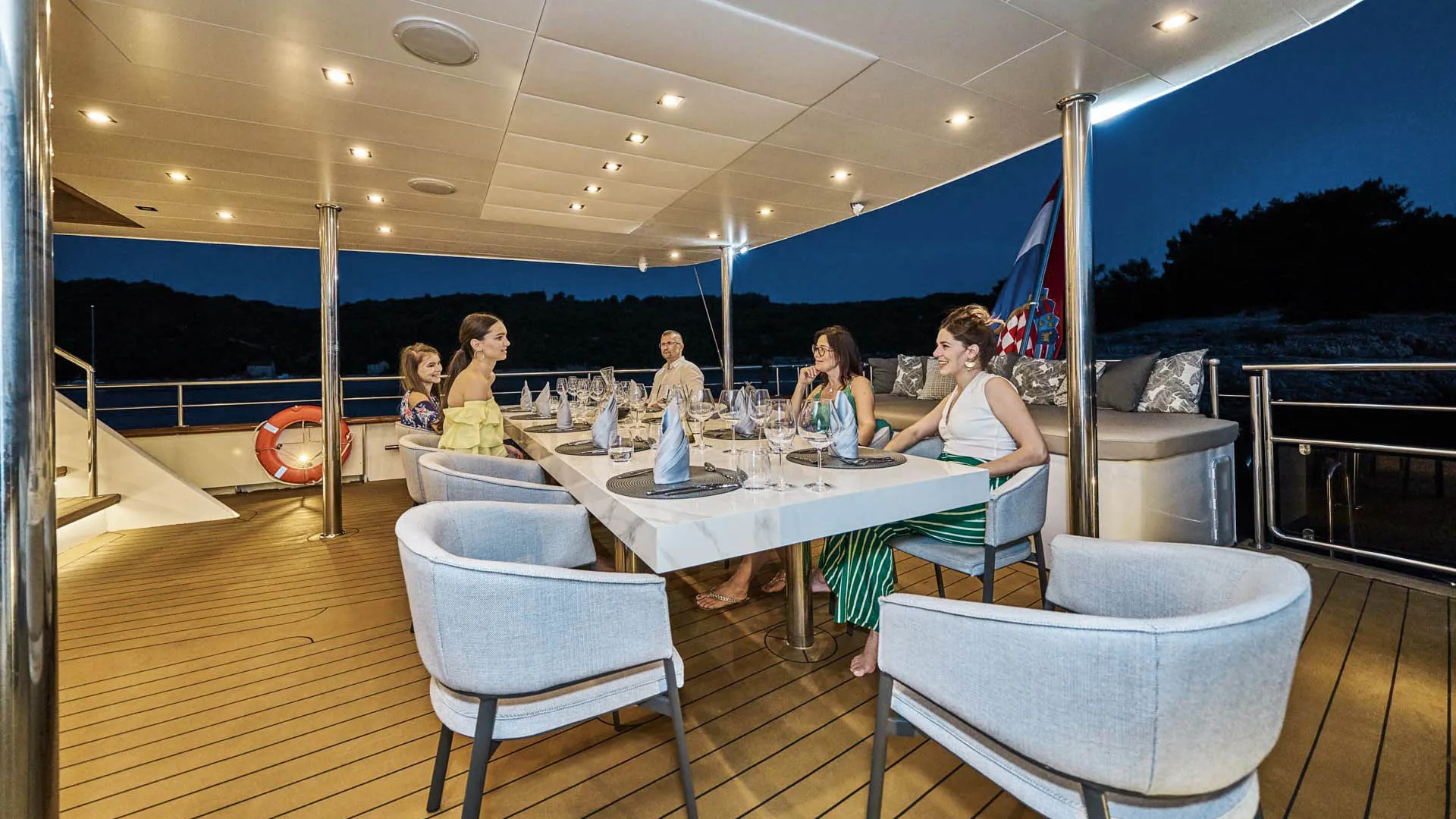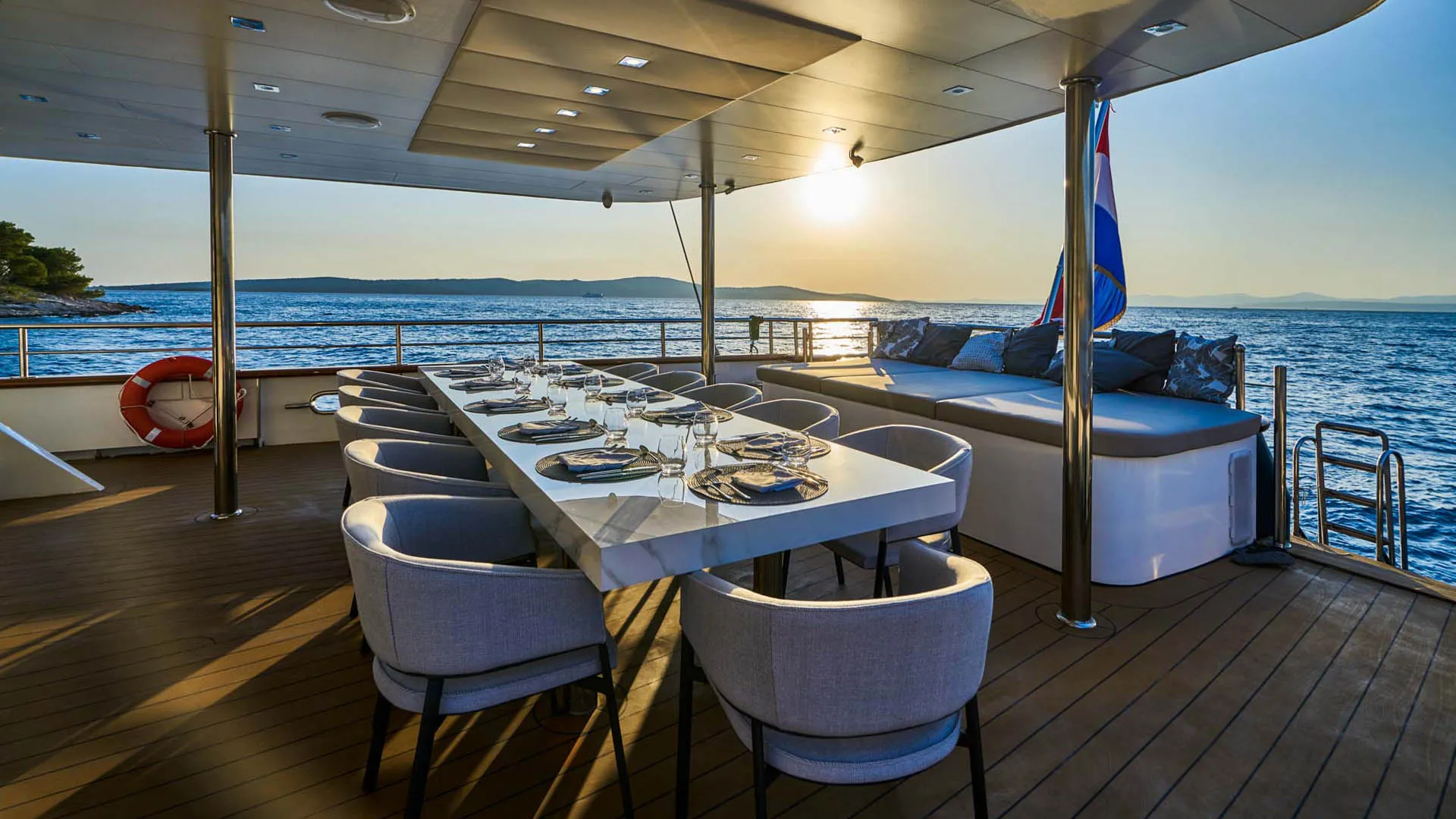 43-metrowy jacht Dalmatino oferuje urocze i przestronne przestrzenie na zewnątrz, idealne na wymarzone wakacyjne chwile. Na szczycie wszystkiego, pokład słoneczny jachtu Dalmatino z linii custom posiada urokliwą strefę do opalania z barem i kuszącym jacuzzi. Ciesz się wygodnymi leżakami i zacienioną strefą z mnóstwem poduszek. Dodatkowo, przednia część głównego pokładu oferuje kolejną strefę wypoczynkową do medytacyjnego opalania i pięknych widoków na Adriatyk. Podczas gorących letnich nocy, tylna część jadalna na głównym pokładzie to doskonałe miejsce na posiłki na świeżym powietrzu. Ponadto, ta strefa oferuje wyściełaną platformę do relaksu na poziomie 5-gwiazdkowym. Twardy dach zapewnia przyjemny cień, co sprawia, że tylna część jest ulubionym miejscem w środku dnia. Na koniec, na luksusowym jachcie Dalmatino znajdziesz urocze miejsce do pływania i mnóstwo sprzętu do sportów wodnych.