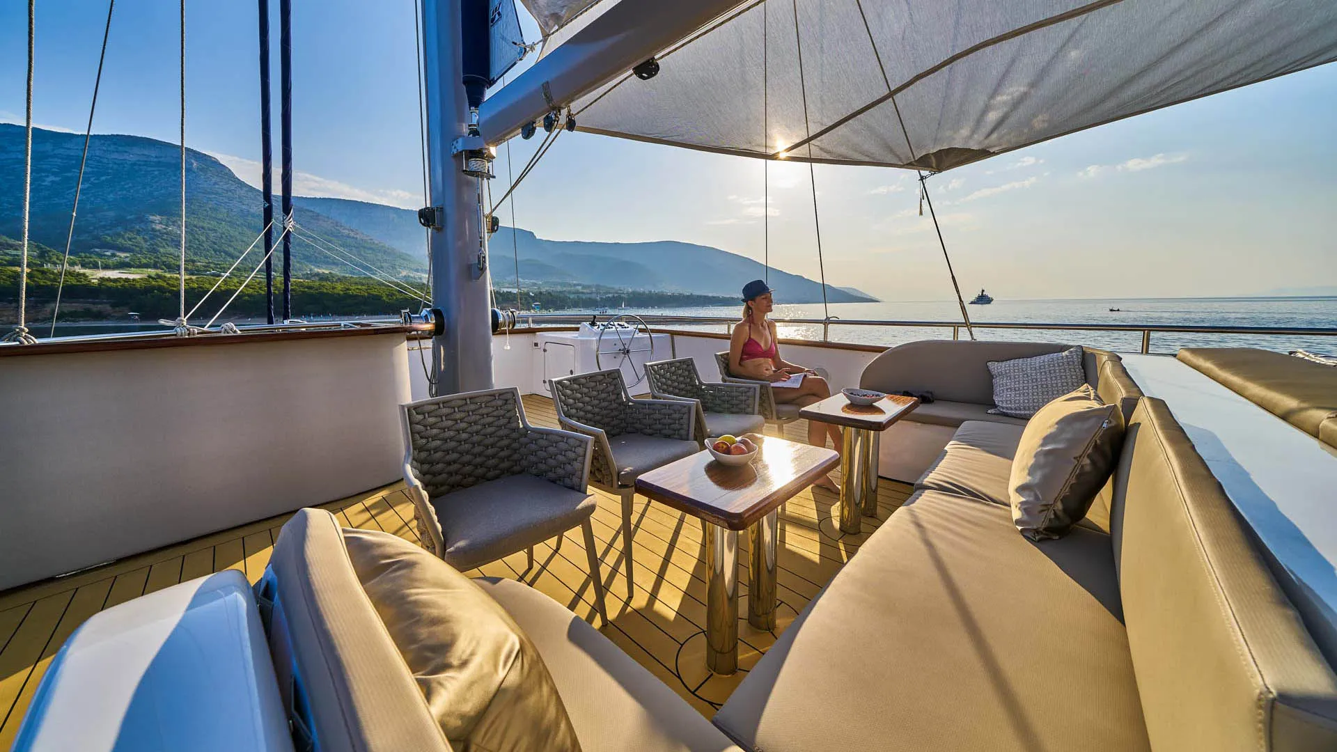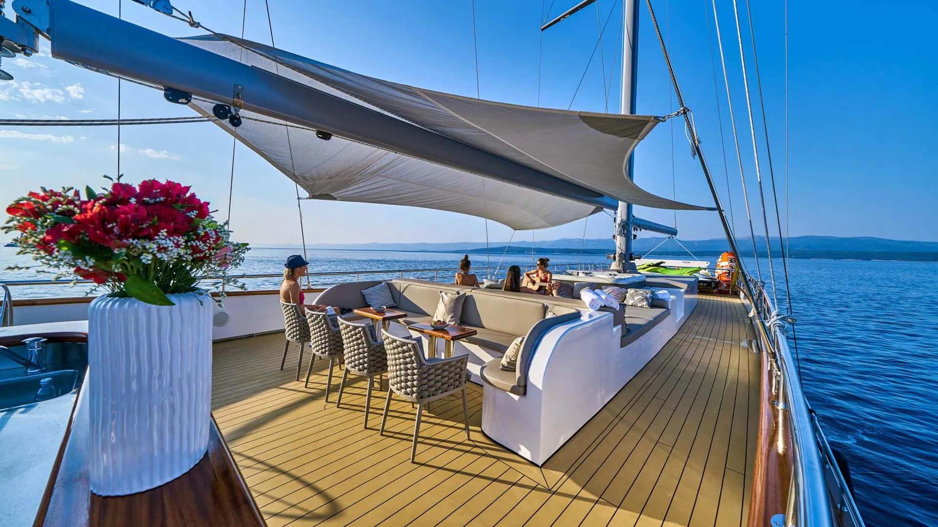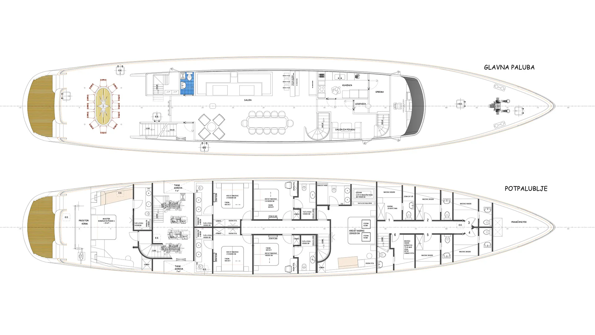 43-metrowy jacht Dalmatino oferuje urocze i przestronne przestrzenie na zewnątrz, idealne na wymarzone wakacyjne chwile. Na szczycie wszystkiego, pokład słoneczny jachtu Dalmatino z linii custom posiada urokliwą strefę do opalania z barem i kuszącym jacuzzi. Ciesz się wygodnymi leżakami i zacienioną strefą z mnóstwem poduszek. Dodatkowo, przednia część głównego pokładu oferuje kolejną strefę wypoczynkową do medytacyjnego opalania i pięknych widoków na Adriatyk. Podczas gorących letnich nocy, tylna część jadalna na głównym pokładzie to doskonałe miejsce na posiłki na świeżym powietrzu. Ponadto, ta strefa oferuje wyściełaną platformę do relaksu na poziomie 5-gwiazdkowym. Twardy dach zapewnia przyjemny cień, co sprawia, że tylna część jest ulubionym miejscem w środku dnia. Na koniec, na luksusowym jachcie Dalmatino znajdziesz urocze miejsce do pływania i mnóstwo sprzętu do sportów wodnych.