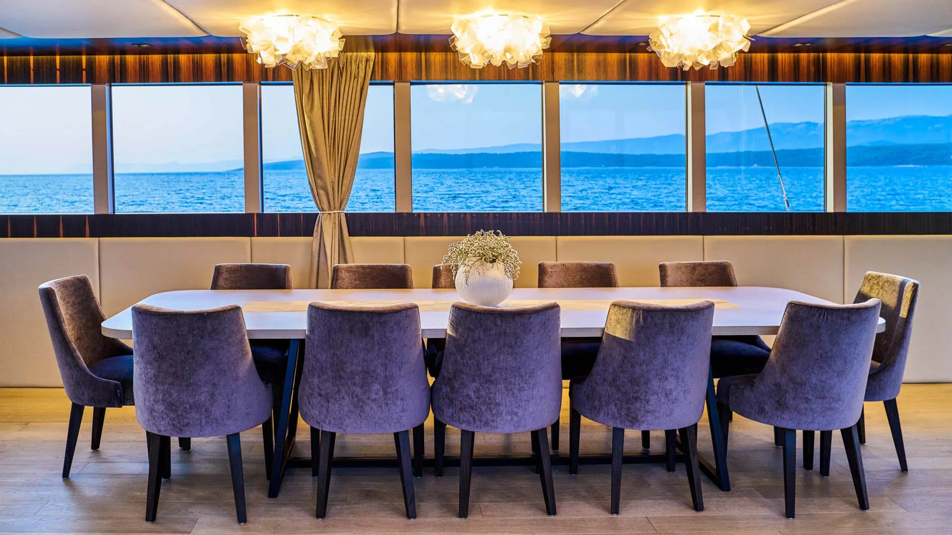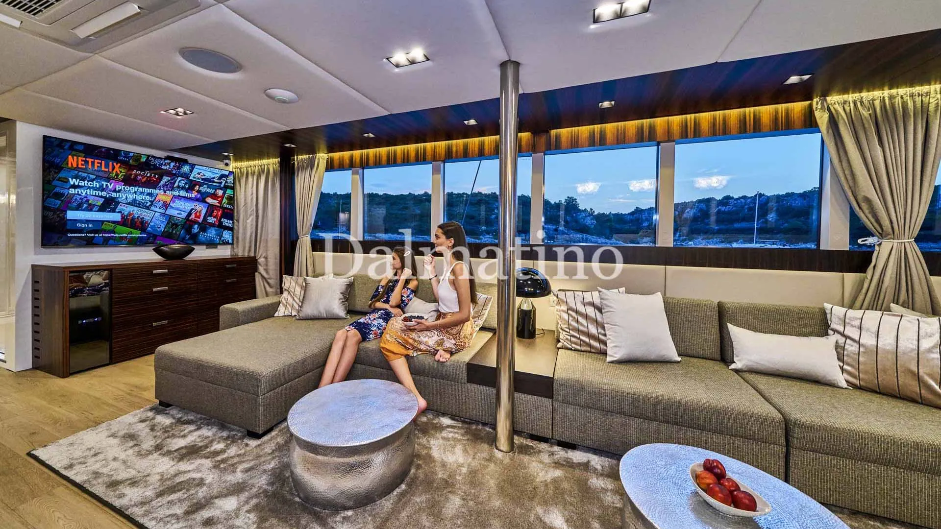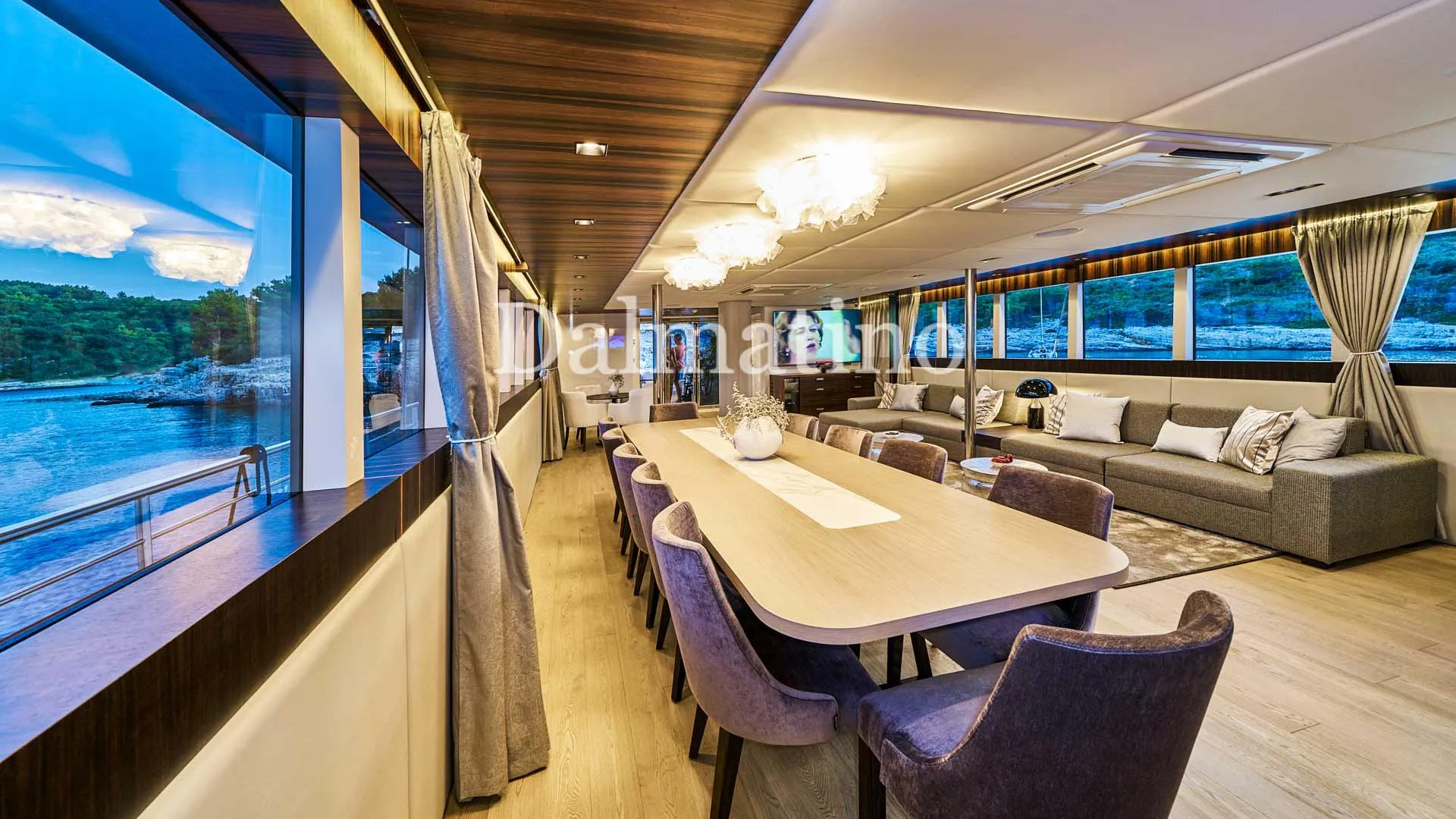 Drewniane podłogi, stylowe meble i luksusowe dekoracje tworzą przytulną atmosferę podczas pobytu na Dalmatino. Dodatkowo, wnętrze jest w pełni klimatyzowane. Przestronny główny salon tego luksusowego jachtu żaglowego oferuje piękny stół jadalny z barem oraz strefę wypoczynkową z telewizorem, odtwarzaczem DVD i USB. Ten popularny luksusowy jacht żaglowy pomieści do 12 gości w kabinach Master, VIP, 2 Double/Twin oraz 2 Twin/Double z możliwością konwersji. Kabina Master posiada wannę z masażem, a każda z nich wyposażona jest we wszystkie udogodnienia, takie jak szafa, Wi-Fi, telewizor, interkom oraz dostępna obsługa pokojowa. 8-osobowa załoga ma oddzielną strefę mieszkalną, aby zapewnić gościom pełną prywatność.