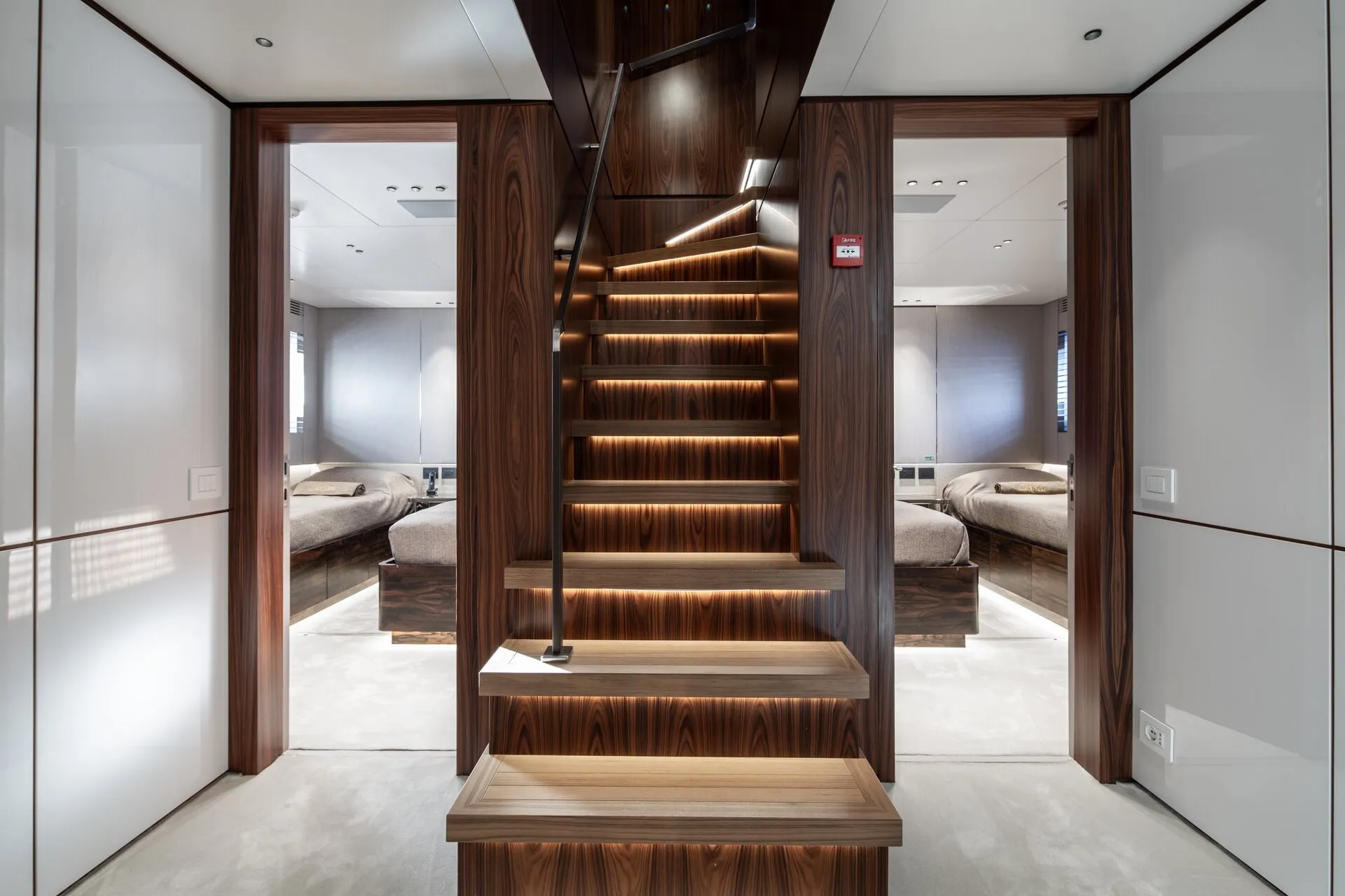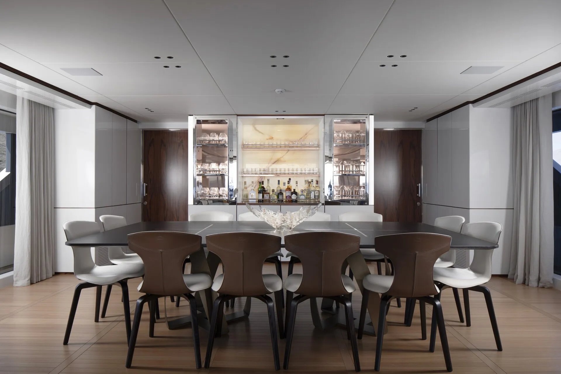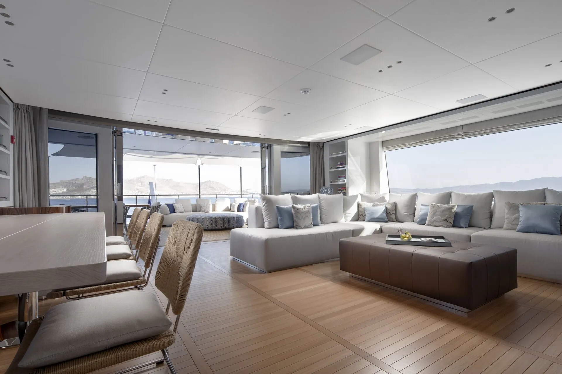Jej wyrafinowane wnętrze jest skąpane w naturalnym świetle, podkreślone przez główną kabinę Master Suite na głównym pokładzie o pełnej szerokości oraz towarzyską skylounge na górnym pokładzie. Elastyczny układ zakwaterowania tworzy przyjazną atmosferę dla maksymalnie 12 gości.