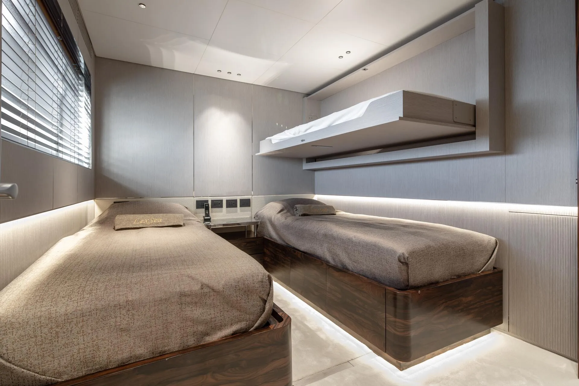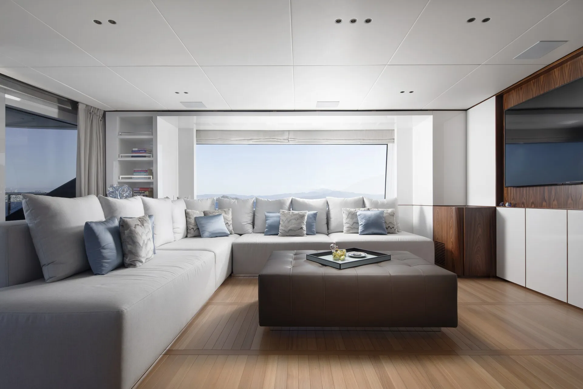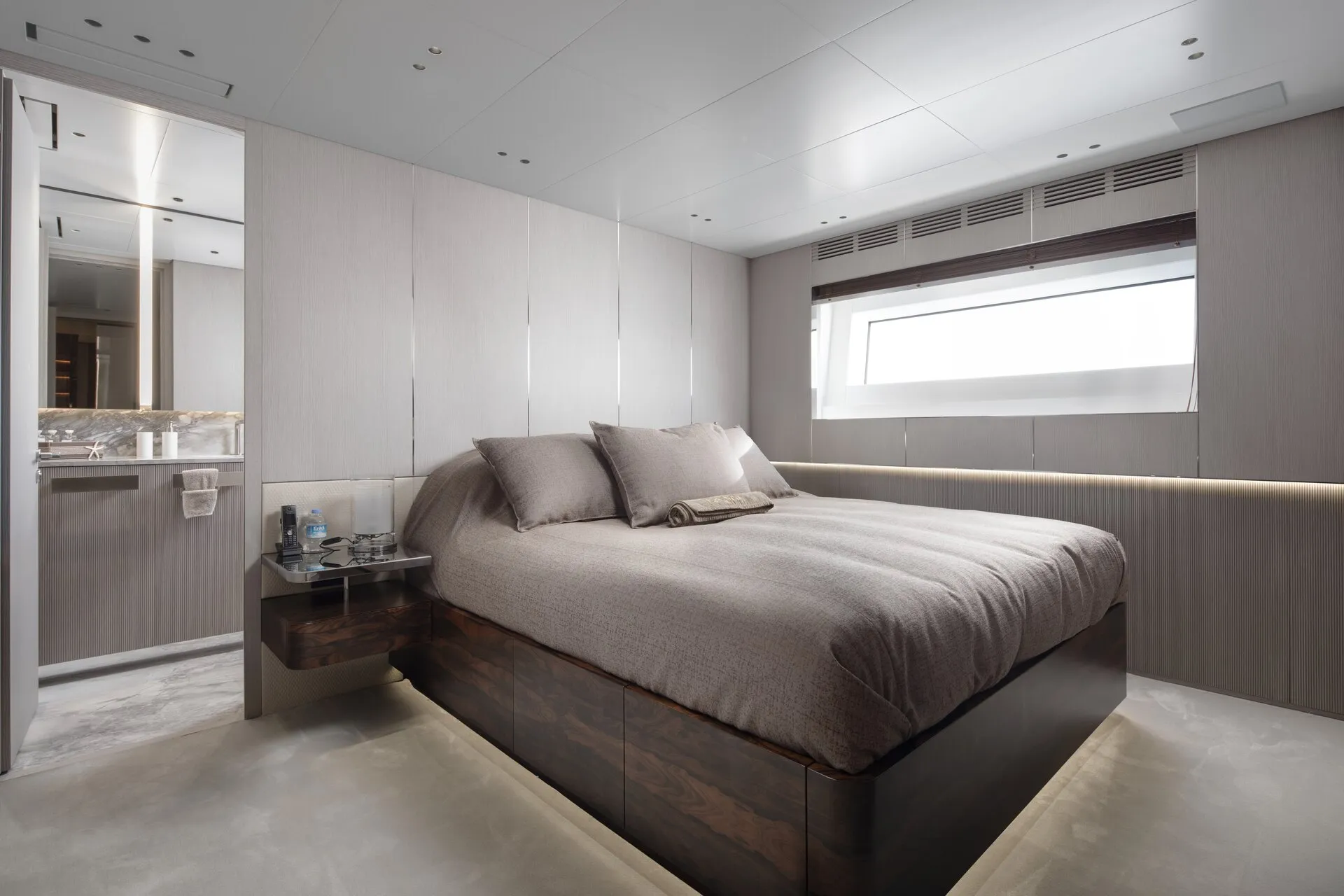 Jej wyrafinowane wnętrze jest skąpane w naturalnym świetle, podkreślone przez główną kabinę Master Suite na głównym pokładzie o pełnej szerokości oraz towarzyską skylounge na górnym pokładzie. Elastyczny układ zakwaterowania tworzy przyjazną atmosferę dla maksymalnie 12 gości.