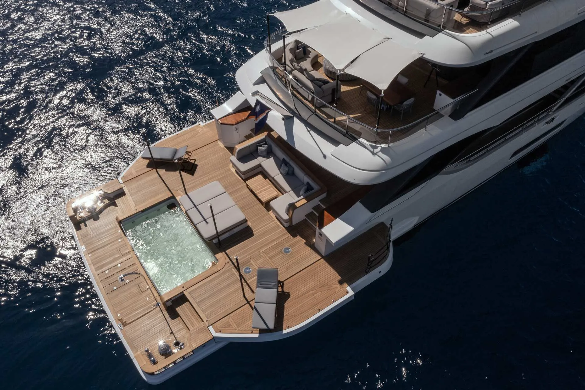 Jacht posiada oszałamiający „Oasis Deck” z przeszklonym basenem infinity i składanymi bocznymi tarasami, które powiększają obszar klubu plażowego. Goście mogą cieszyć się rozległymi przestrzeniami na świeżym powietrzu, w tym pokładem słonecznym z barem i jadalnią oraz przednim salonem do opalania.
