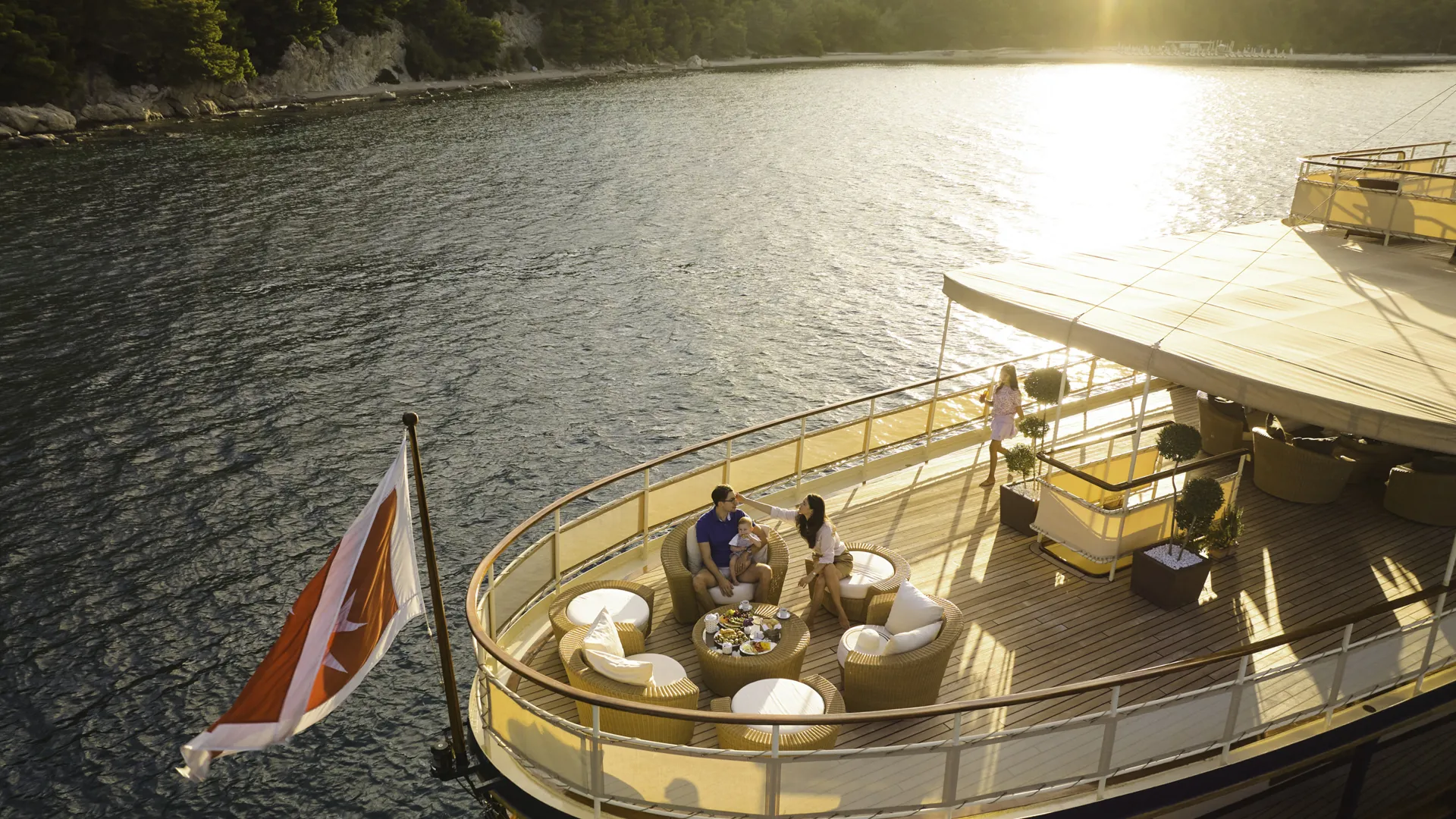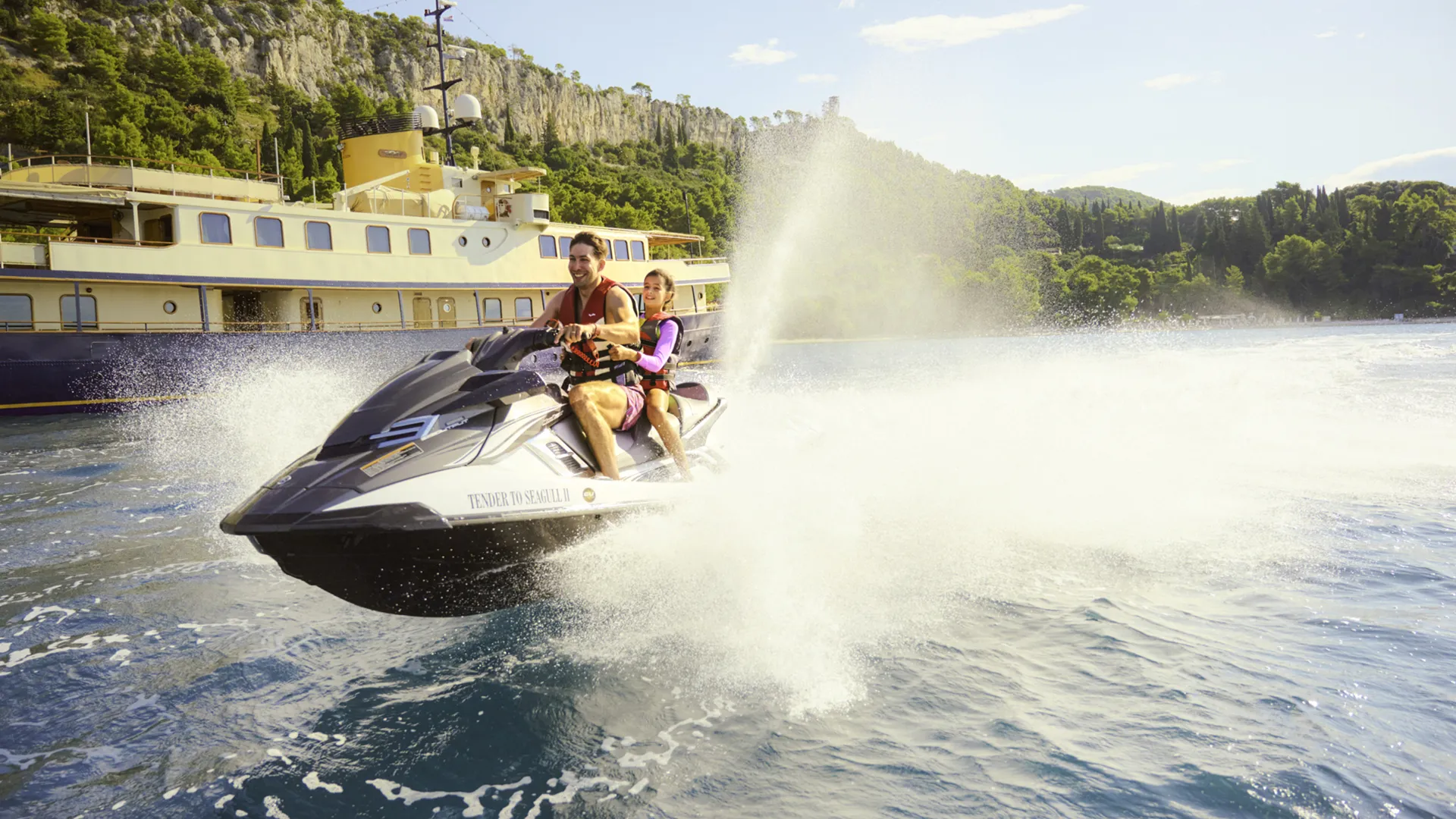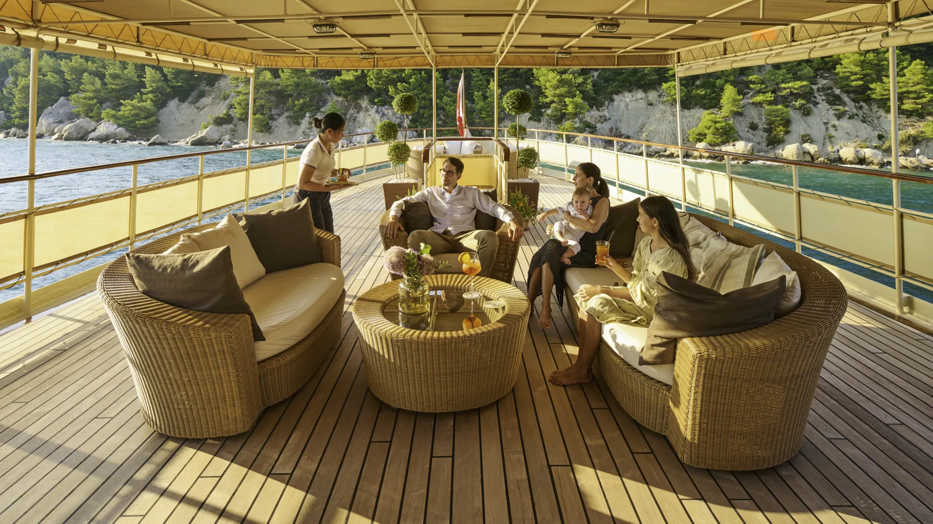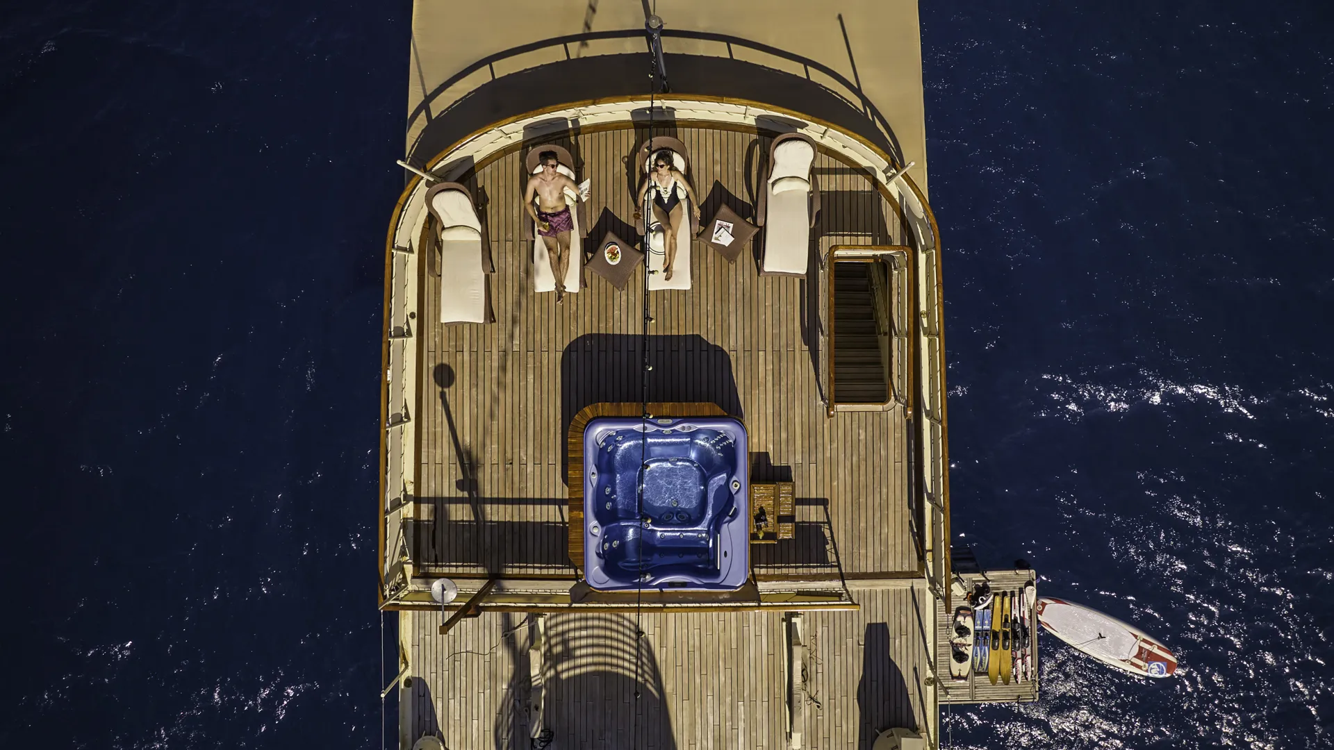 Obszerna przestrzeń na pokładzie oferuje mnóstwo miejsc do opalania i zacienionych obszarów. Oprócz wygodnych miejsc do spożywania posiłków w klasycznym stylu, goście mogą korzystać z licznych stref wypoczynkowych, w tym z jacuzzi na pokładzie – ulubionego miejsca do relaksu. Przede wszystkim, platforma kąpielowa Seagull II zapewnia łatwy dostęp do morza oraz możliwość korzystania z licznych zabawek wodnych.