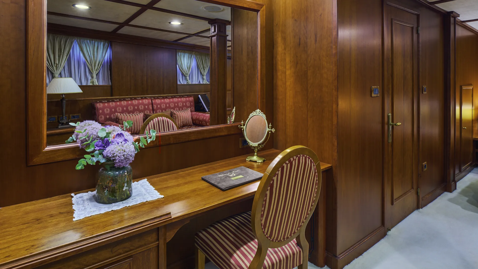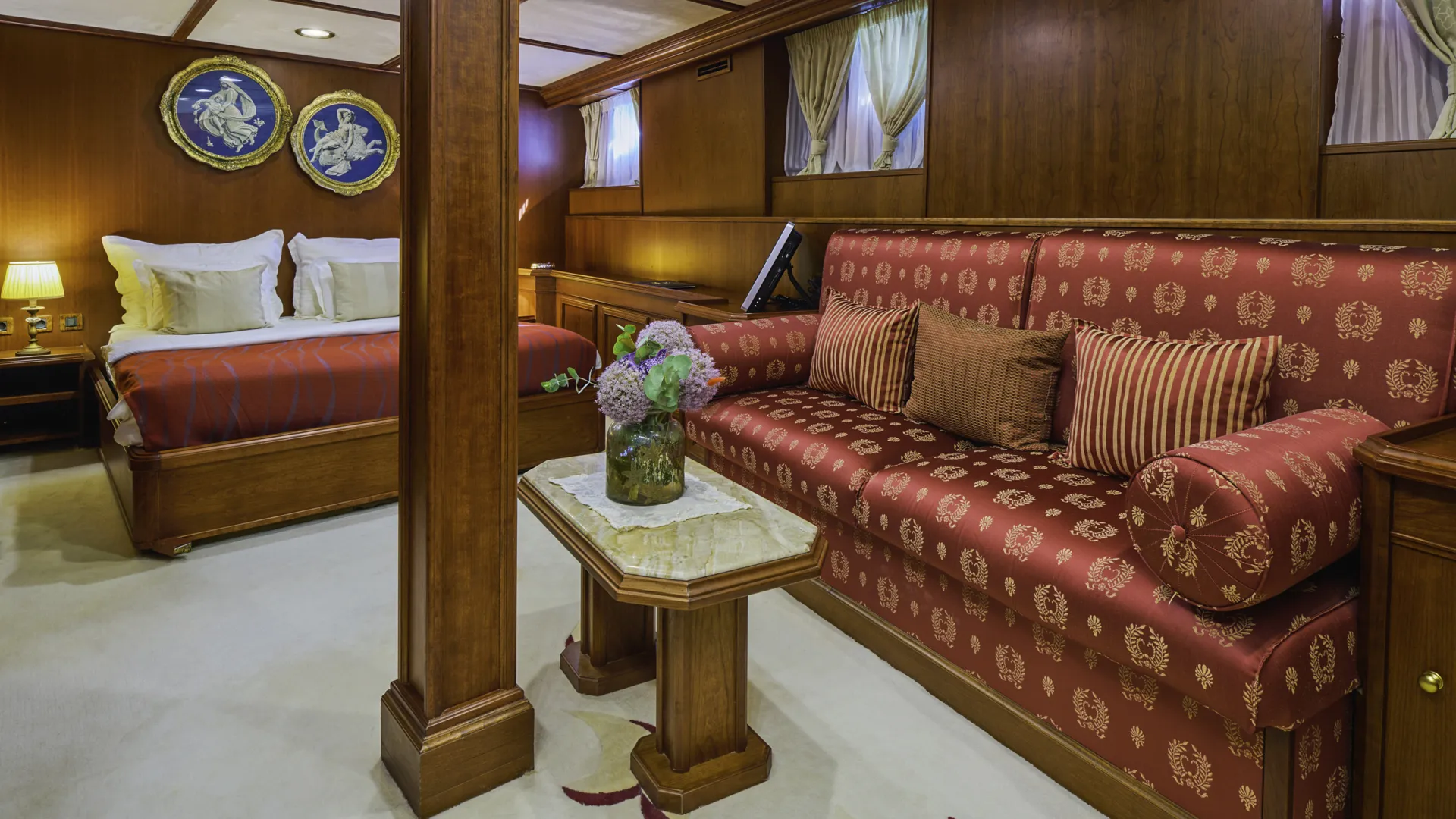 Jednym z godnych uwagi elementów jest kolekcja trzech salonów dla gości oraz salon właściciela, połączone elegancką spiralną drewnianą klatką schodową. Na dolnym pokładzie, apartament główny oferuje dwie przestronne kabiny typu Queen. Ponadto, trzy dodatkowe kabiny znajdujące się na tym samym pokładzie dopełniają układ. Wreszcie, jej 80-metrowy apartament VIP na głównym pokładzie oferuje najwyższy luksus i prywatność.