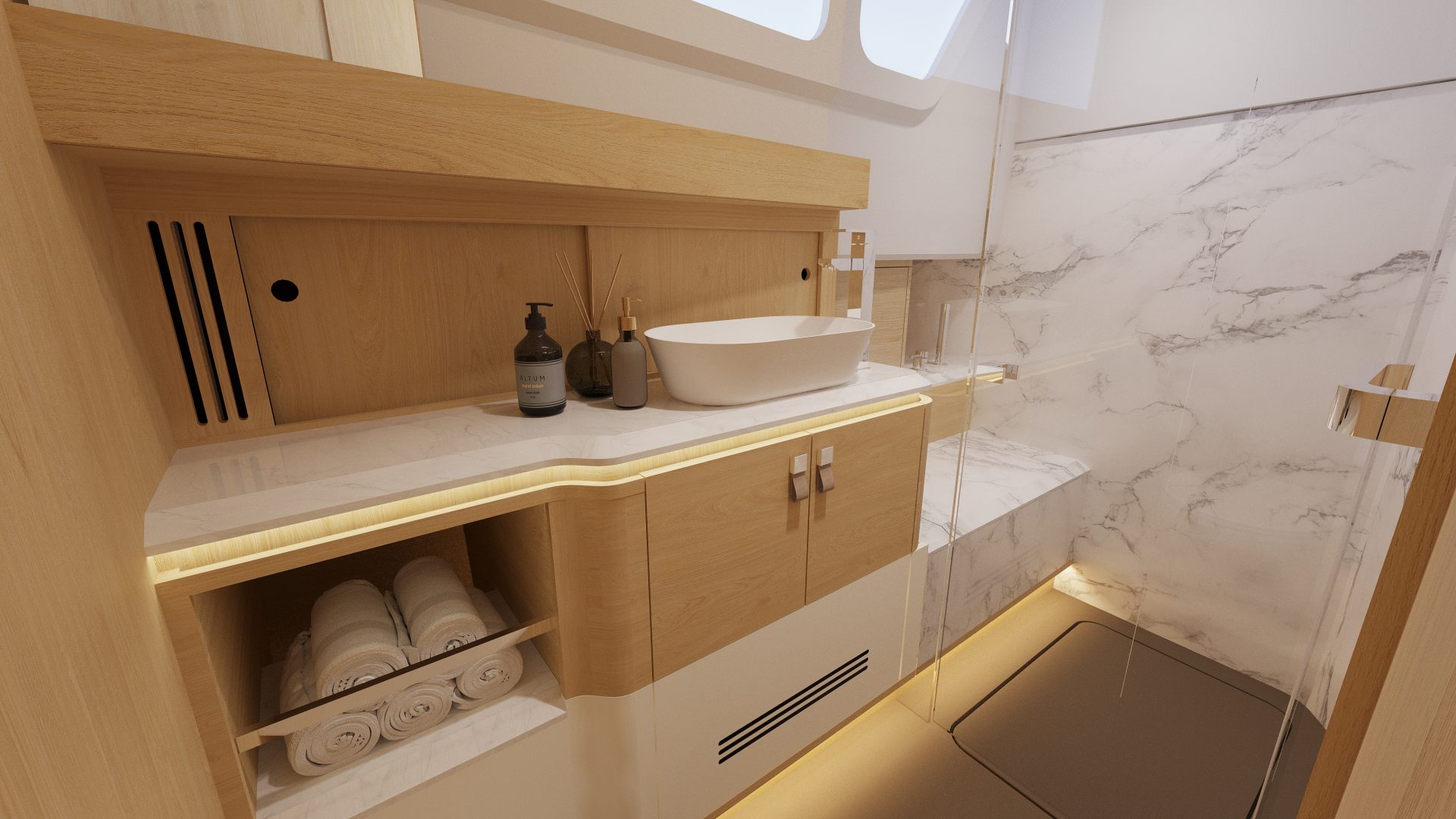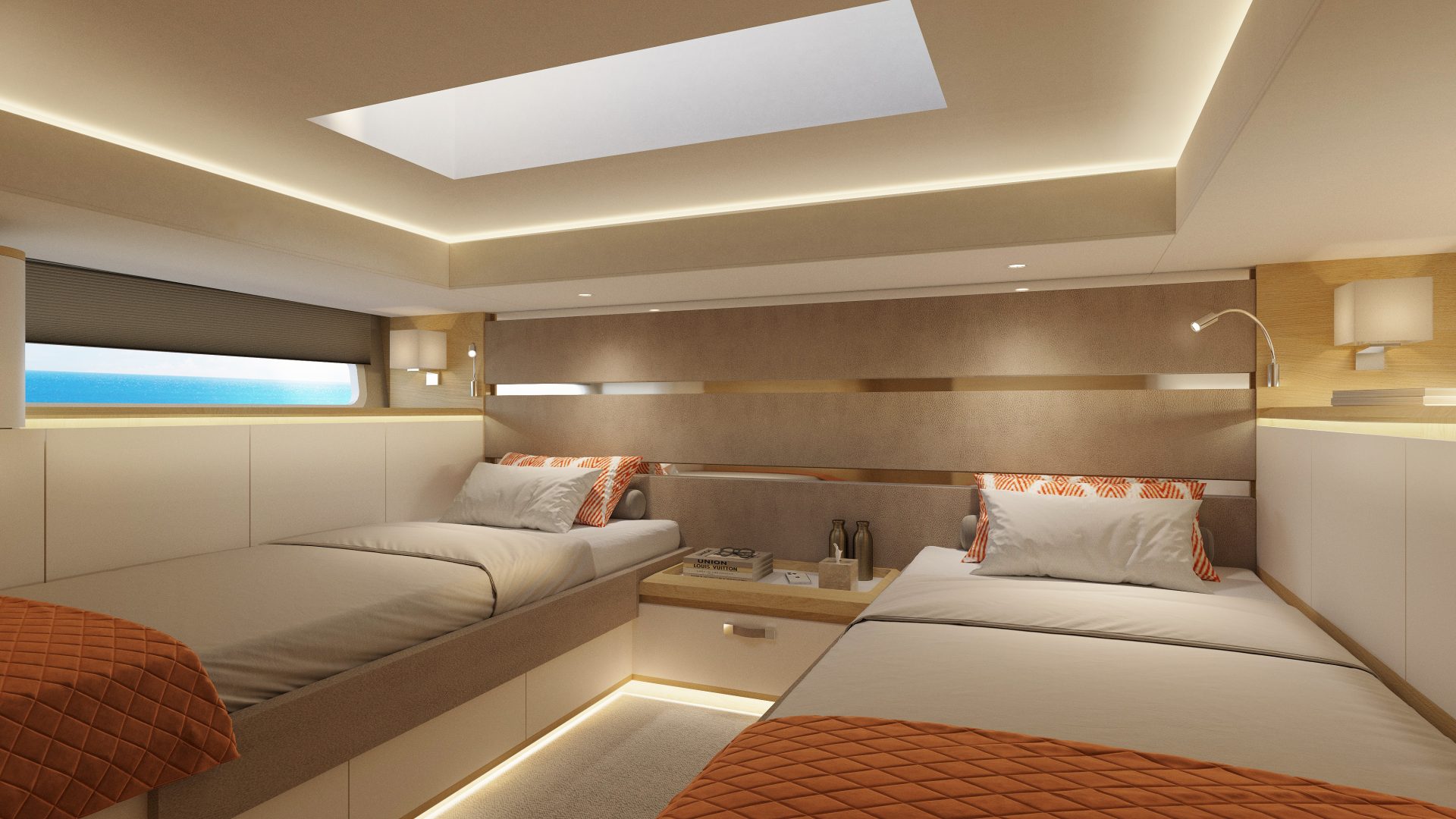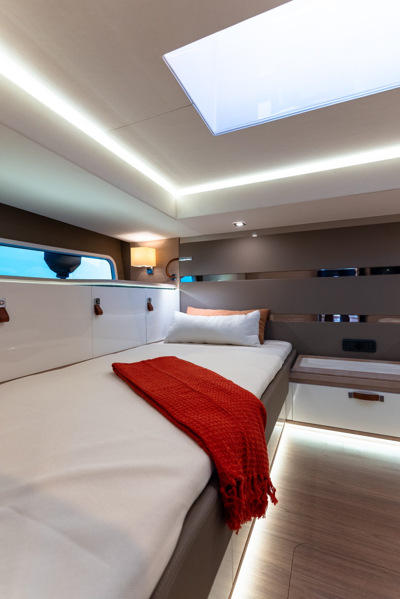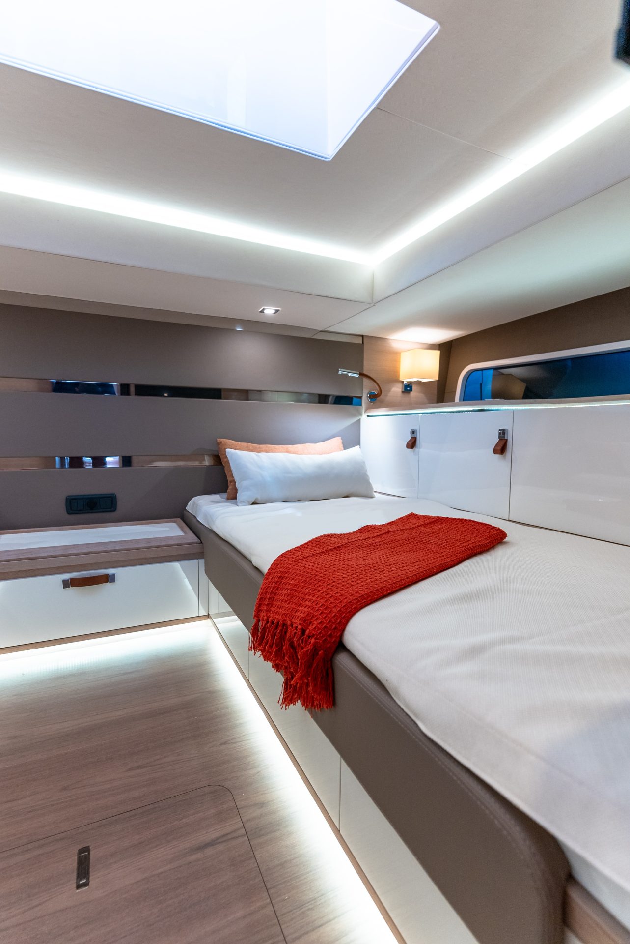 Poniżej pokładu, Level 43 ST oferuje wyrafinowane wnętrze z wyborem jasnych, organicznych gatunków drewna dla jasnego, współczesnego wyglądu lub ciemniejszych wykończeń dla cieplejszej, bardziej luksusowej atmosfery, dostępnych w półpołysku lub pełnym połysku. Właściciele mogą harmonizować detale drewniane z kolorami kadłuba i tapicerki, aby stworzyć naprawdę spersonalizowany wygląd. Elastyczne układy kabin, w tym opcje z dwoma pojedynczymi kojami, podwójnym łóżkiem z dodatkową sofą do spania, lub otwartą strefą rufową na dodatkowe przechowywanie, pozwalają 43 ST dostosować się do różnych stylów rejsów, od jednodniowych wypadów z przyjaciółmi po luksusowe, długoweekendowe ucieczki.