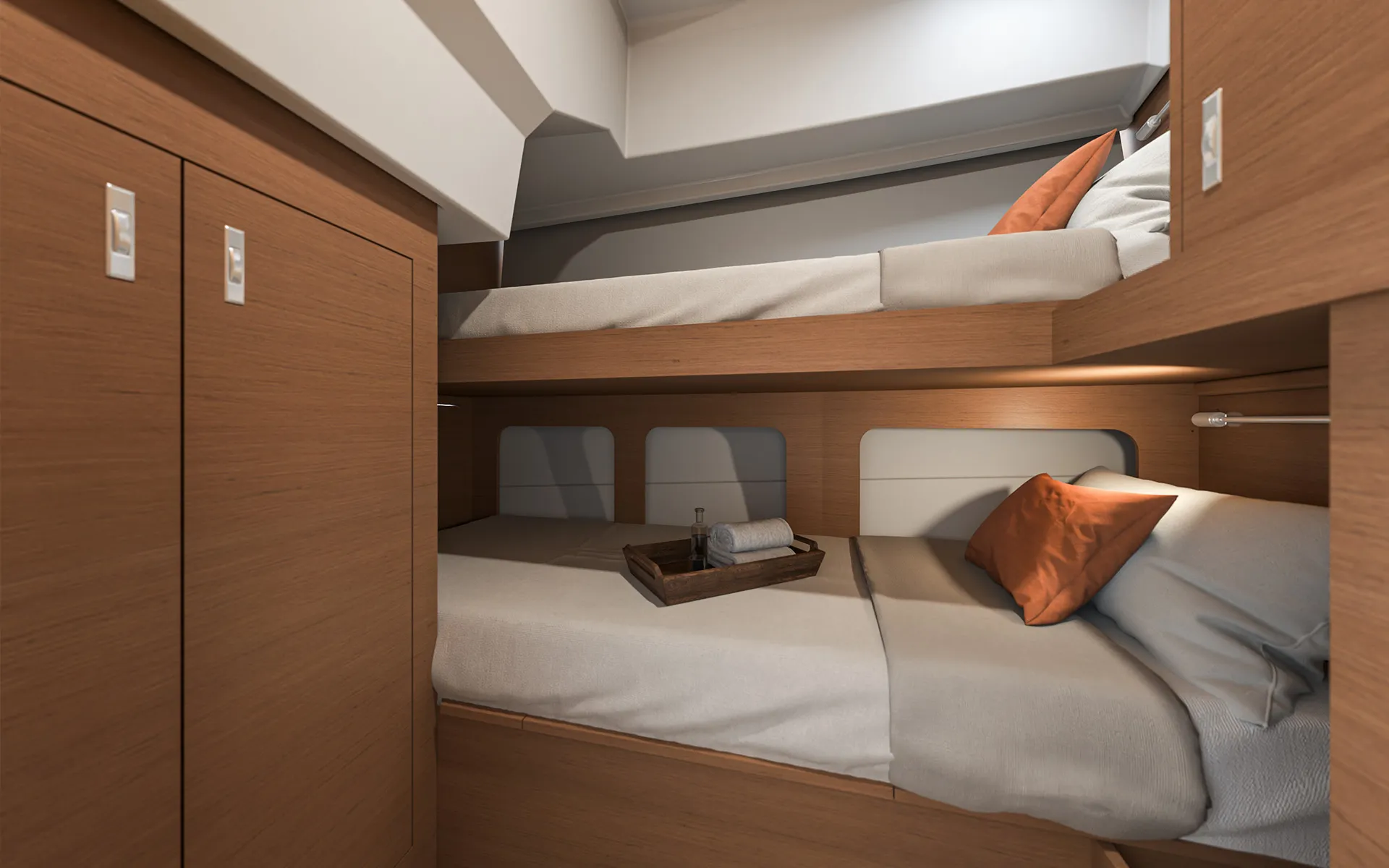 Vo vnútri sa Swift Trawler 37 Sedan zameriava na veľkorysé, praktické obytné priestory pre dlhšie plavby. Kuchyňa v tvare U s možnosťou veľkej chladničky a mrazničky a bohatým úložným priestorom slúži širokej pohovke v tvare U, ktorá pojme šesť osôb a rýchlo sa premení na dvojlôžko so závesom na súkromie. Vpredu, zvýšené sedadlo na ľavej strane pre diaľkové plavby obsahuje inteligentný výklopný stôl na vytvorenie pohodlnej pracovnej stanice vedľa kormidlovne. Dole, majiteľská kajuta má prioritu s vlastnou kúpeľňou so samostatným sprchovacím kútom, doplnená pracovnými plochami z Corianu v kuchyni a kúpeľni a možnosťou dekoratívneho balíka Comfort Luxe na zvýšenie pohodlia na palube.