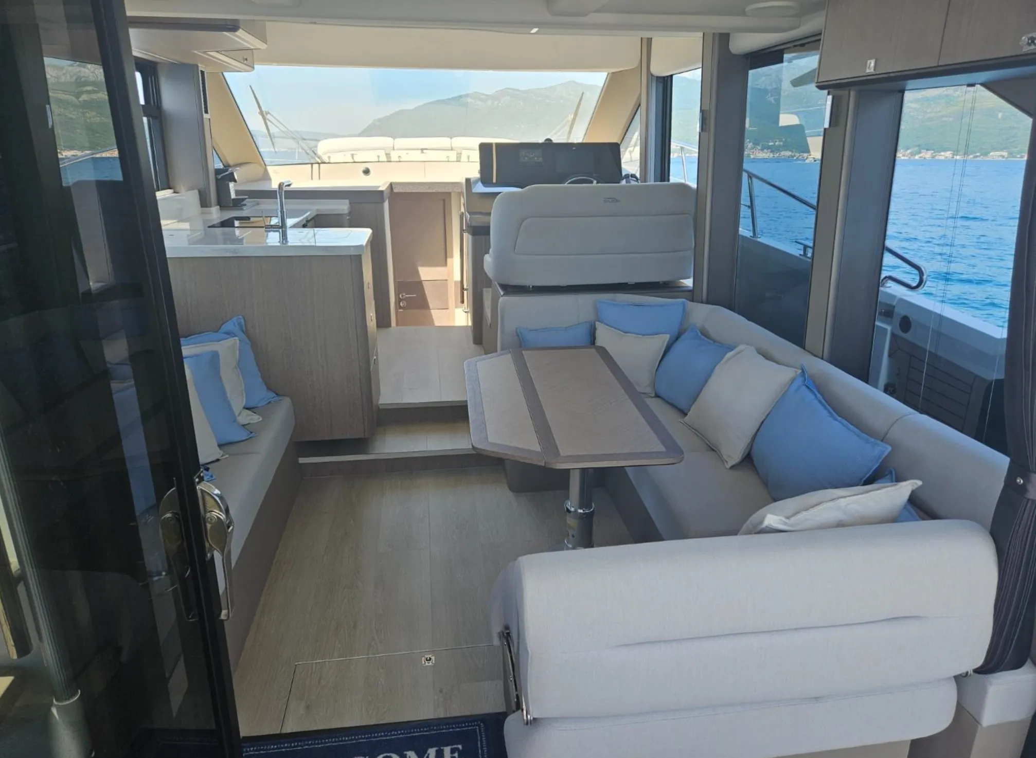 • Fully openable three segment entrance door and rotating aft saloon sofa