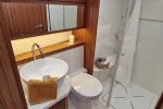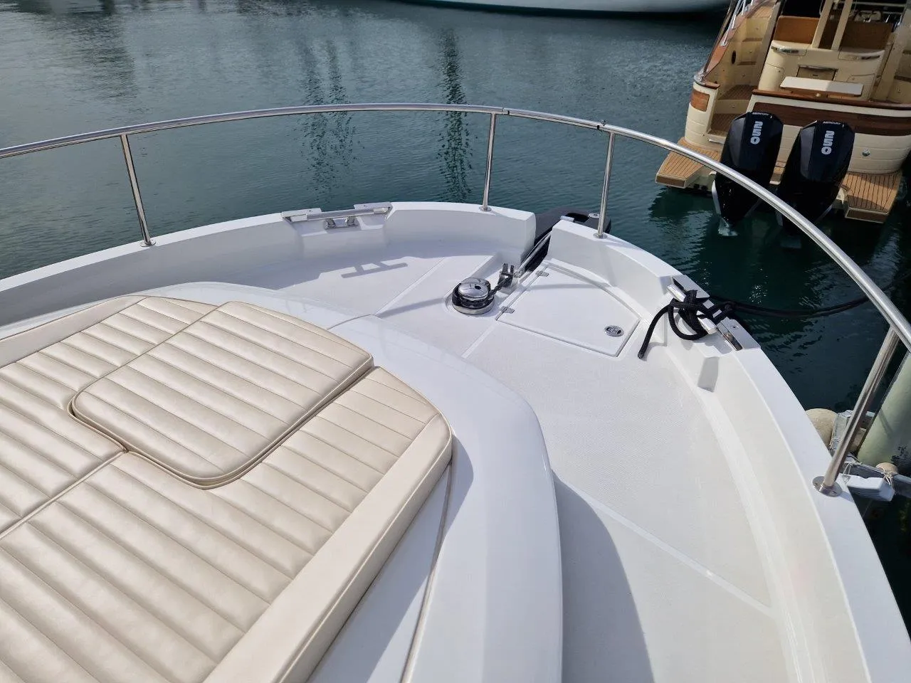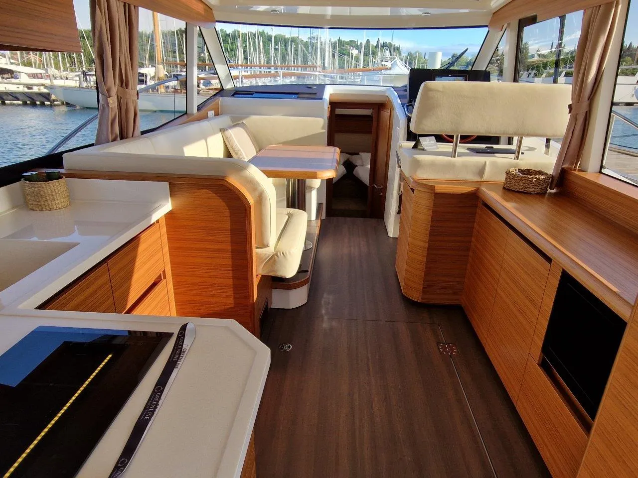 - Bow thruster, hot water system, anchor windlass, full-size fridge with freezer, induction stove